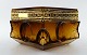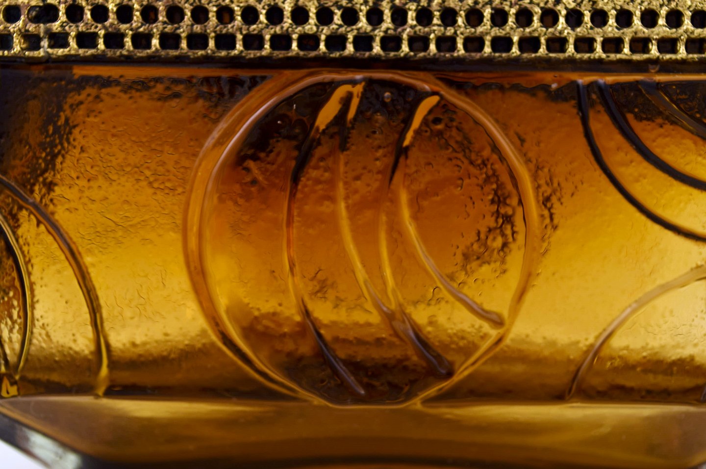 Smoky brown art glass vase with circular shapes on all sides of the vase and a patterned metal band, designed by Pentti Sarpaneva. The glass was manufactured at Oy Kumela and the matching bronze cylinder at Turun Hopea of Finland.