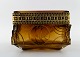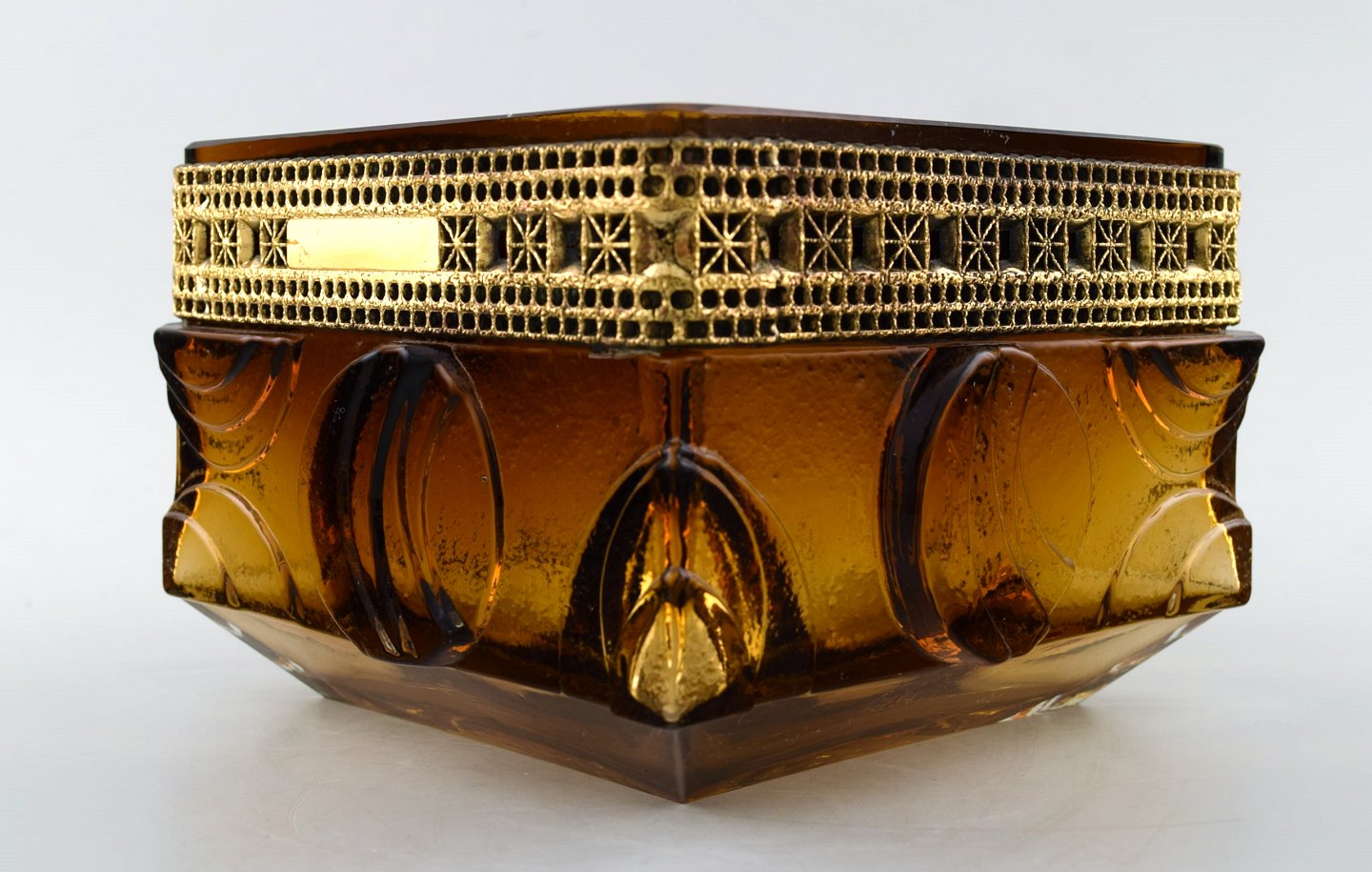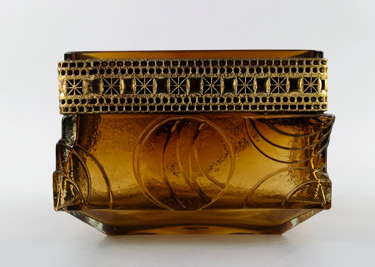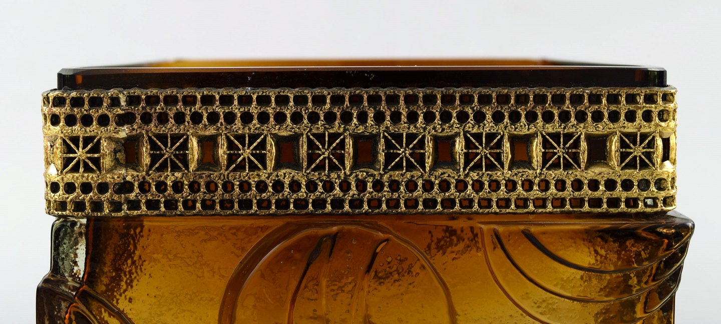 Pentti Sarpaneva, brother of the well known glass designer Timo Sarpaneva, was a designer mostly known for his beautiful jewelry. The metal band with a decorative cross pattern around the top of this glass vase is an example of his vast skills in metal working. It shows his distinctive style which can also be seen in his jewelry.