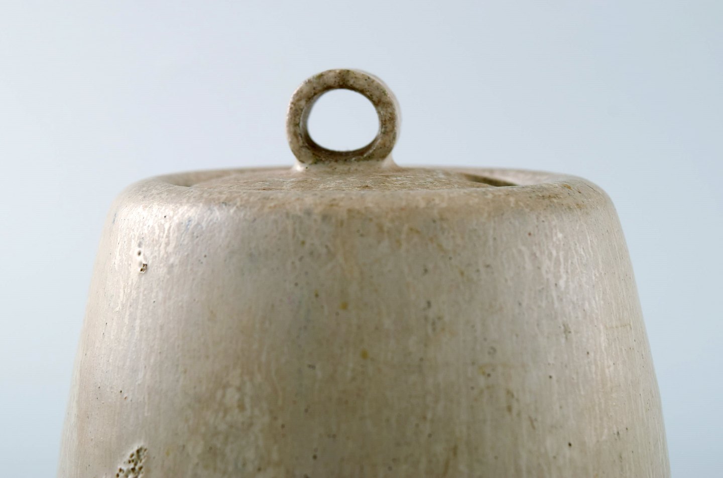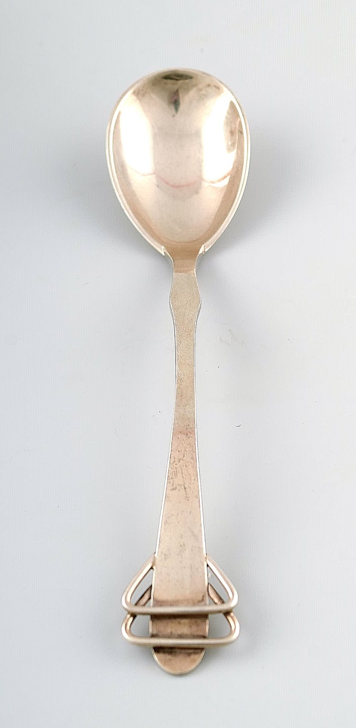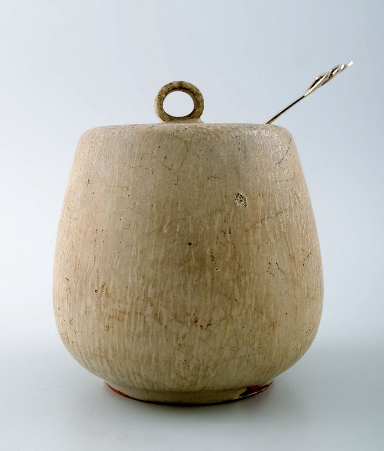 Arne Bang og Hans Hansen: Marmeladekrukke af stentøj, dekoreret med æggeskalsglasur. Modelnummer 18. Forsynet med låg og marmeladeske af sølv, Hans Hansen. Højde 10,5 cm. X 7,5 cm. I perfekt stand.