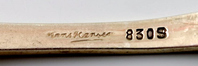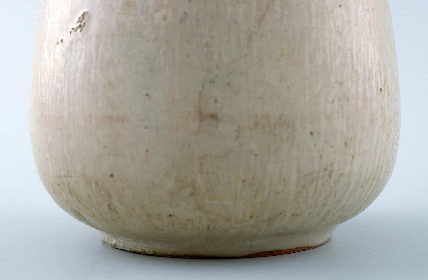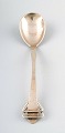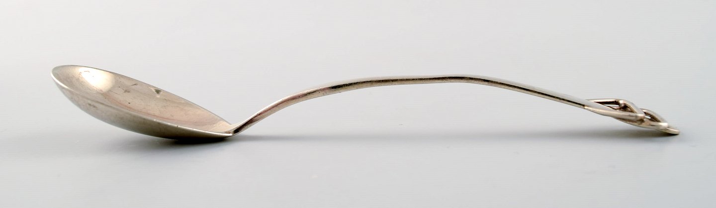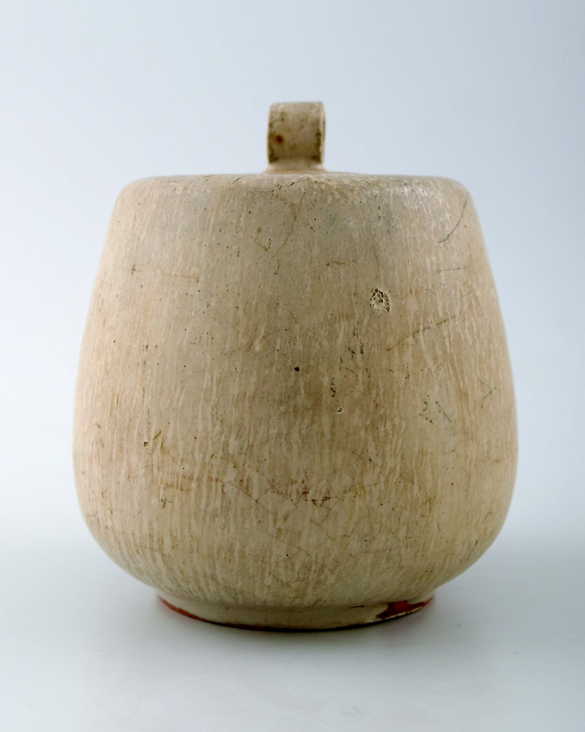 Arne Bang og Hans Hansen: Marmeladekrukke af stentøj, dekoreret med æggeskalsglasur. Modelnummer 18. Forsynet med låg og marmeladeske af sølv, Hans Hansen. Højde 10,5 cm. X 7,5 cm. I perfekt stand.