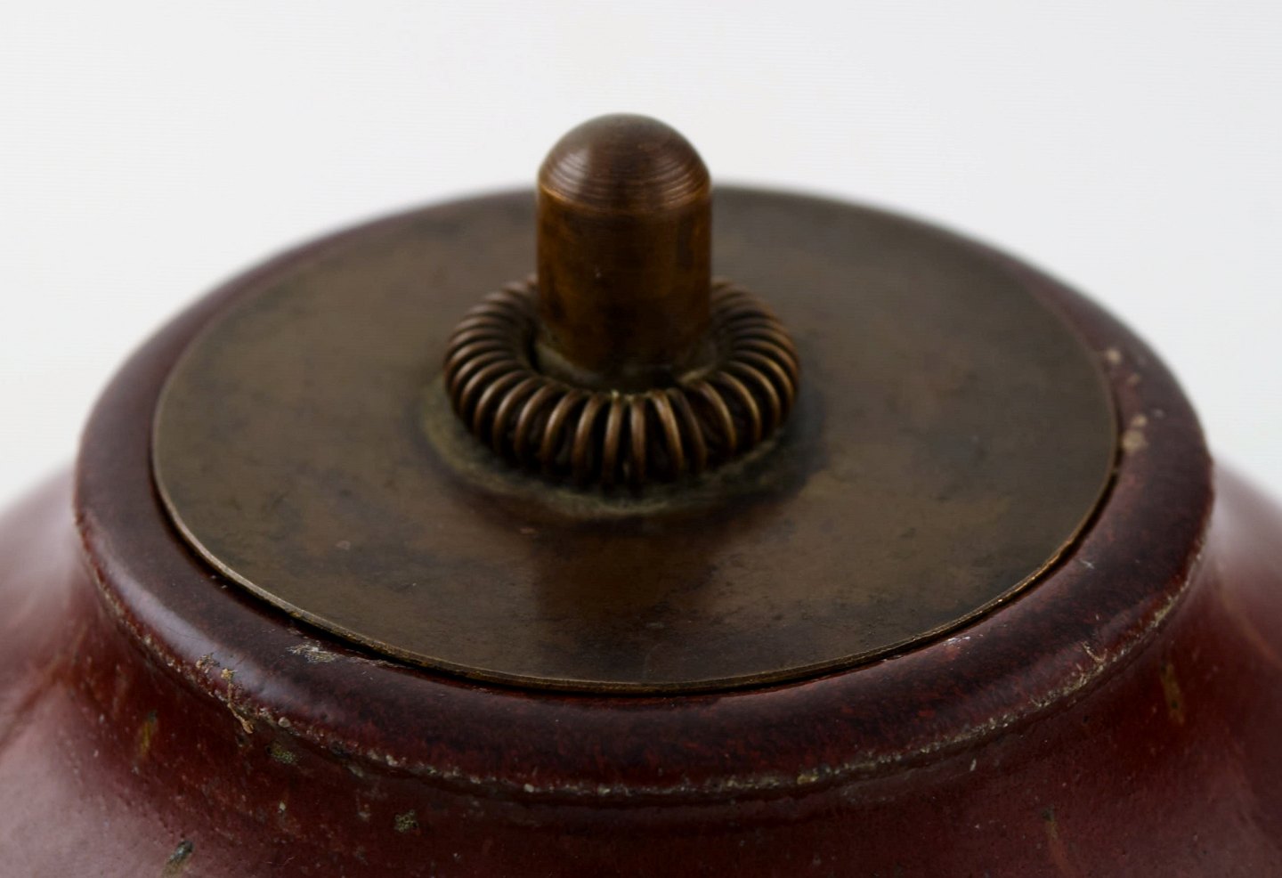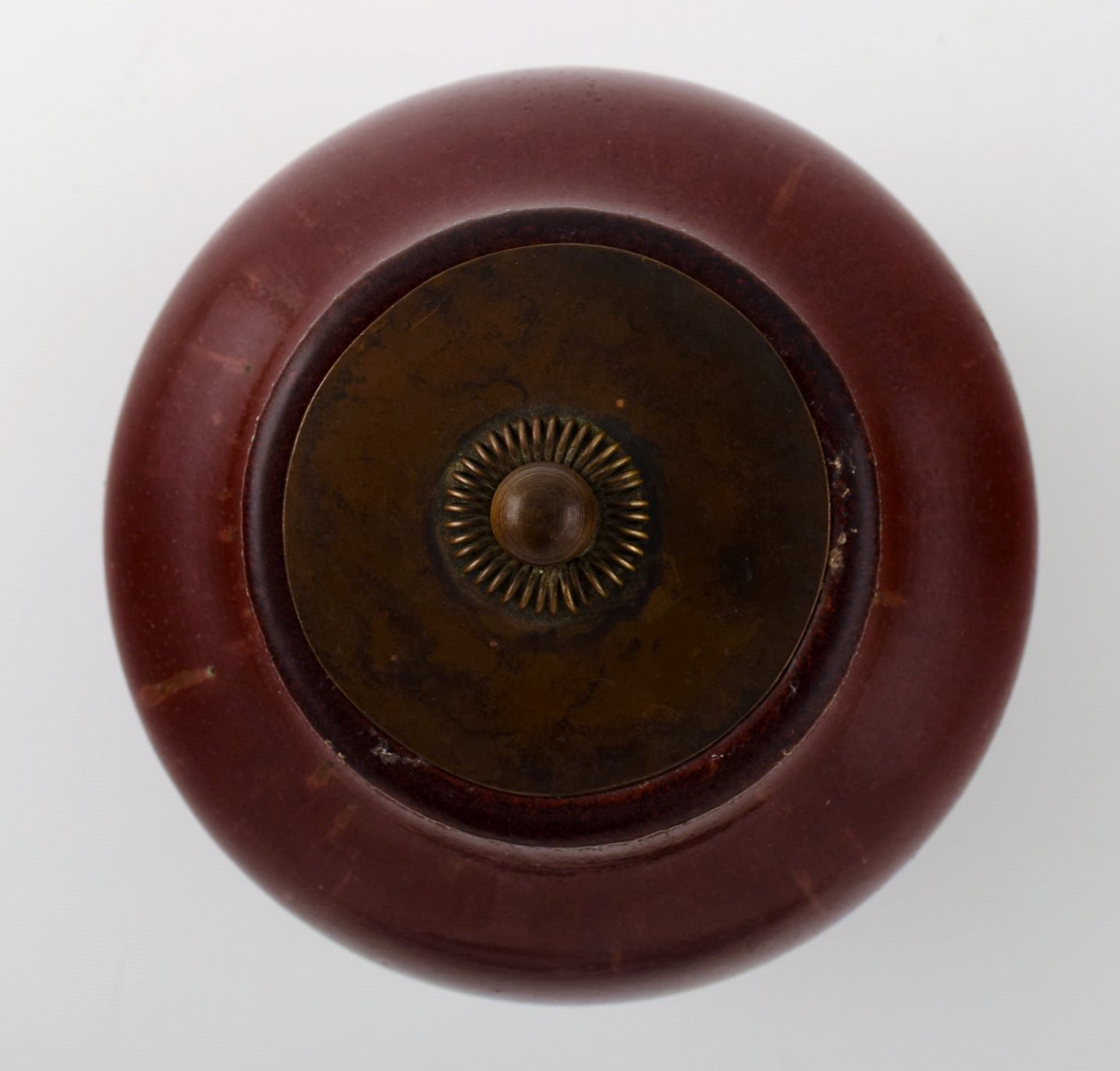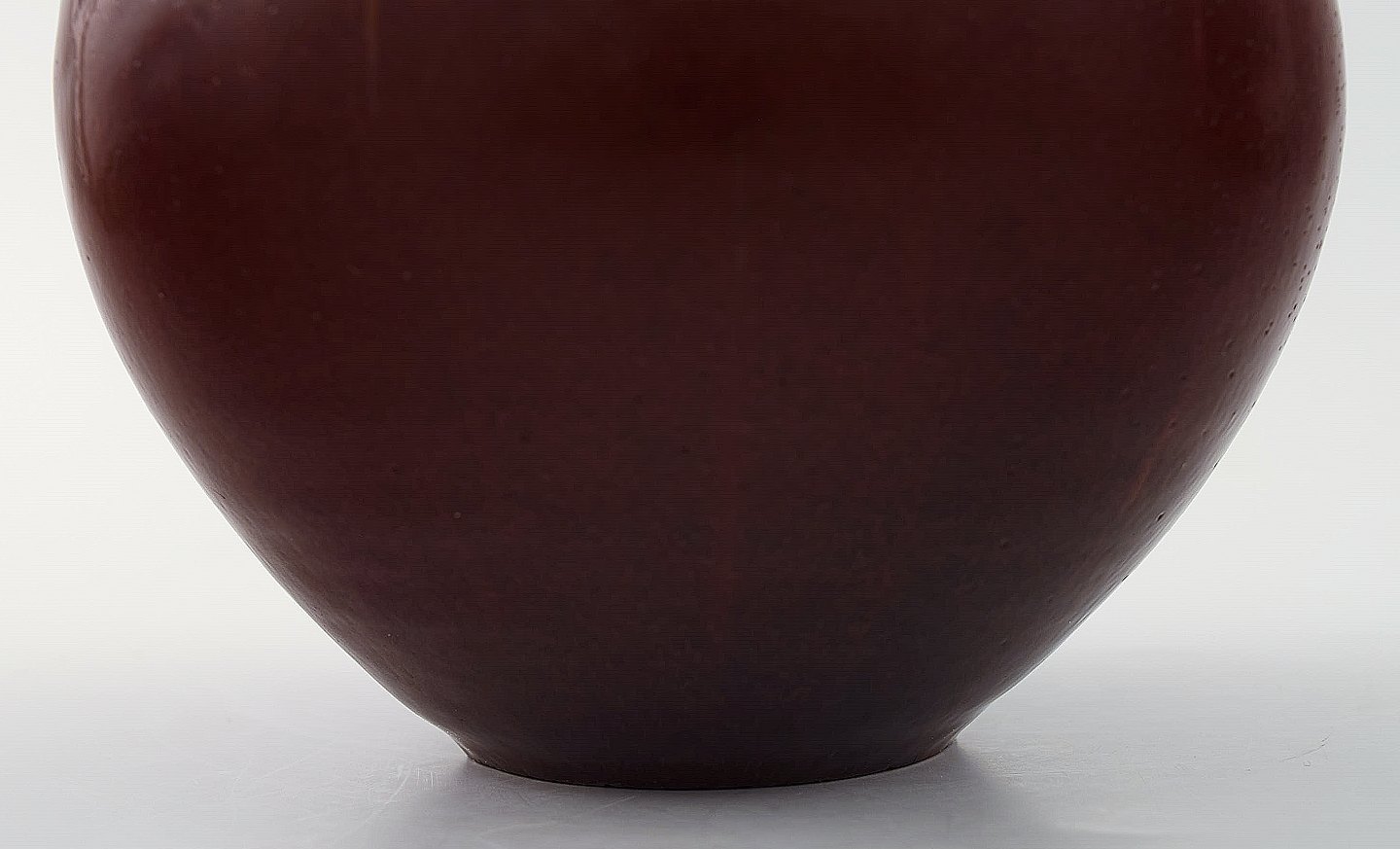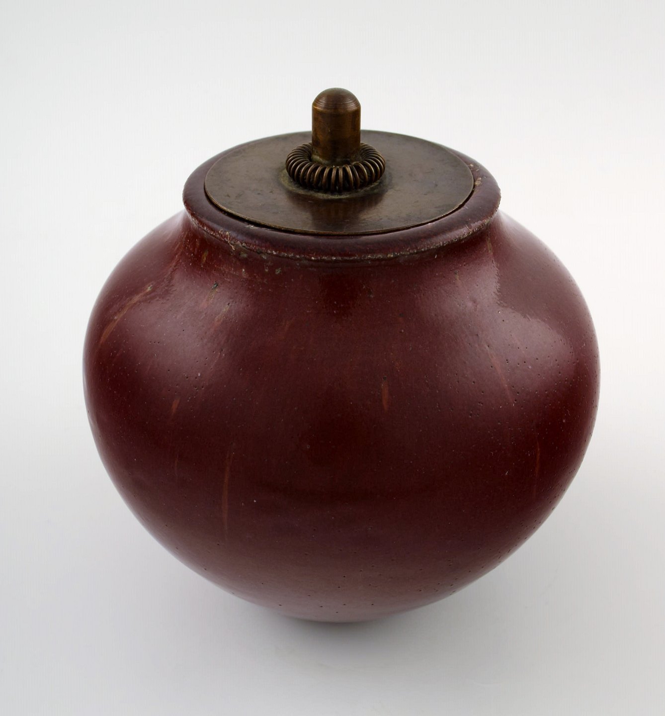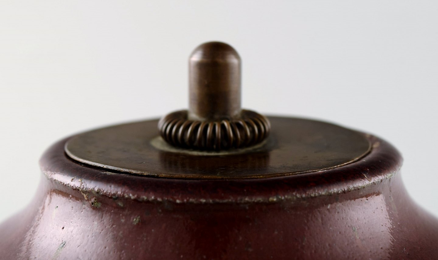 Royal Copenhagen Kresten Bloch okseblodsglasur stentøjsvase med bronzelåg. Stemplet, 1920´erne. I perfekt stand, 1. sortering. Måler : 15 x 14,5 cm.