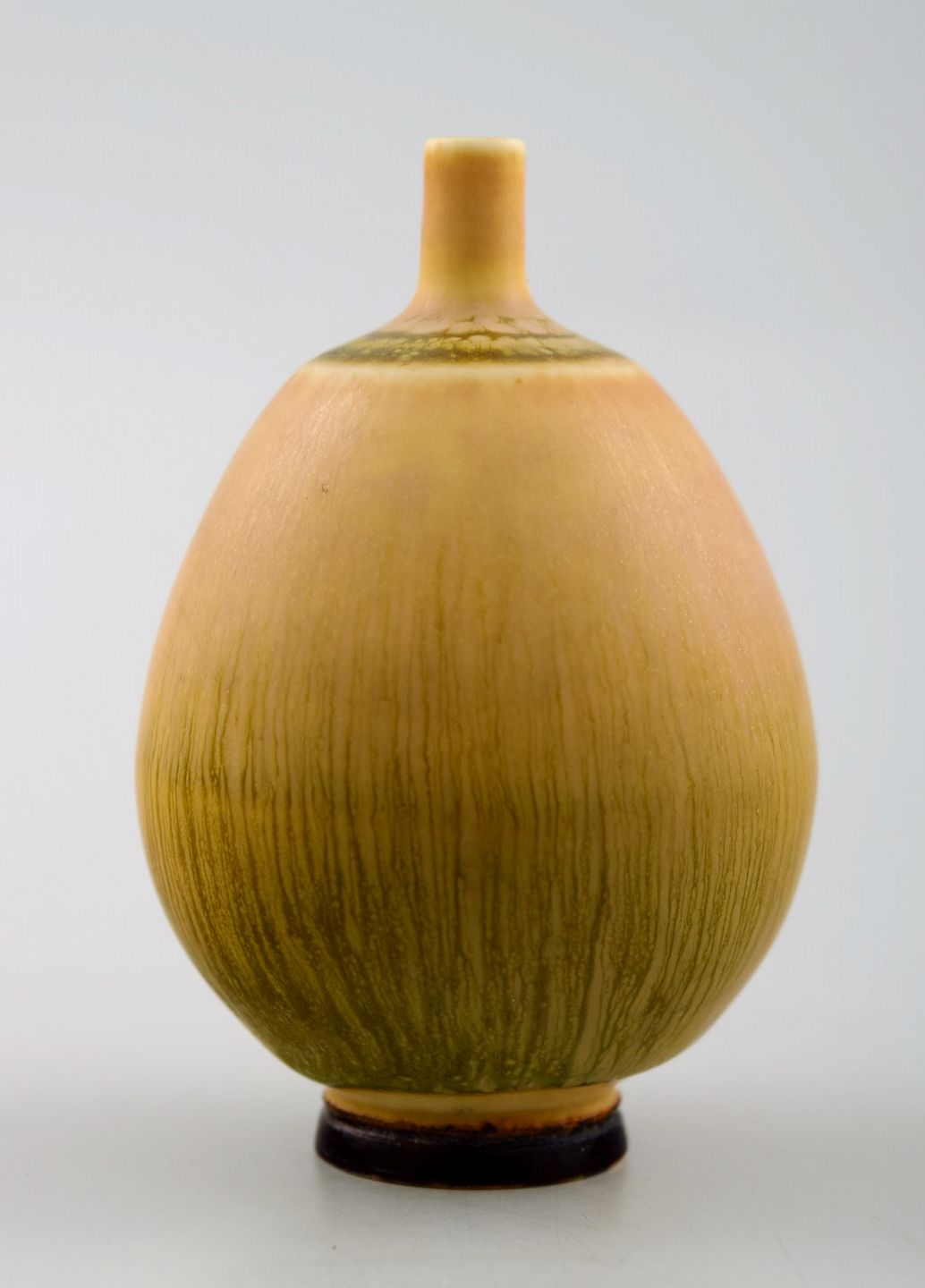 Berndt Friberg Studio ceramic vase. Modern Swedish design. Unique, handmade. Beautiful glaze in yellow shades. Perfect condition. 1st. factory quality. Measures: 5,8 x 4,3 cm.
