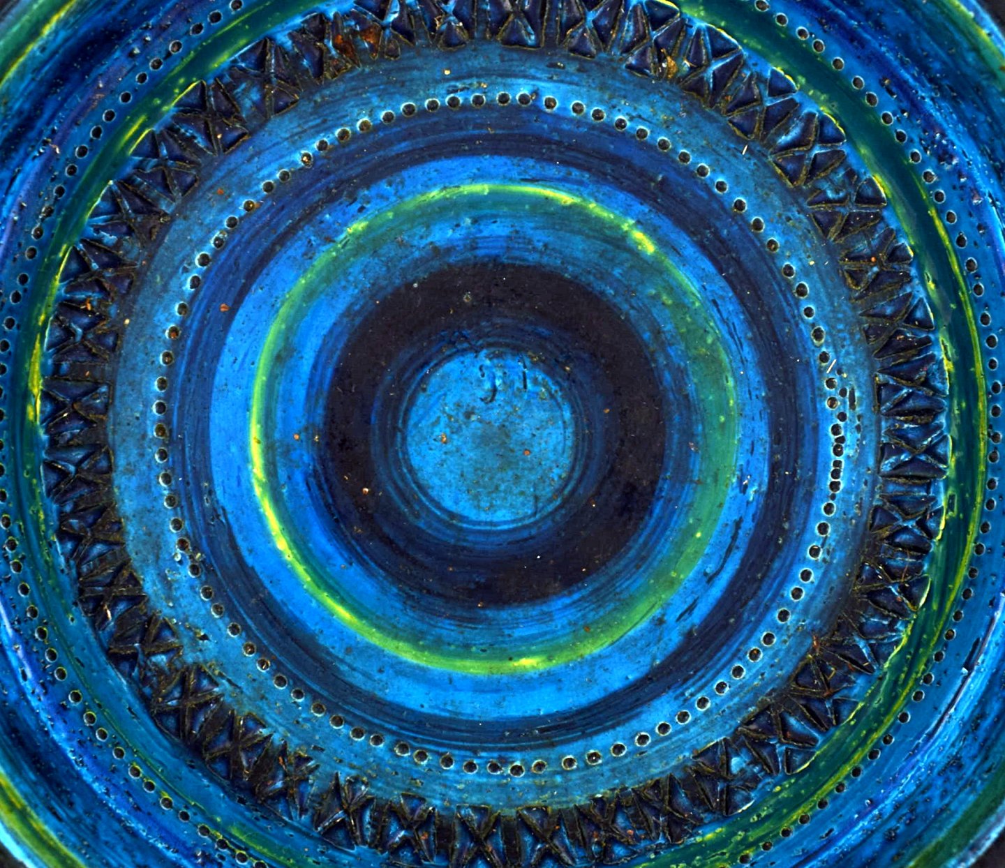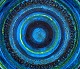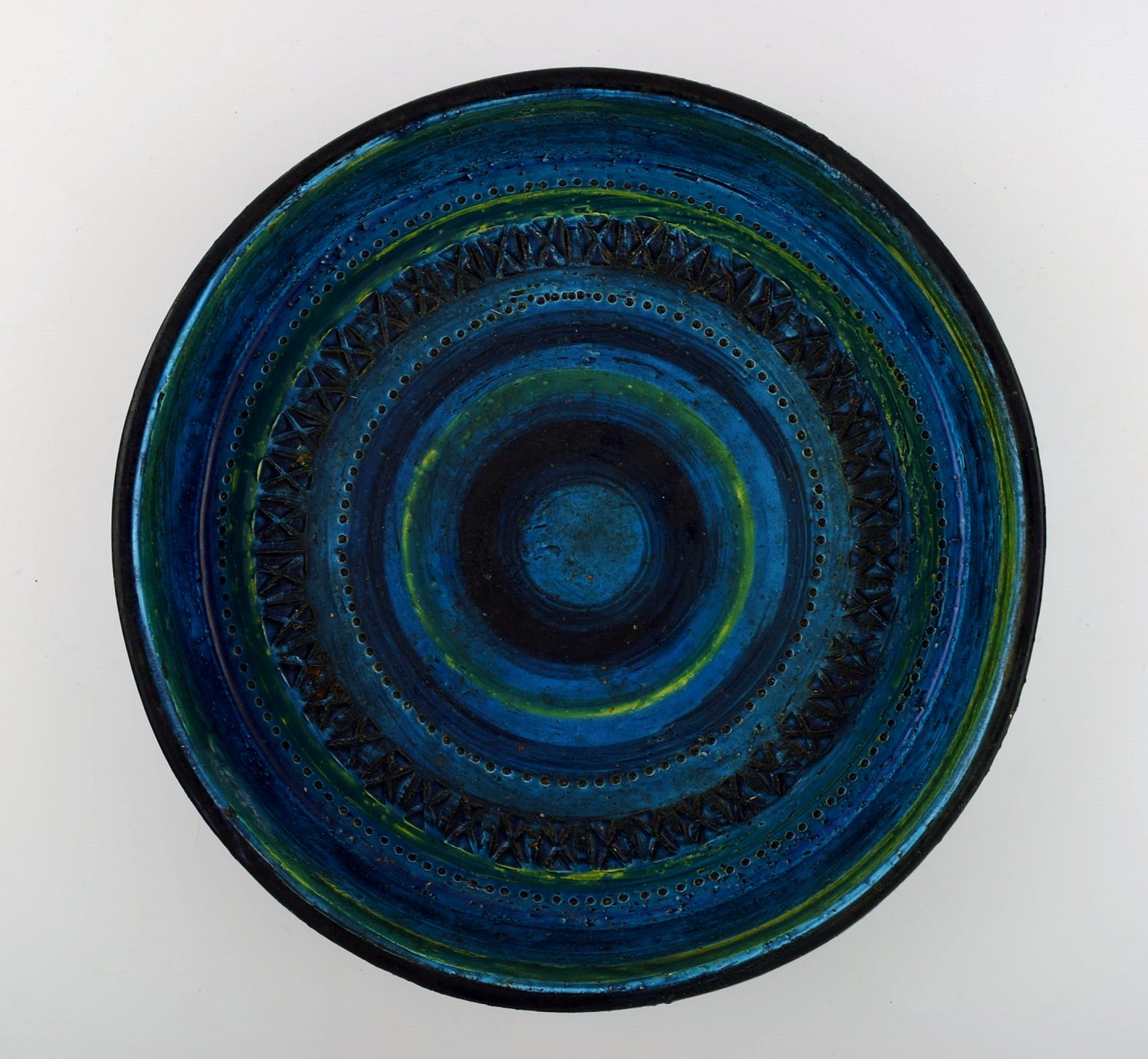Bitossi, Rimini blue dish bowl in ceramics, designed by Aldo Londi. Stamped. 1960s. Measures 28 cm. X 7 cm. In perfect condition.