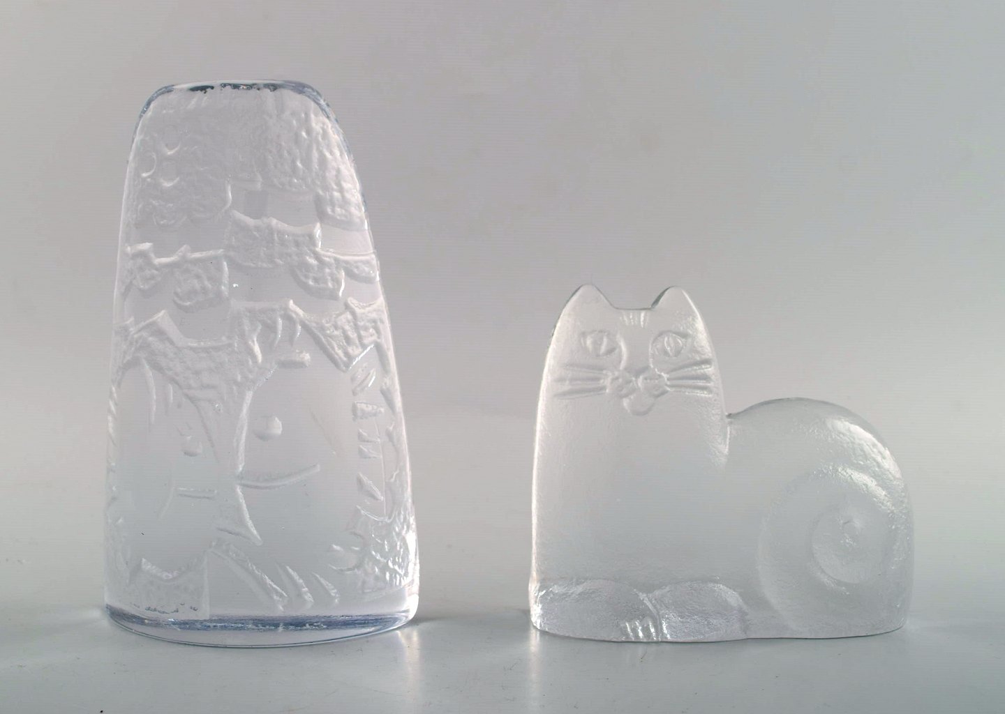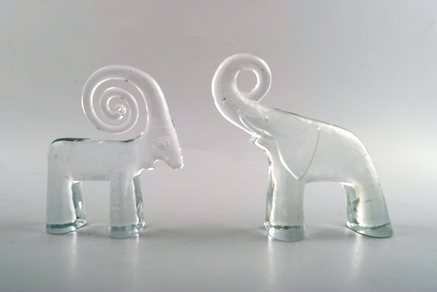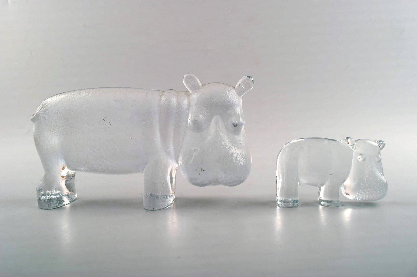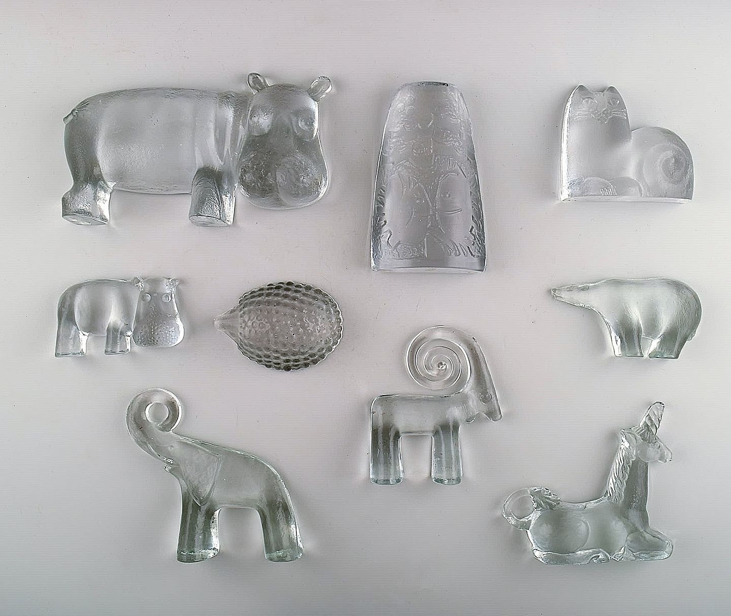 BENGT EDENFALK for SKRUF, Swedish Art Glass. Collection of nine art glass figures in the form of hippos, elephant, hedgehog, cat, polar bear etc. Largest measures: 23 cm. X 12 cm. Stamped. In perfect condition.