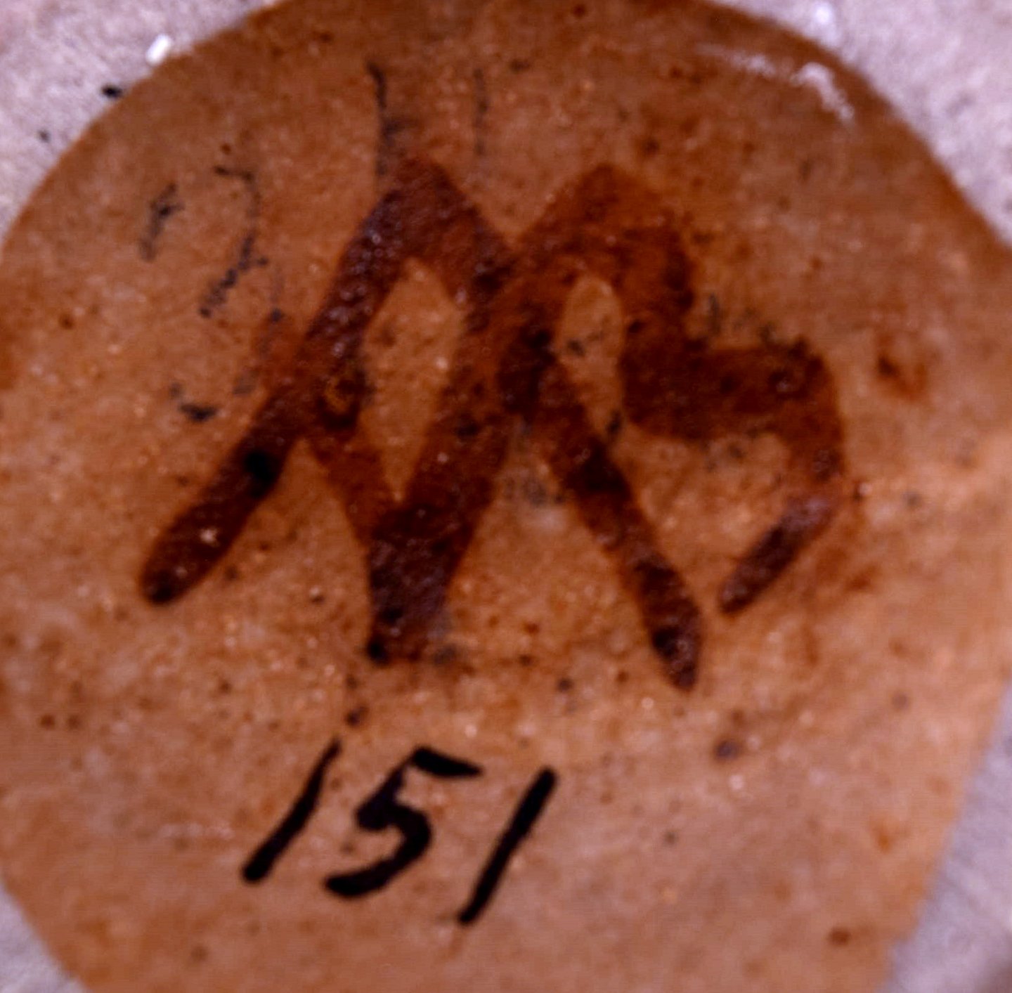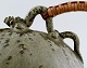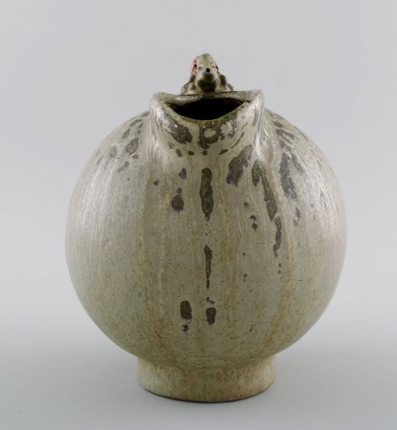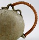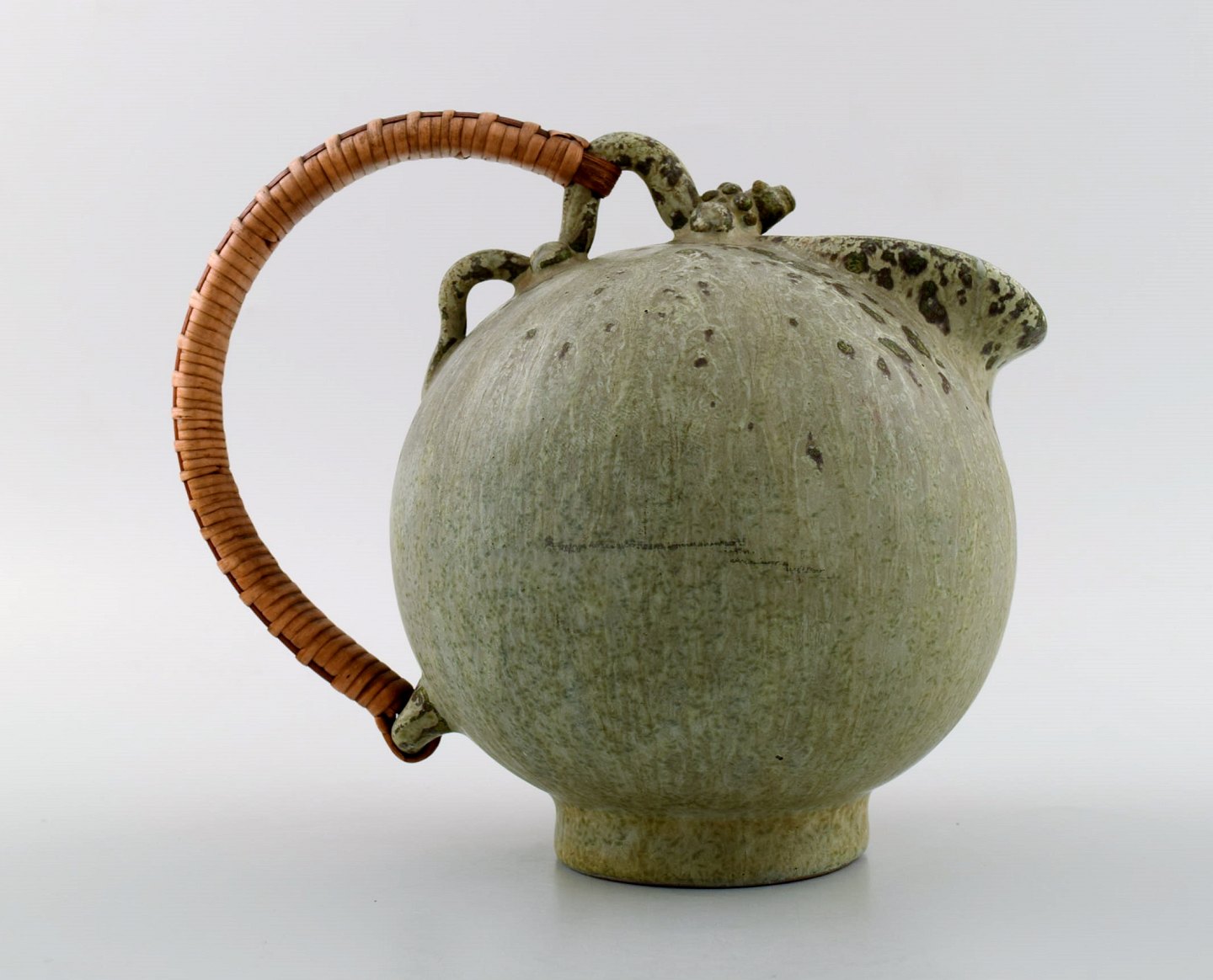 Arne Bang art pottery pitcher with wicker handle. Model number 151. Marked AB 151. Denmark 40 s. Glaze in greenish/grey shades. In perfect condition. Measures: 19 x 14 cm.