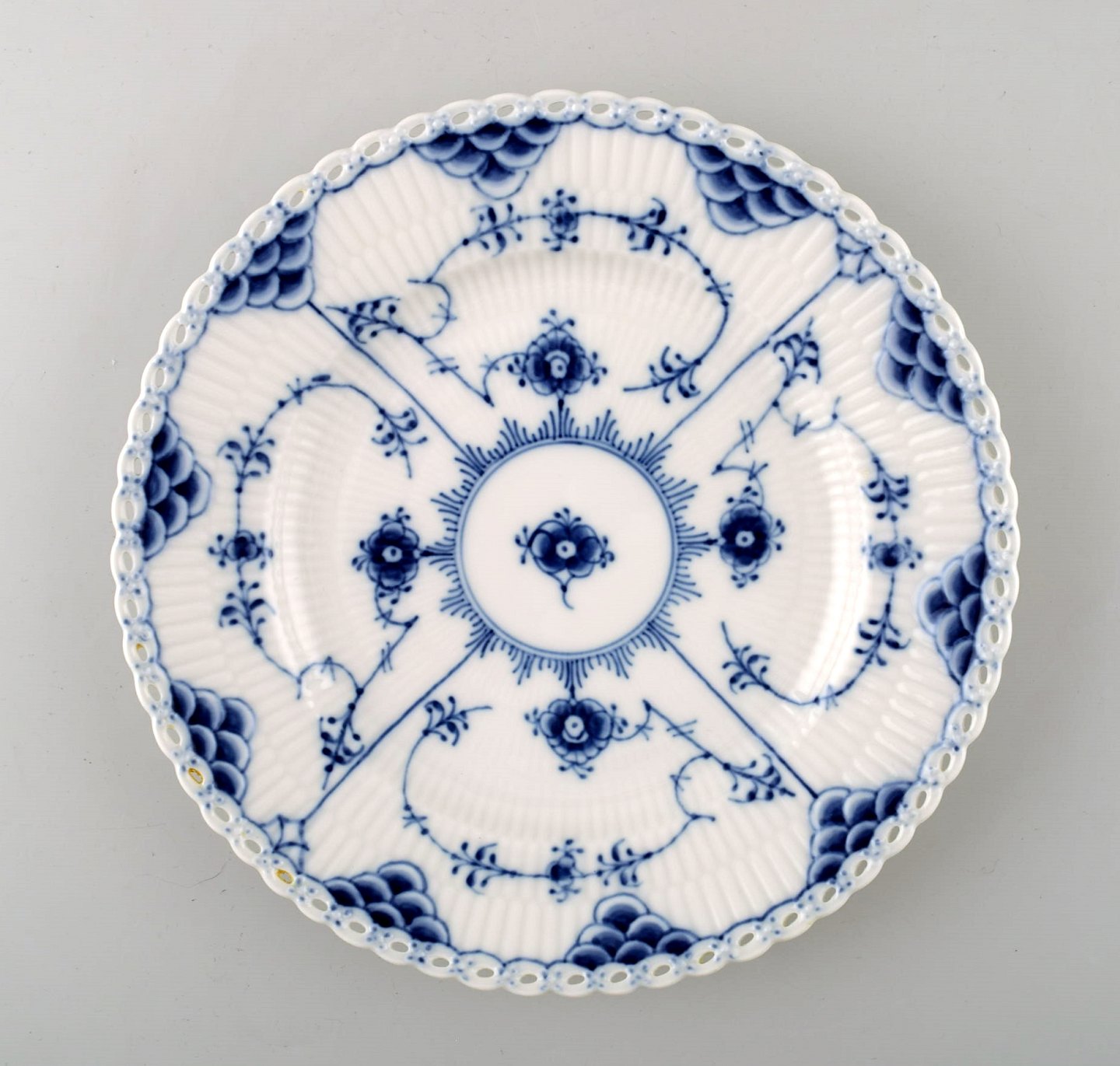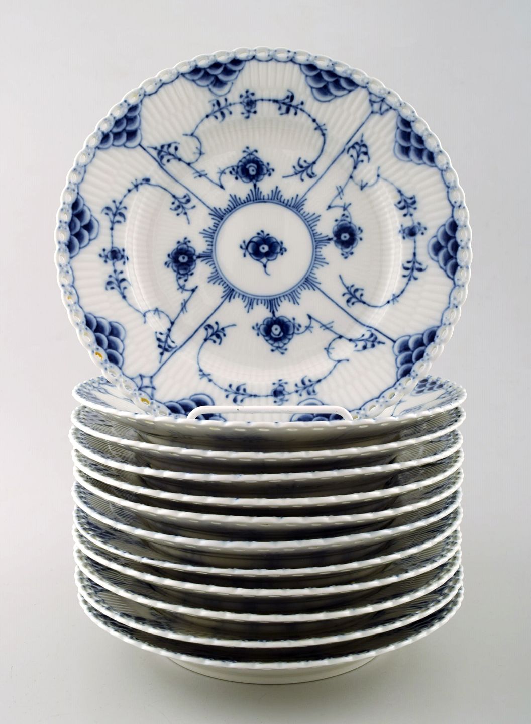 Twelve plates. Blue Fluted Full Lace Plates from Royal Copenhagen. Decoration number: 1/1086. Measures: 19.5 cm. 1st. factory quality. In perfect condition.