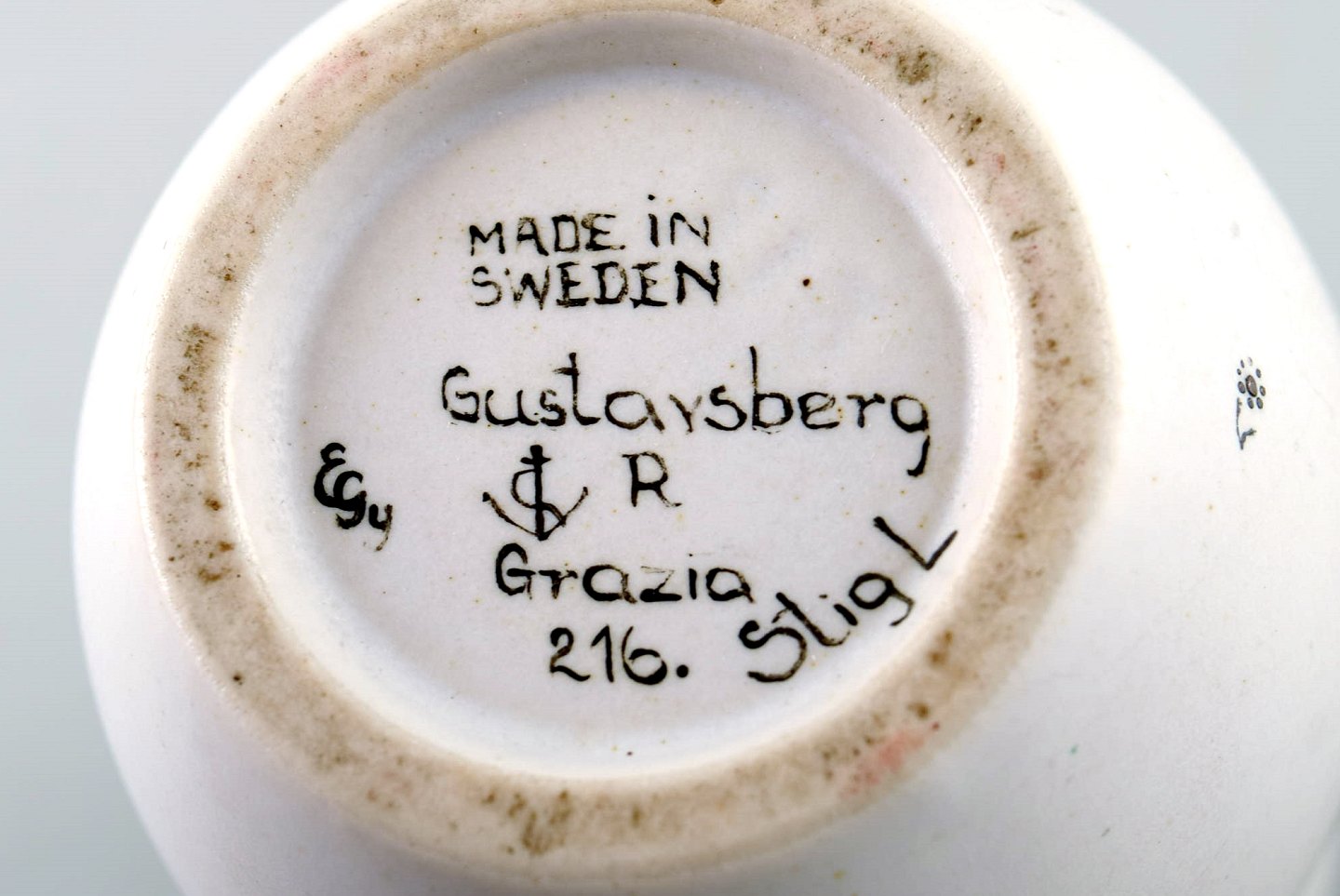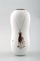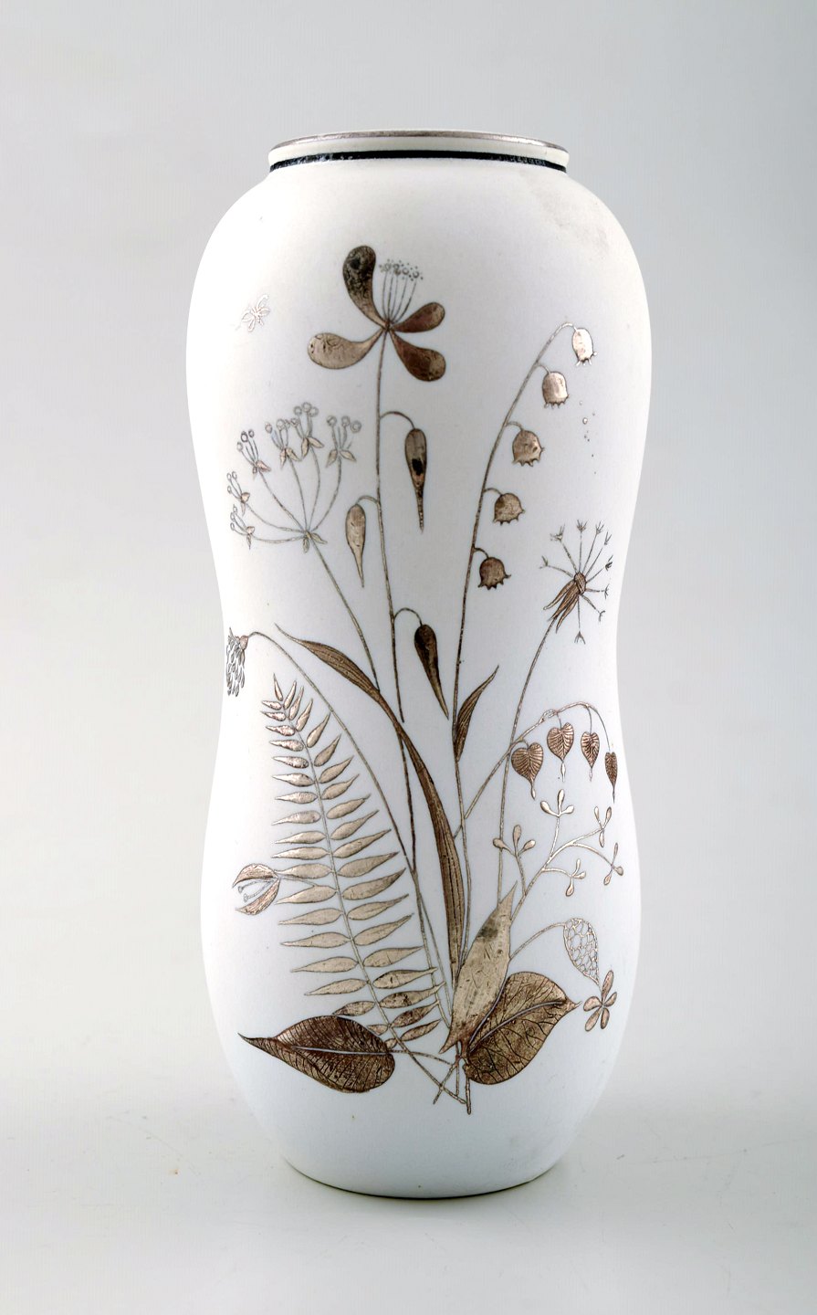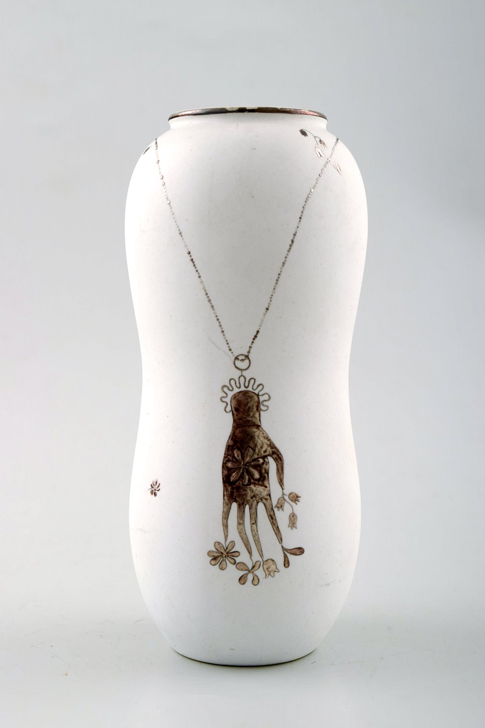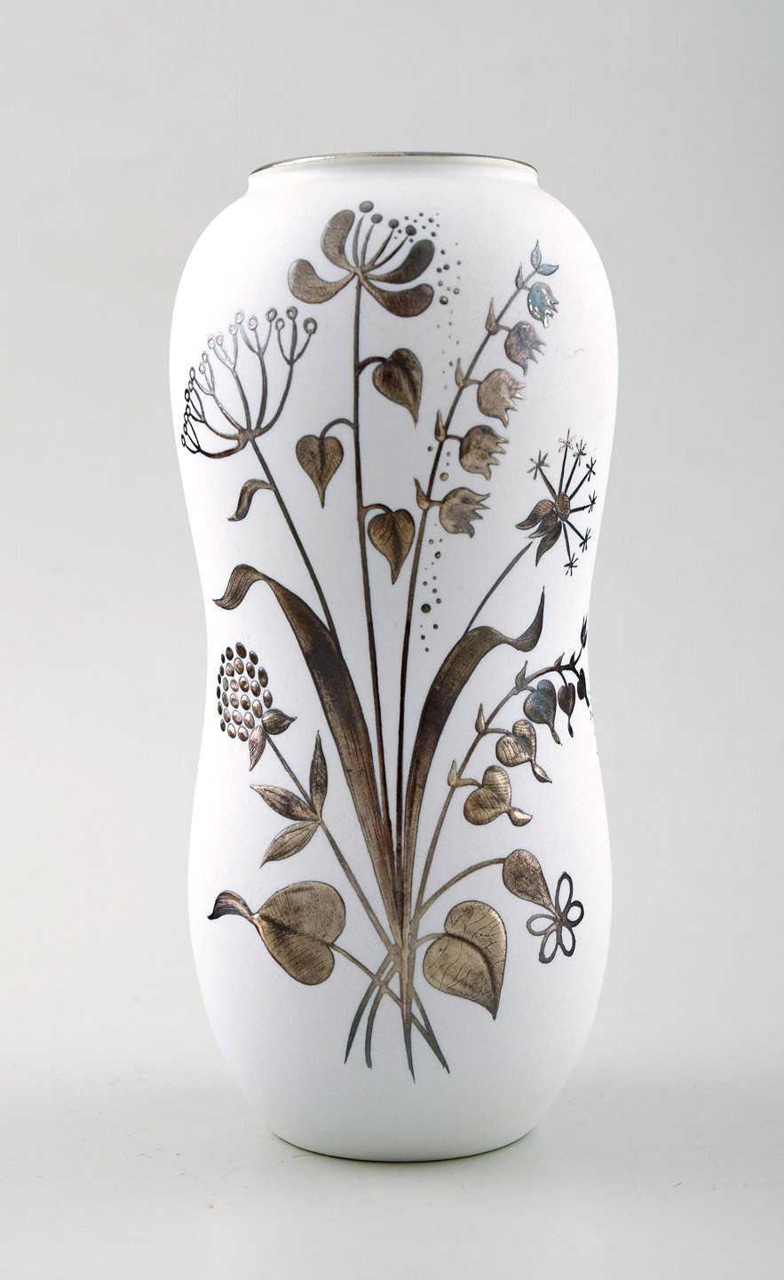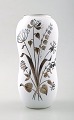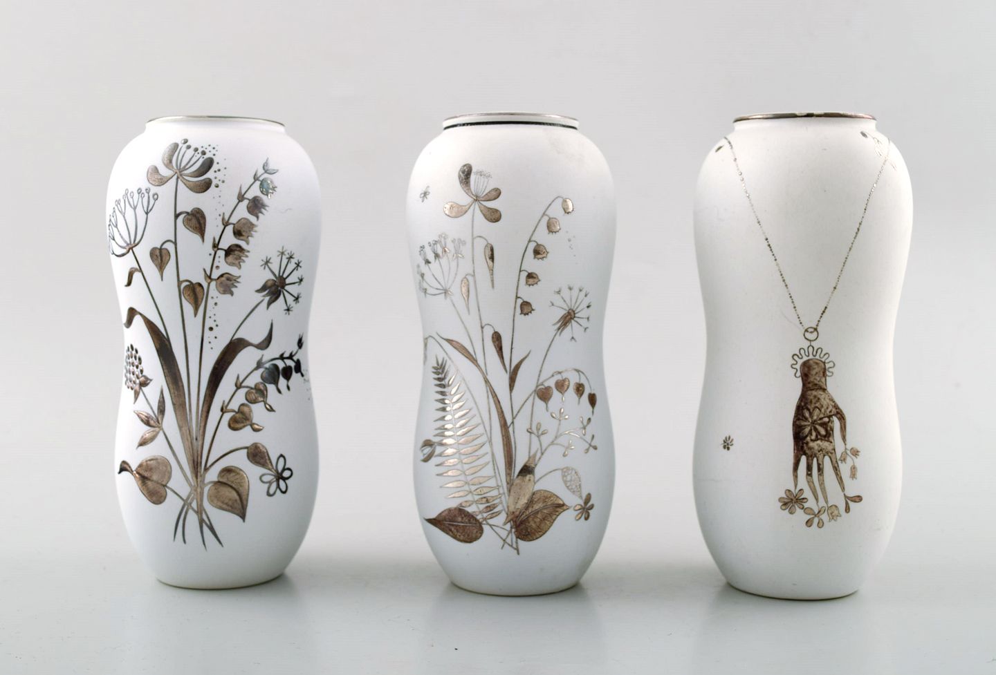 STIG LINDBERG, tre vaser, "Grazia", hvidglaseret, malet med sølv dekoration i form af blomster, Gustavsberg, Sverige. Højde 15 cm. Bredde 6,5 cm. Modelnummer 216. Stemplet. I perfekt stand.
