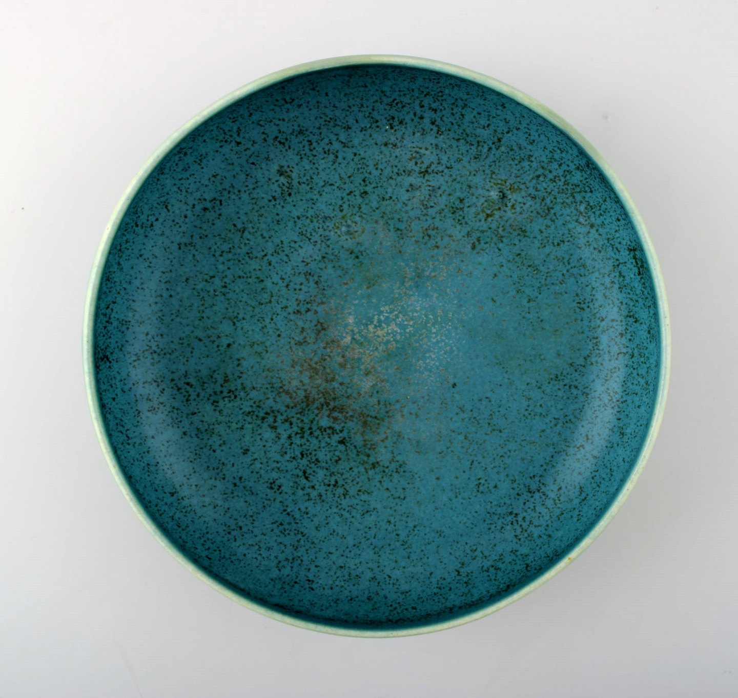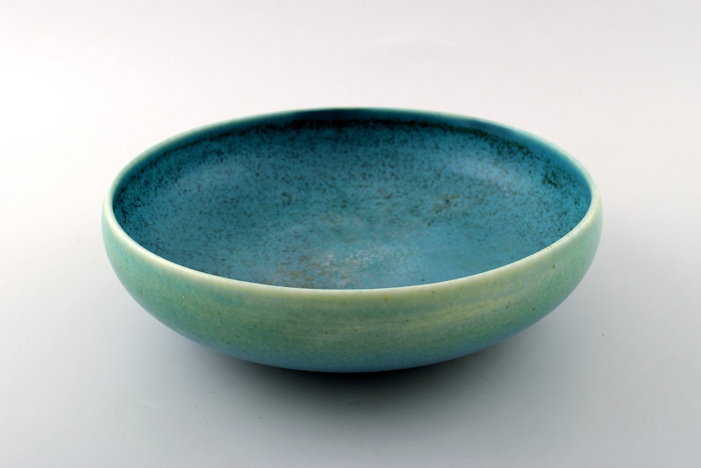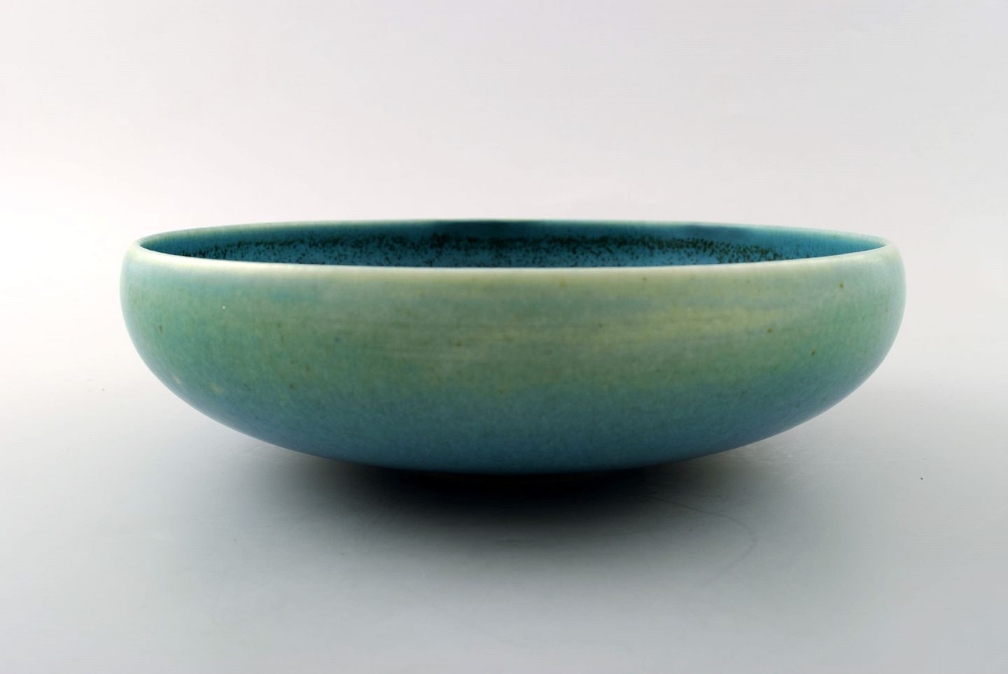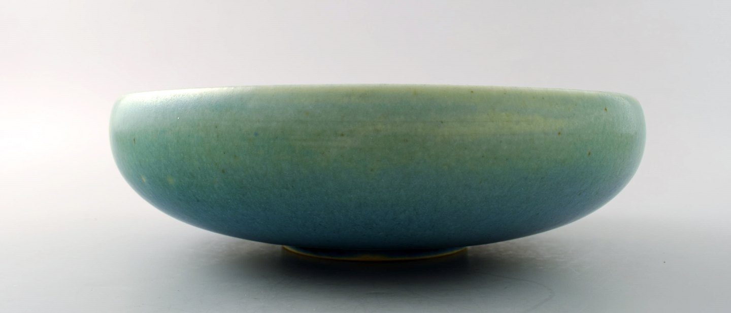 Early Saxbo, ceramic bowl in modern design. Beautiful glaze in green tones. Stamped. Model Number 57. Measures: 23 cm. x 7 cm. In perfect condition.