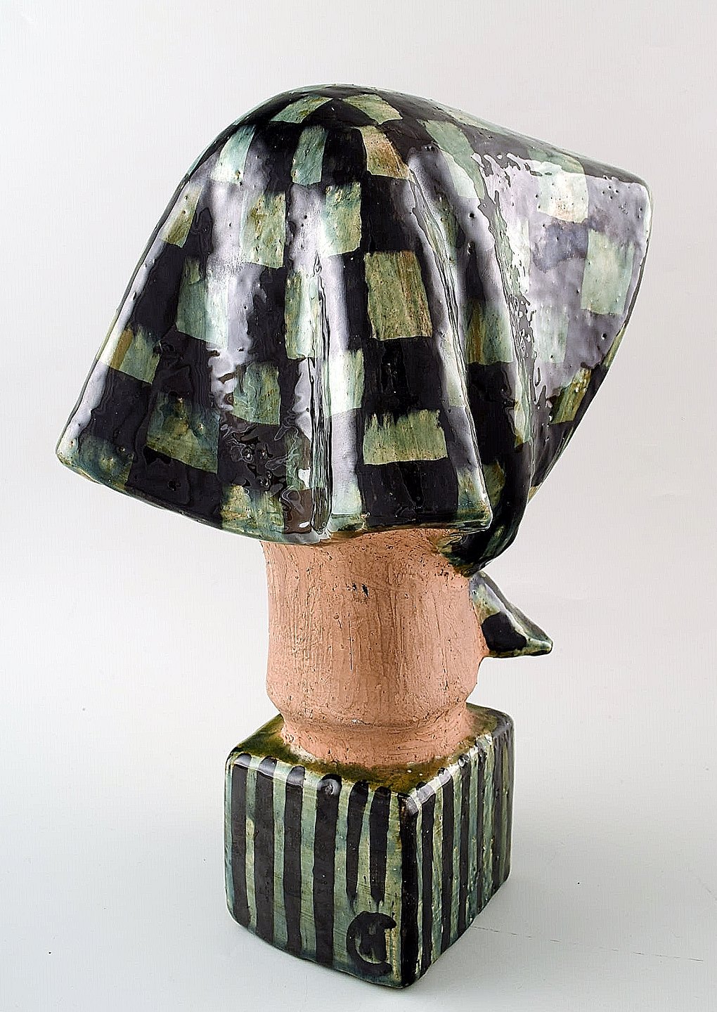 Helge Christoffersen Own workshop, large unique figure of young model wearing scarf. High quality ceramic sculpture, beautiful glaze. Measures 29 x 20 cm. In perfect condition. Signed.