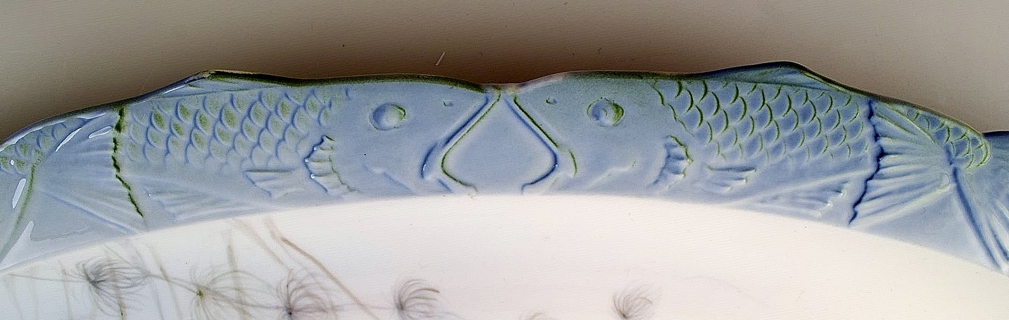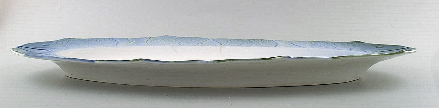 Arnold Krog for Royal Copenhagen : "Fiskestel" af porcelæn, meget stort ovalt fiskefad dekoreret i farver med fisk. Nummer 999/3001. Måler : 60 cm. x 27 cm. 2. sortering, i perfekt stand.