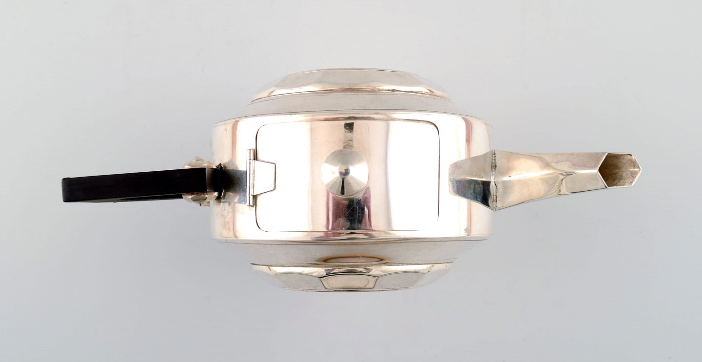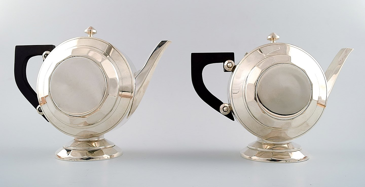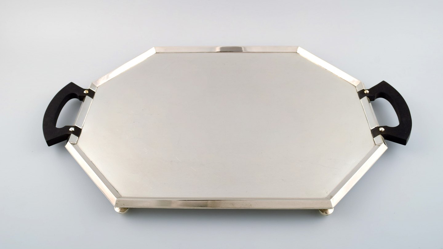 Eksklusivt og komplet Art Deco kaffe/the-service, stor bakke på fødder i sølvplet designet af Christian Fjerdingstad for Christofle (Gallia.)