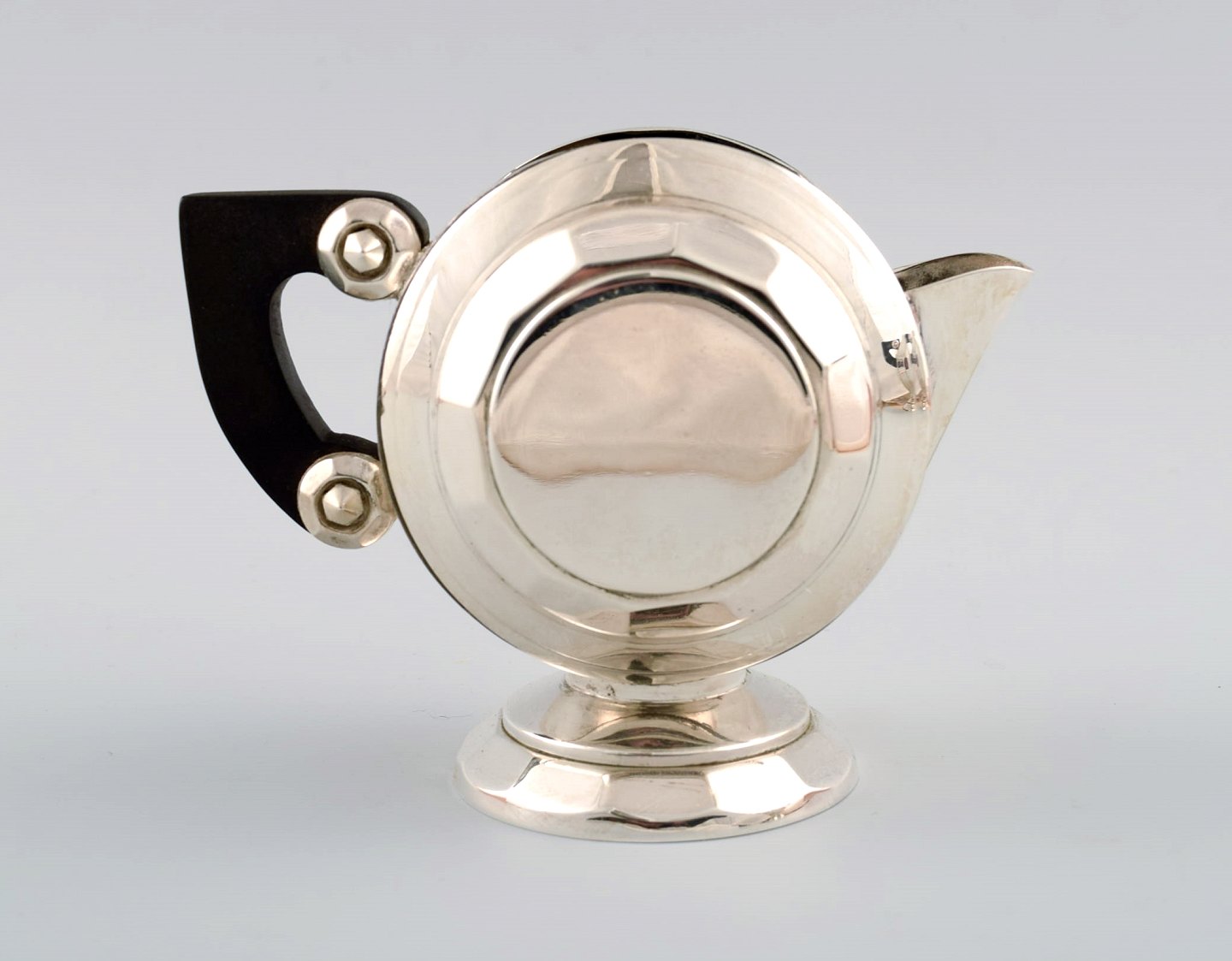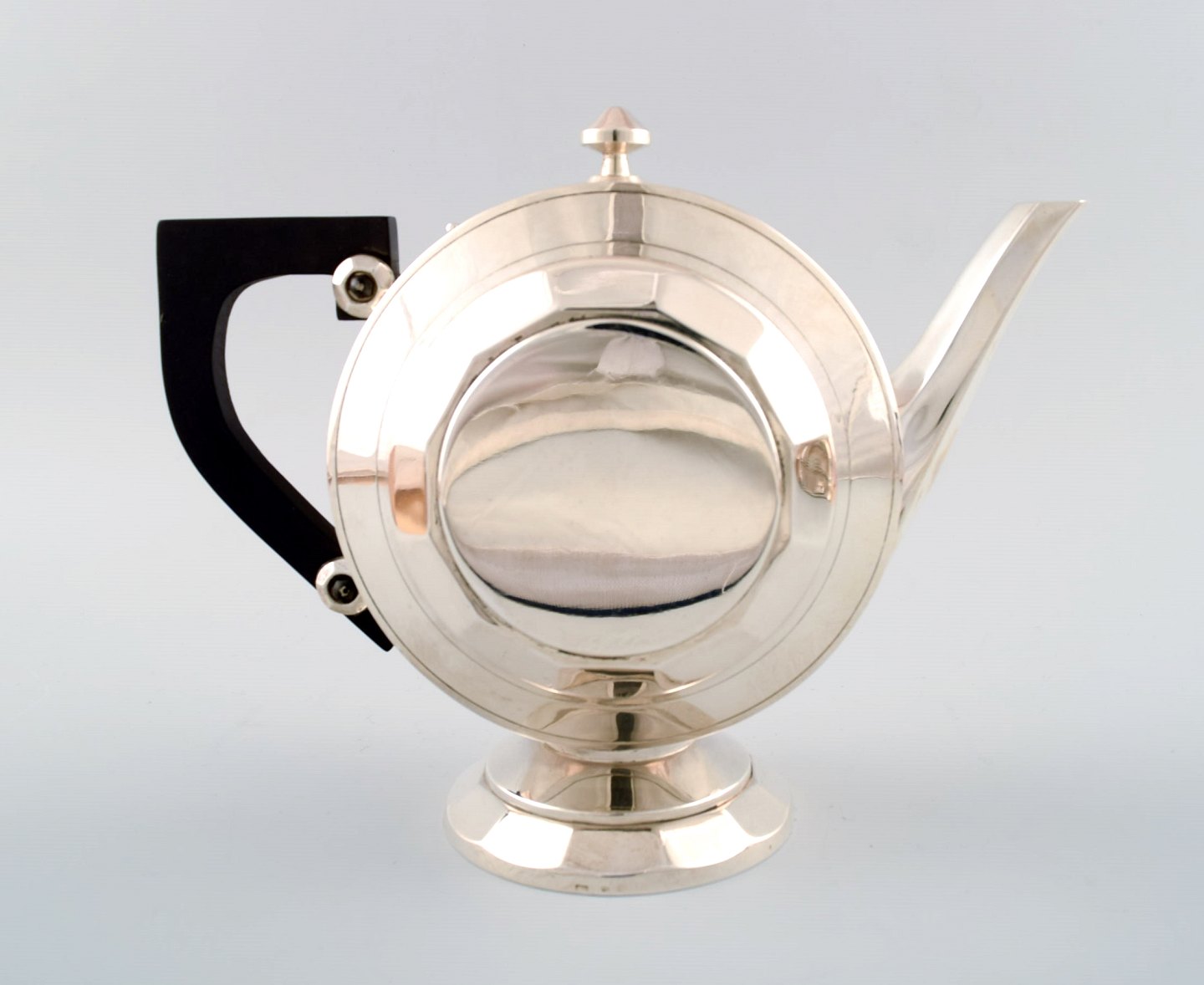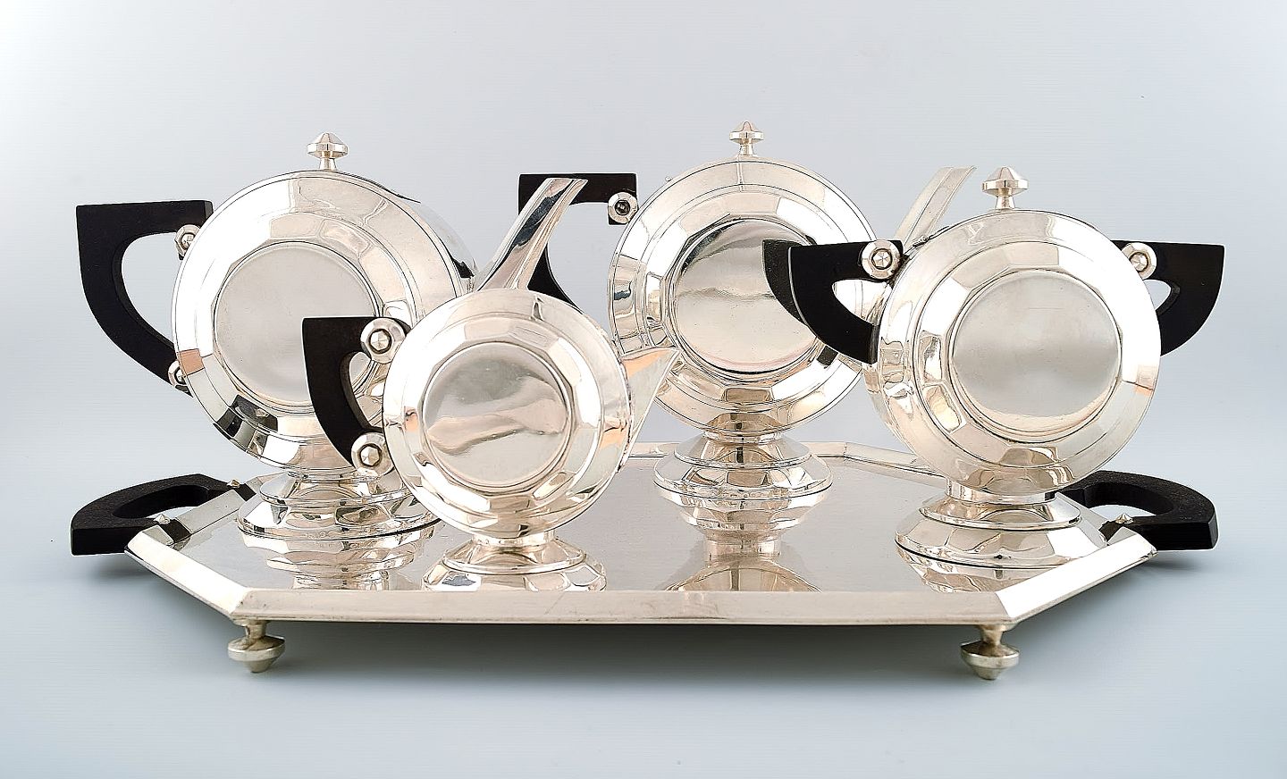 Eksklusivt og komplet Art Deco kaffe/the-service, stor bakke på fødder i sølvplet designet af Christian Fjerdingstad for Christofle (Gallia.)