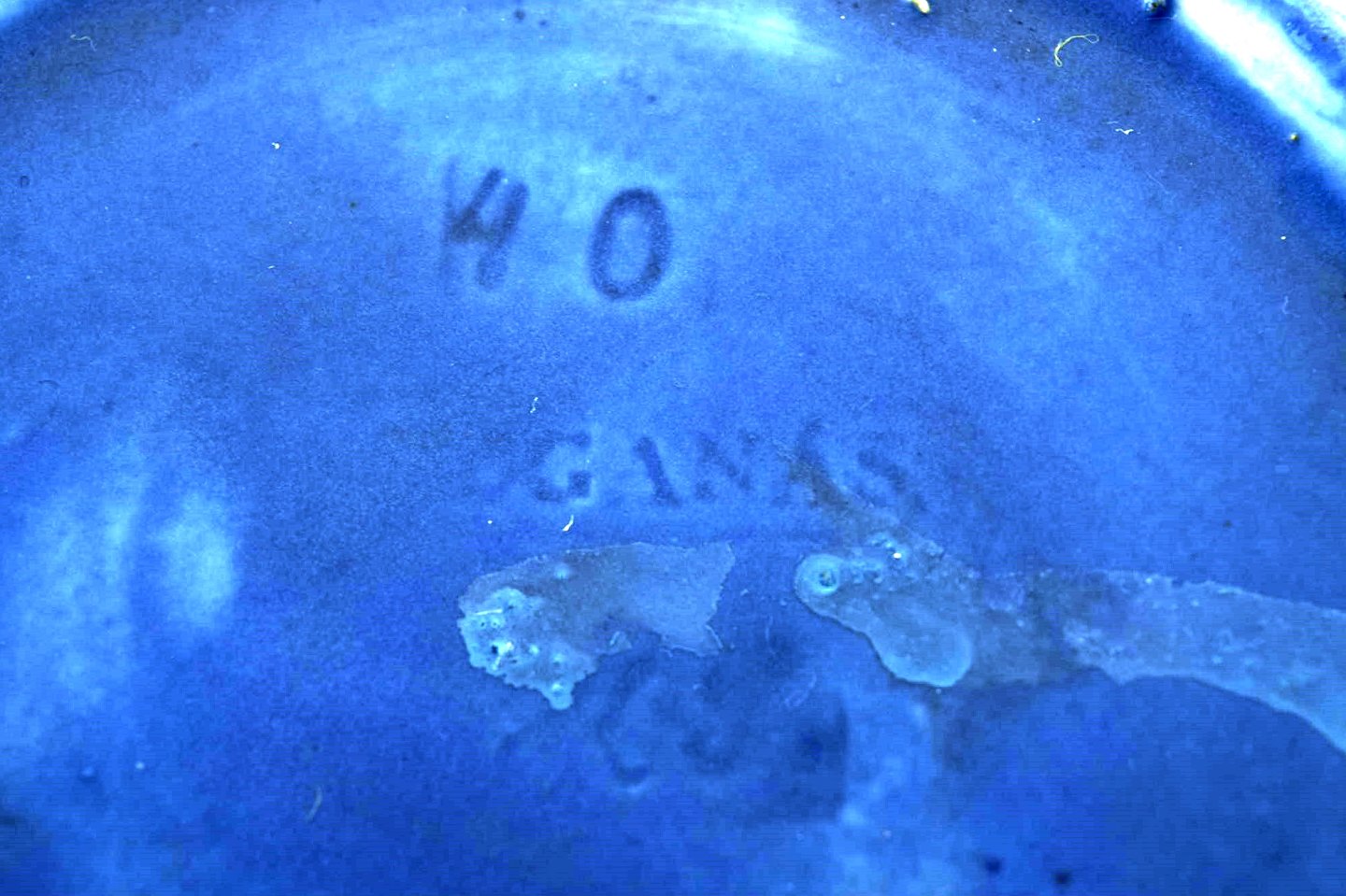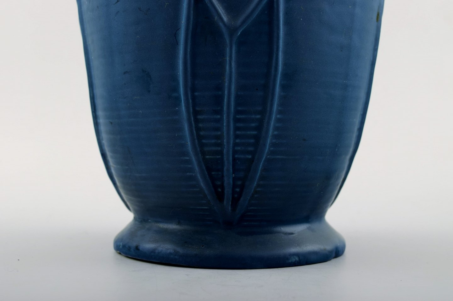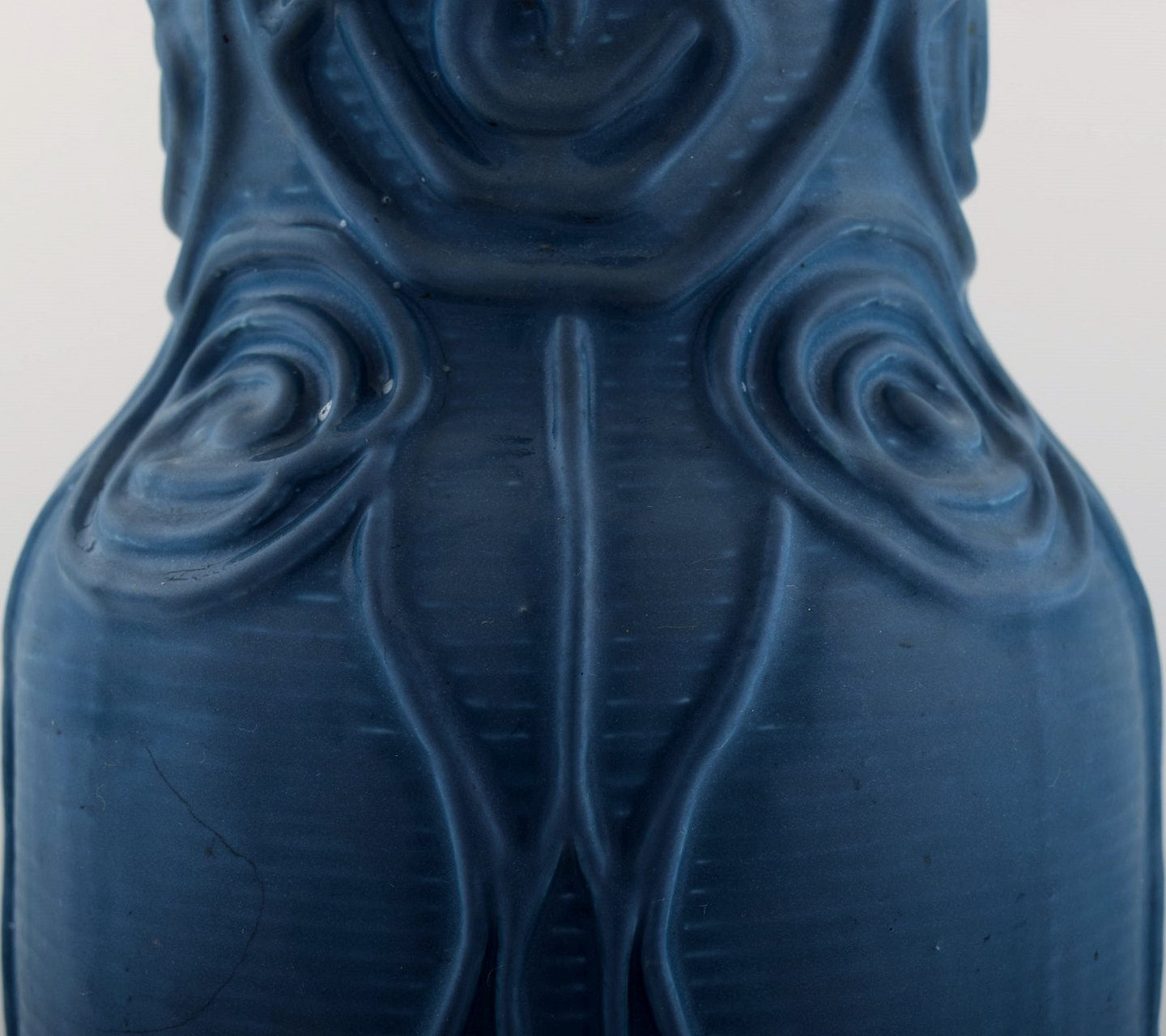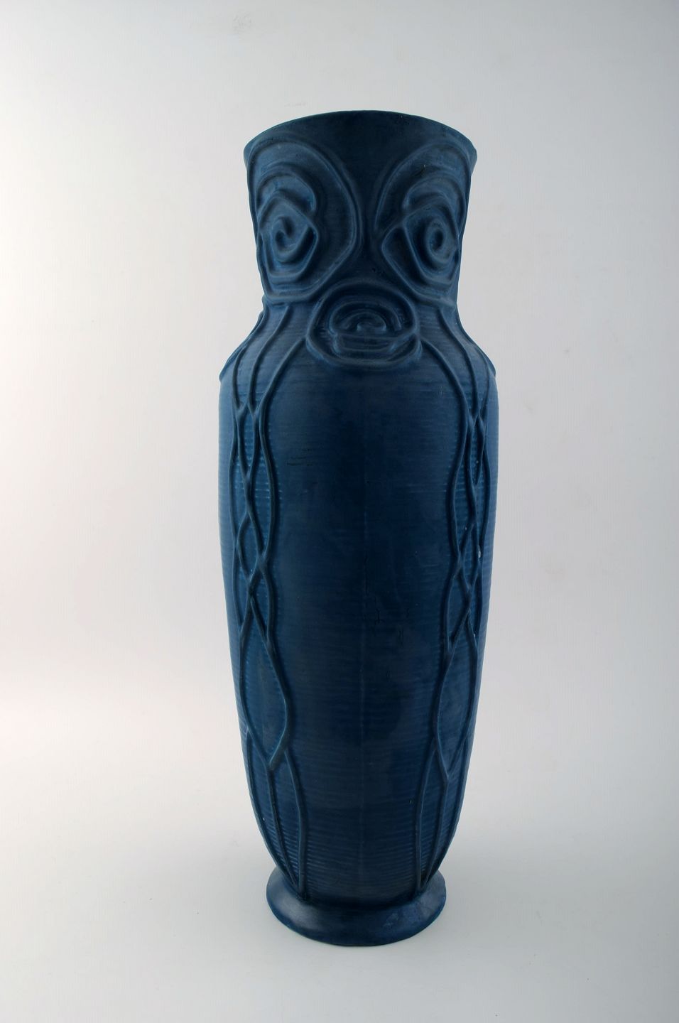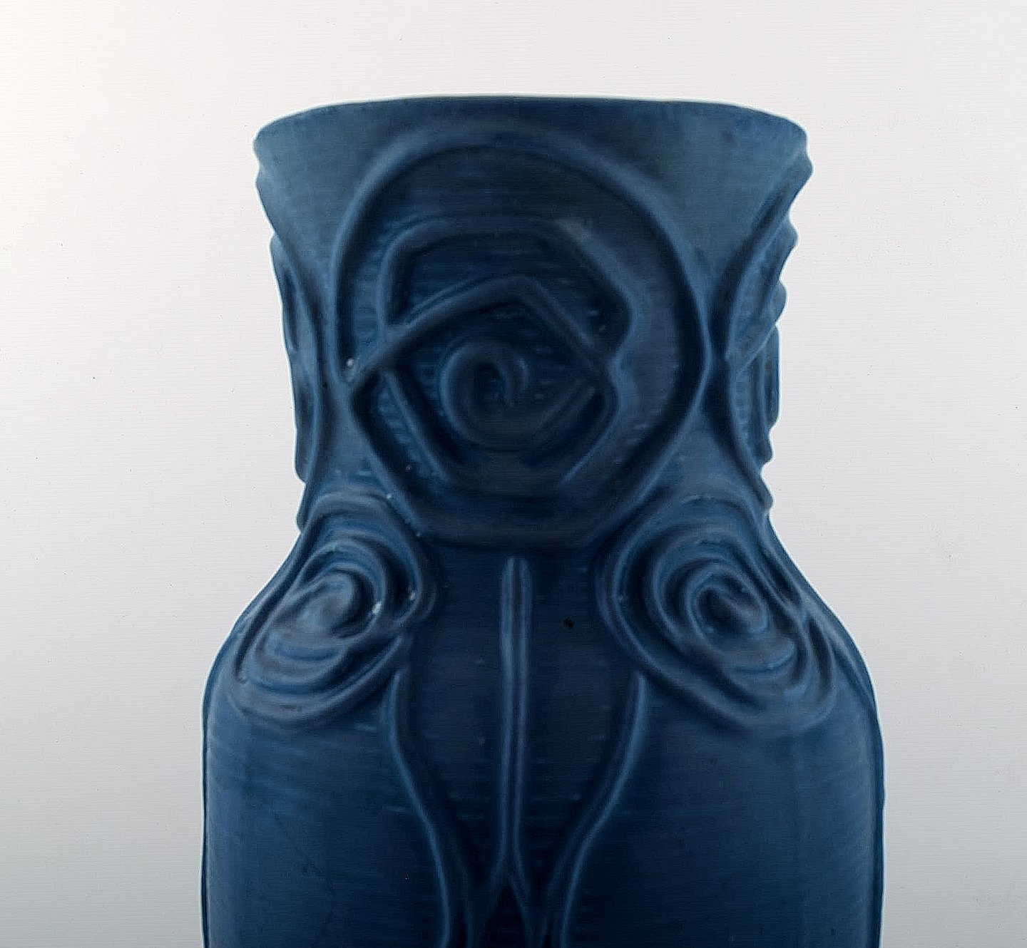 Stor Höganäs Art Nouveau keramikgulvvase. Blomster i relief. Smuk mørkeblå glasur. Stemplet, ca. 1910. 42 cm. x 16 cm. I perfekt stand.