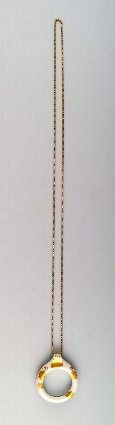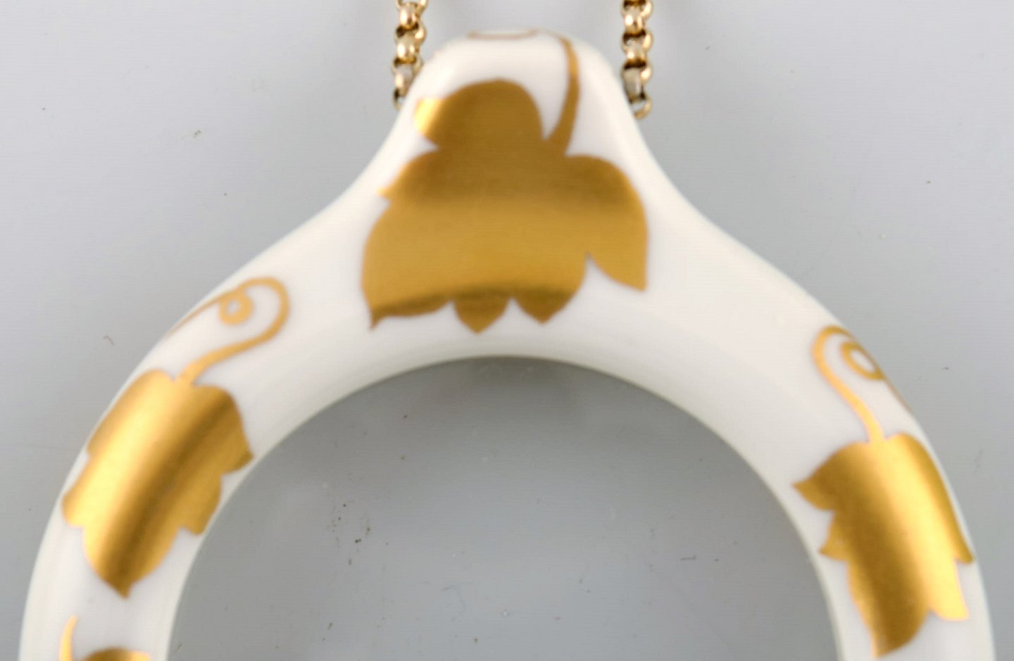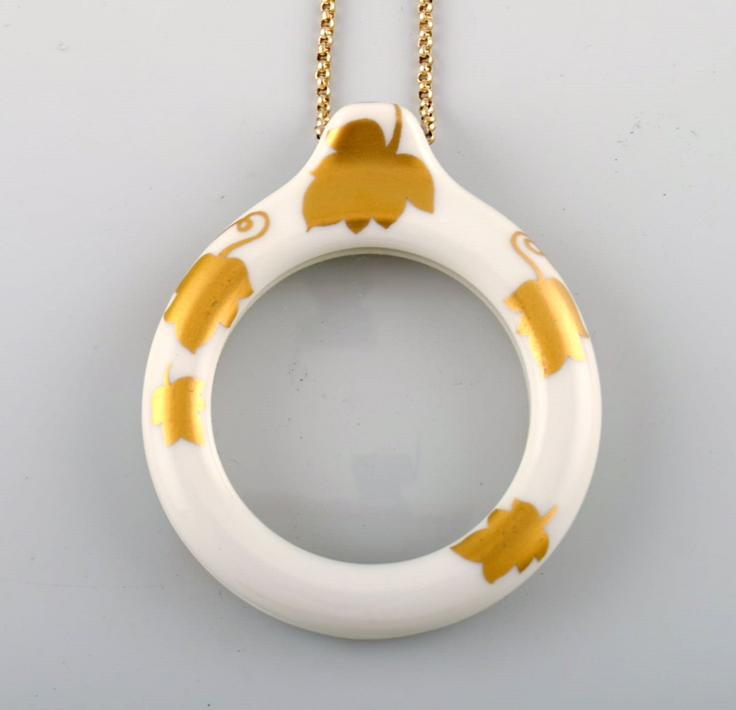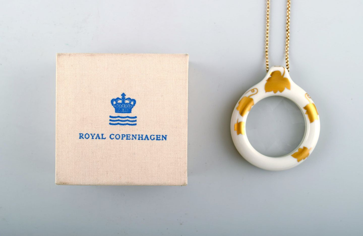 Sjældent Royal Copenhagen forstørrelsesglas, porcelæn dekoreret med blade i guld. I original æske. Måler : 6,5 cm. x 5,5 cm. 1. sortering, i perfekt stand.