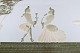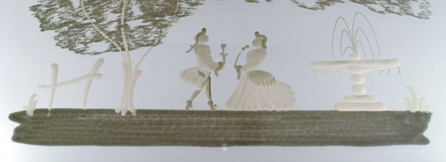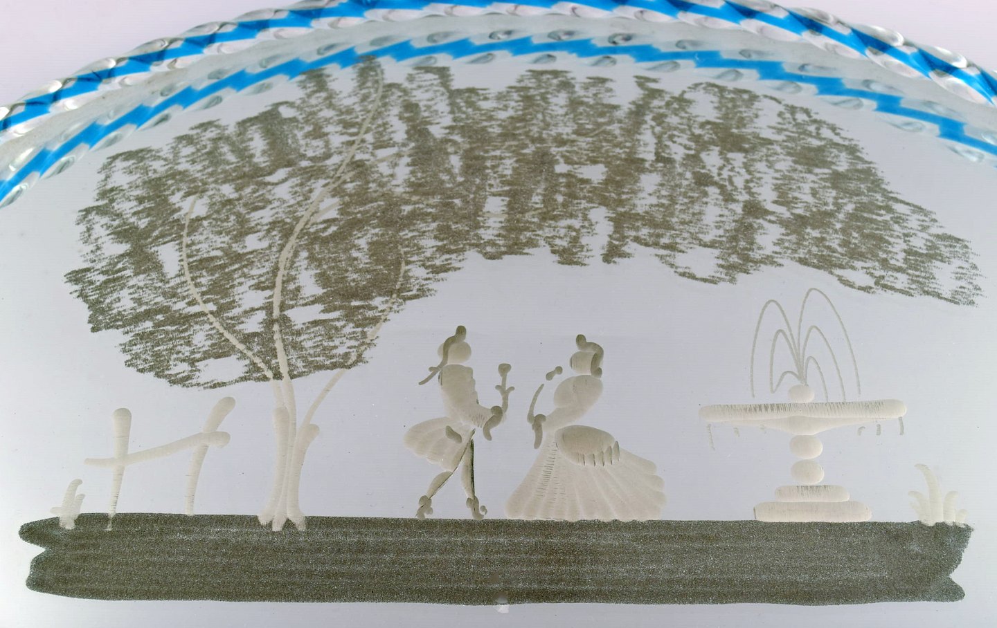 Murano, Italien, meget stor rund bakke med plade med spejlbelægning, med galant scene, glasbånd med blå trådindsmeltning, to guldfarvede metalgreb i siden.