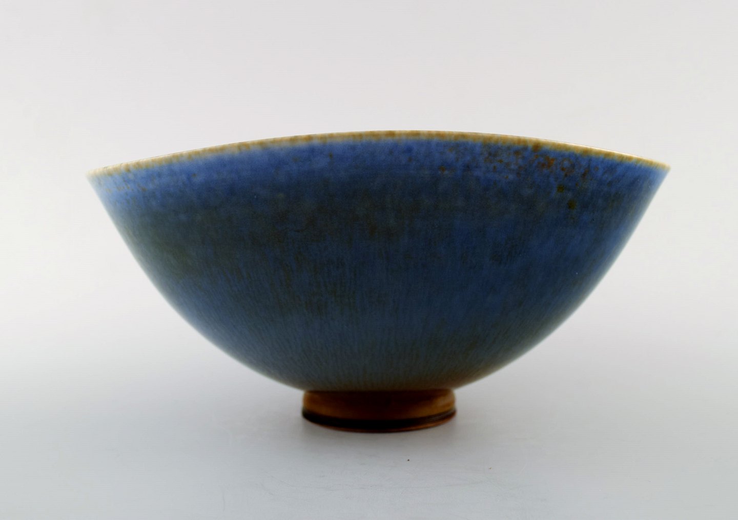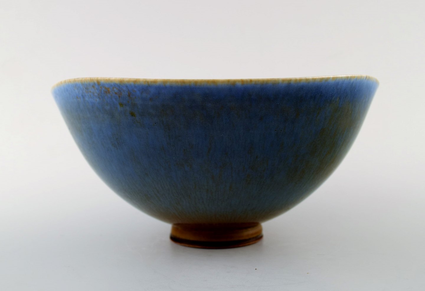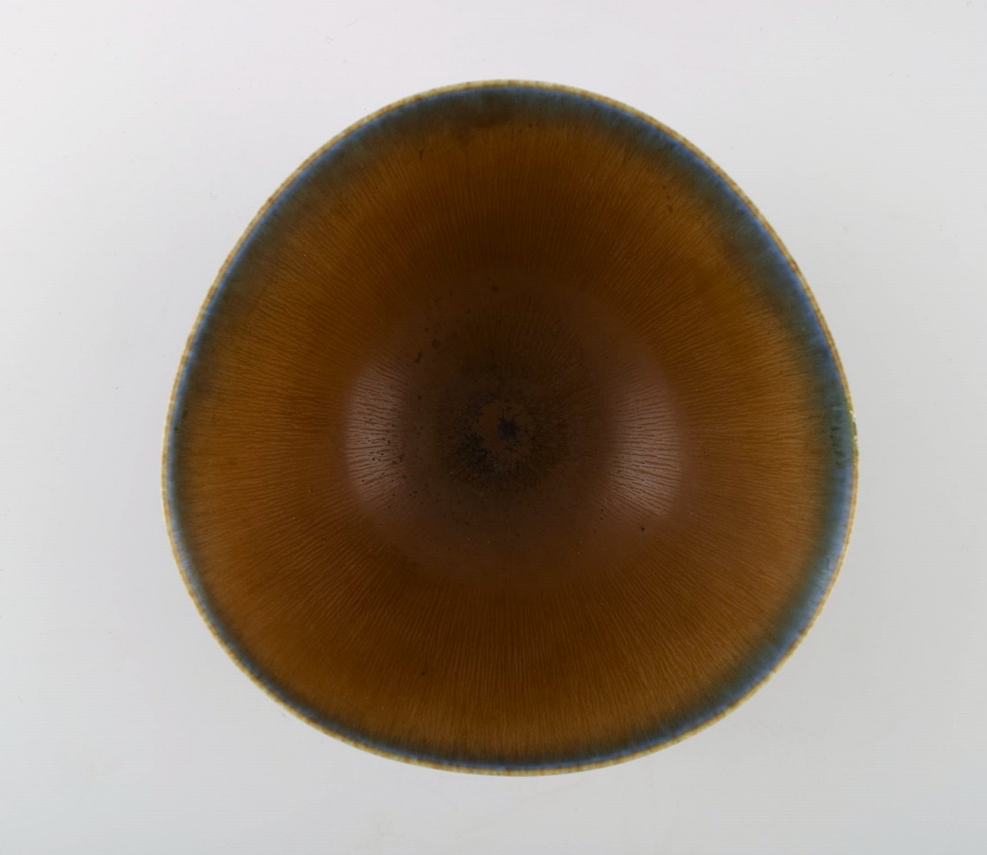 Berndt Friberg Studio ceramic bowl. Modern Swedish design. Unique, handmade. Fantastic glaze in blue and brown shades! Perfect. 1st. factory quality. Signed. Measures: 15.5 cm. X 7 cm.