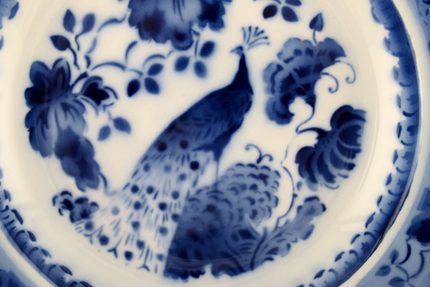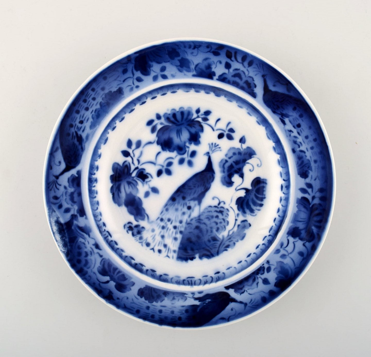 Peacock from Copenhagen faience / Aluminia. Deep plate in faience. 10 pieces in stock. We have many parts in stock. Measures: 22 cm. In very good condition.