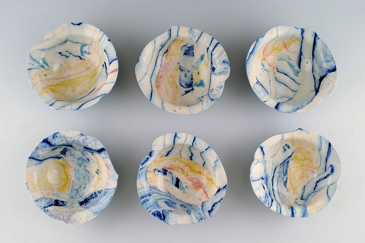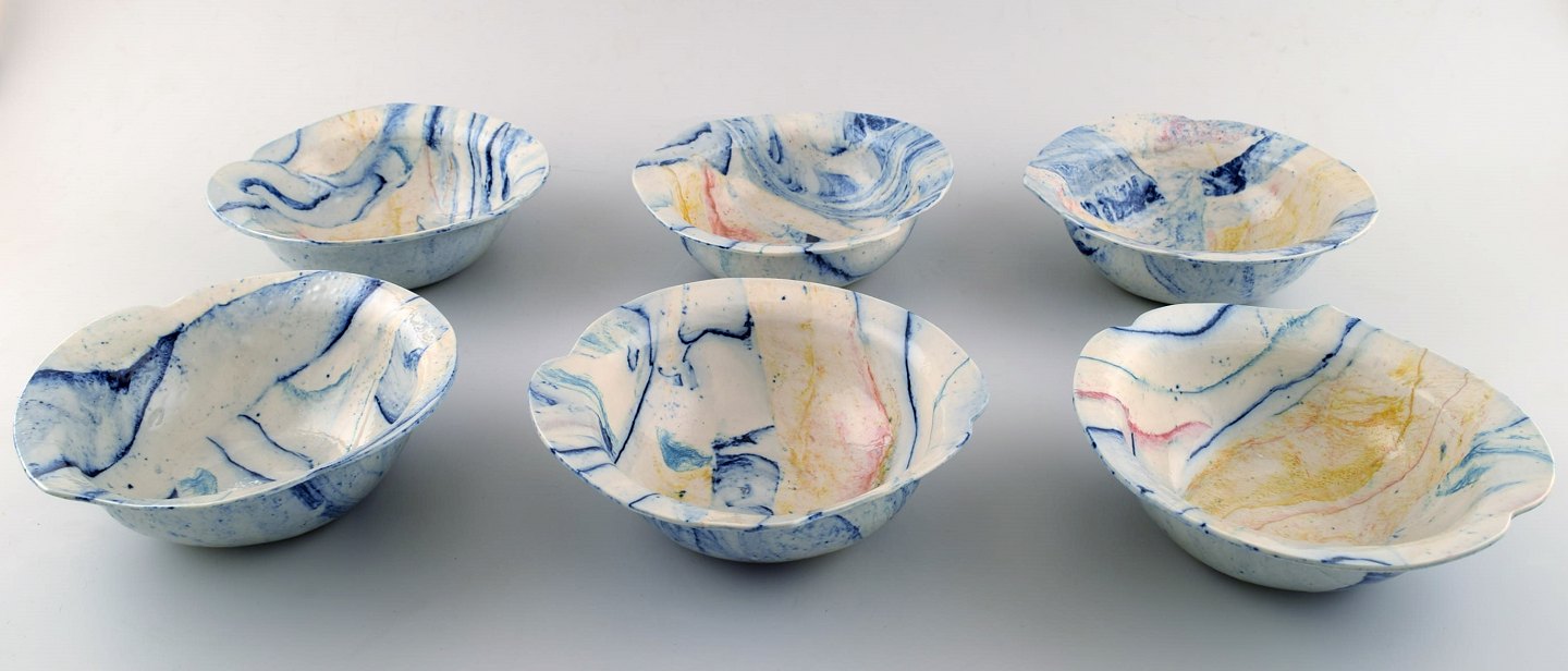 Cilla Adlercreutz, Swedish ceramist, six unique bowls, 1985. Measures: 16.5 cm. x 5 cm. In perfect condition. Stamped.