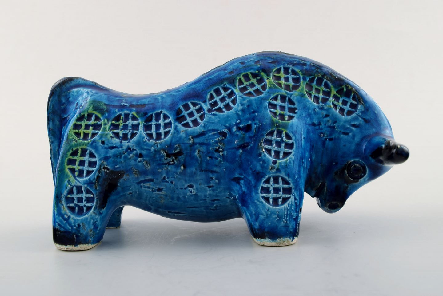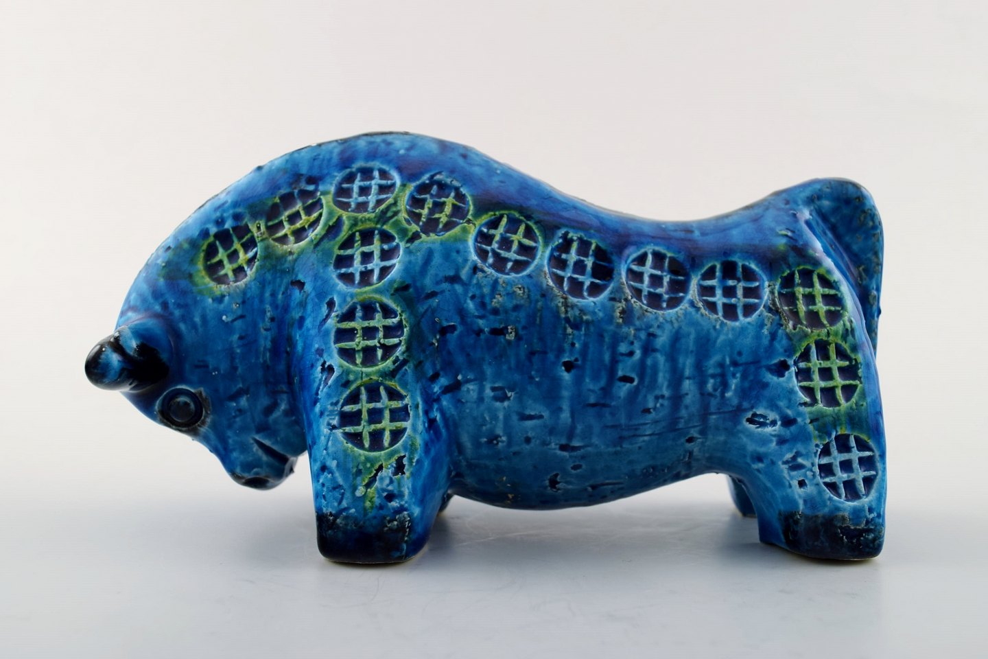 Bitossi, Rimini-blå tyr i keramik, designet af Aldo Londi. Ustemplet. 1960´erne. Måler : 16 cm. x 8 cm. I perfekt stand.