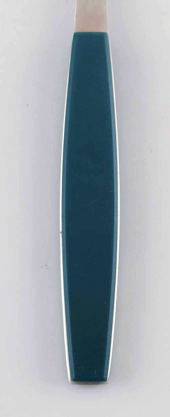 14 dinner forks, Henning Koppel. Strata cutlery stainless steel and green plastic. Designed by Georg Jensen. In very good condition. Danish design 1970s. 19,5 cm. long.