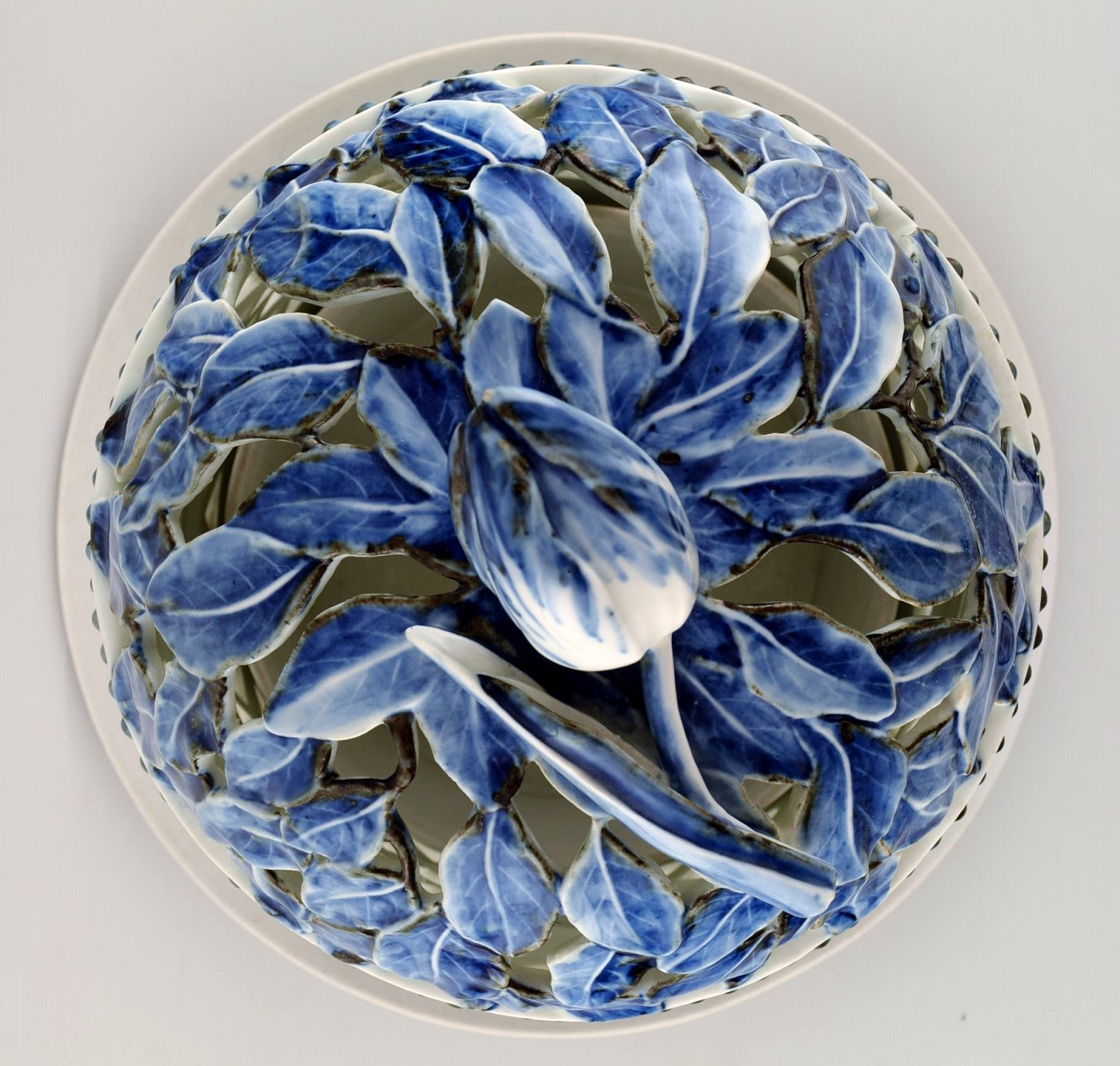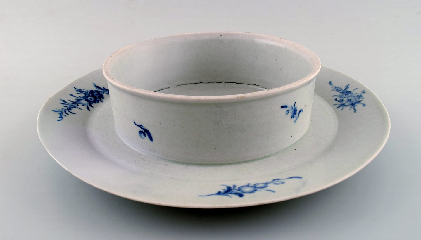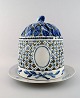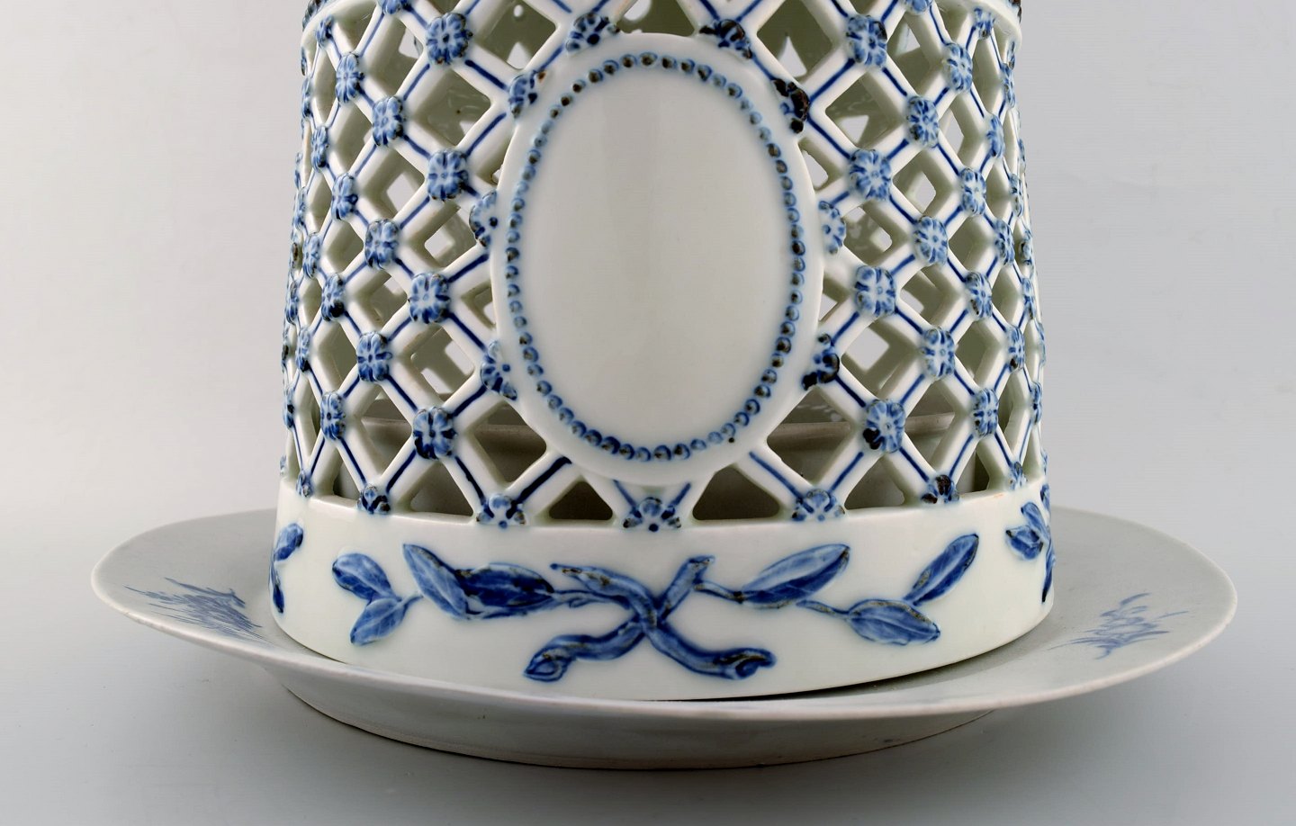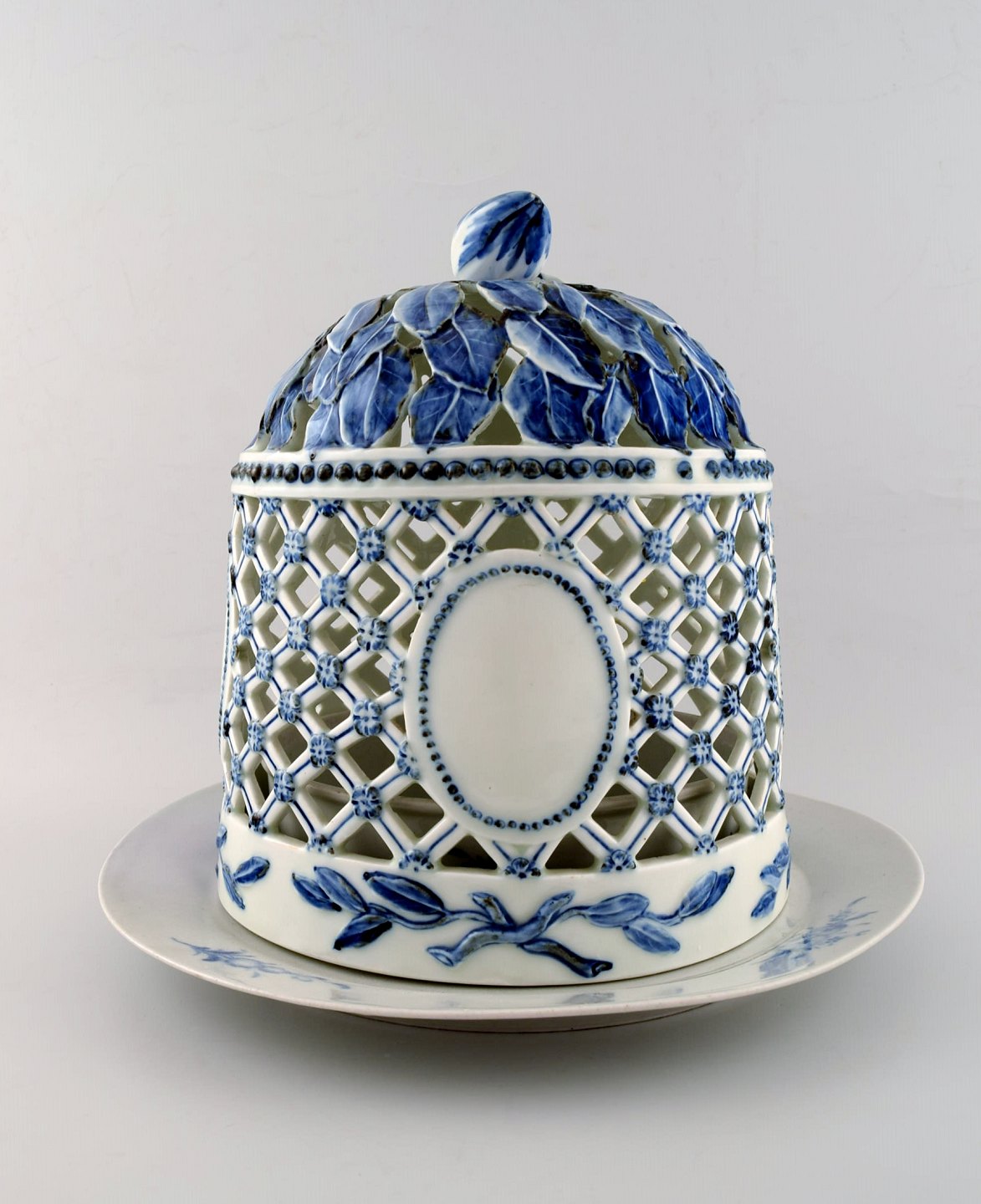 Antik Royal Copenhagen isklokke på fad af porcelæn, musselmalet, dekoreret i blå underglasur, gennembrudt klokke med stiliseret bladværk.