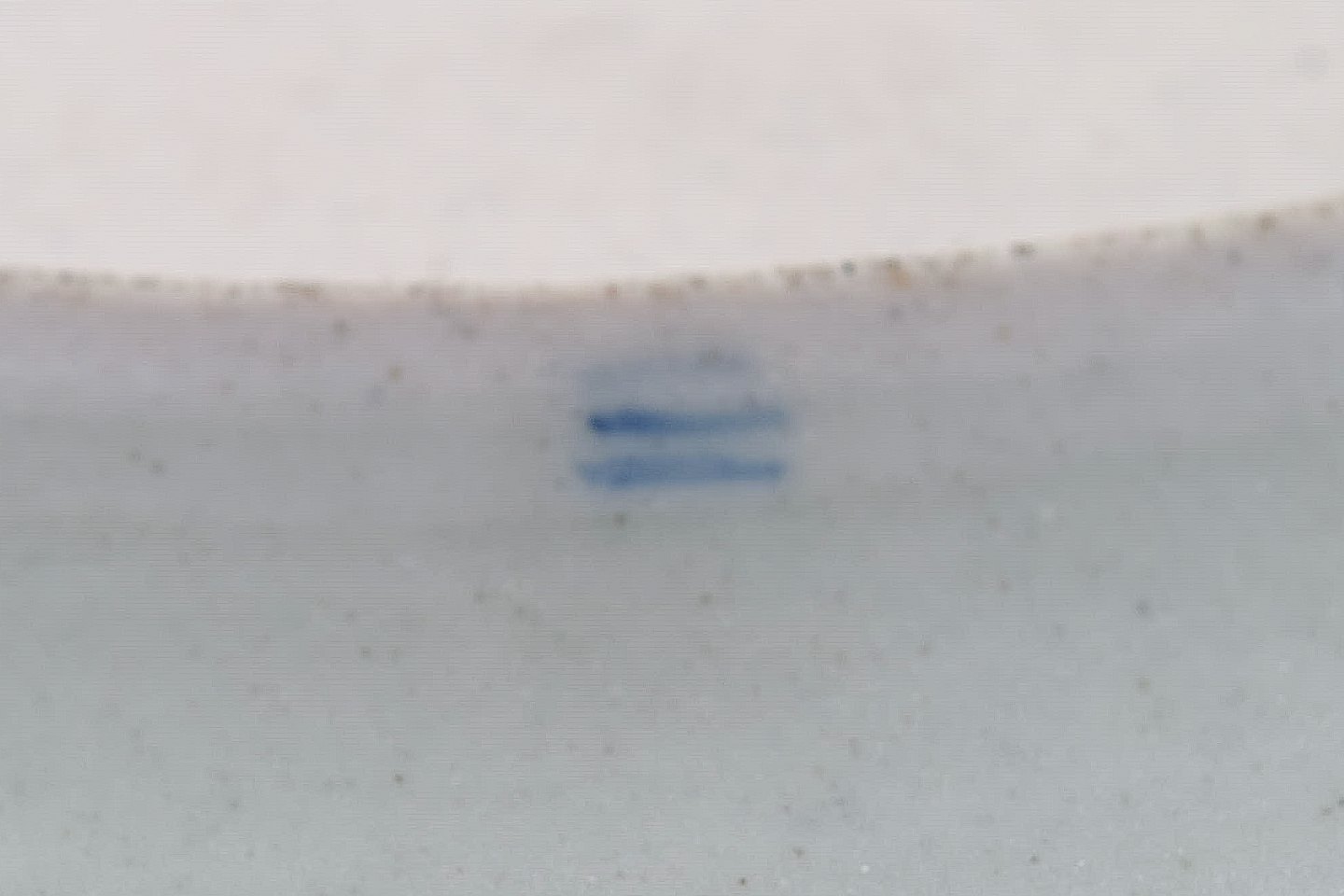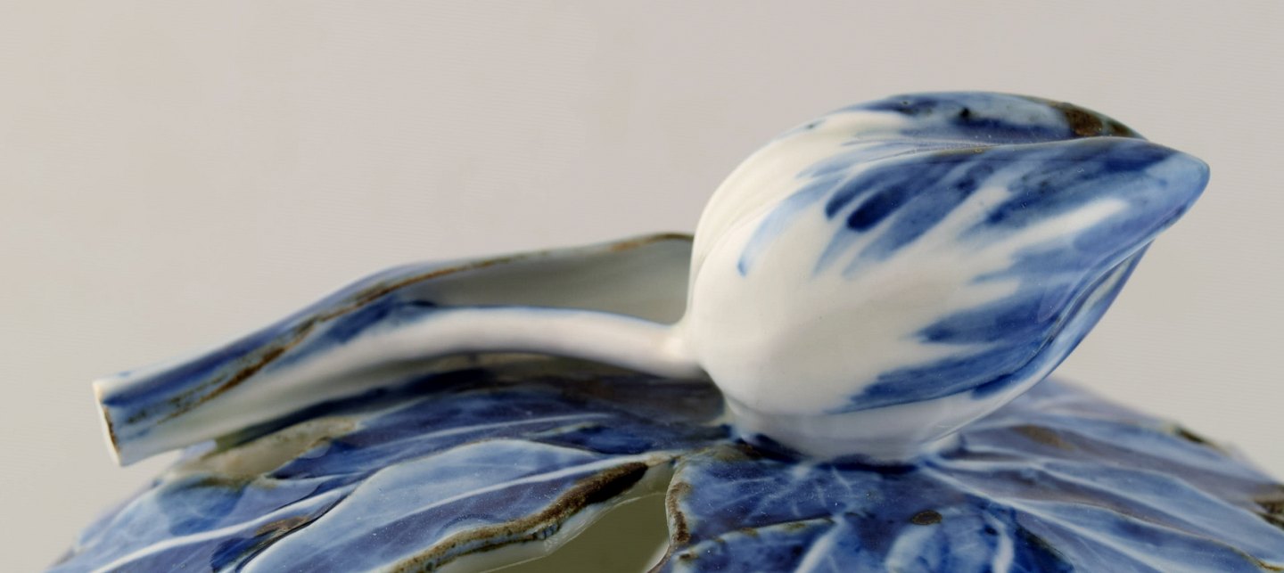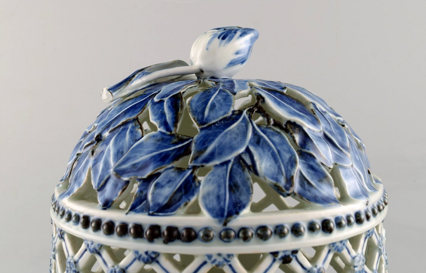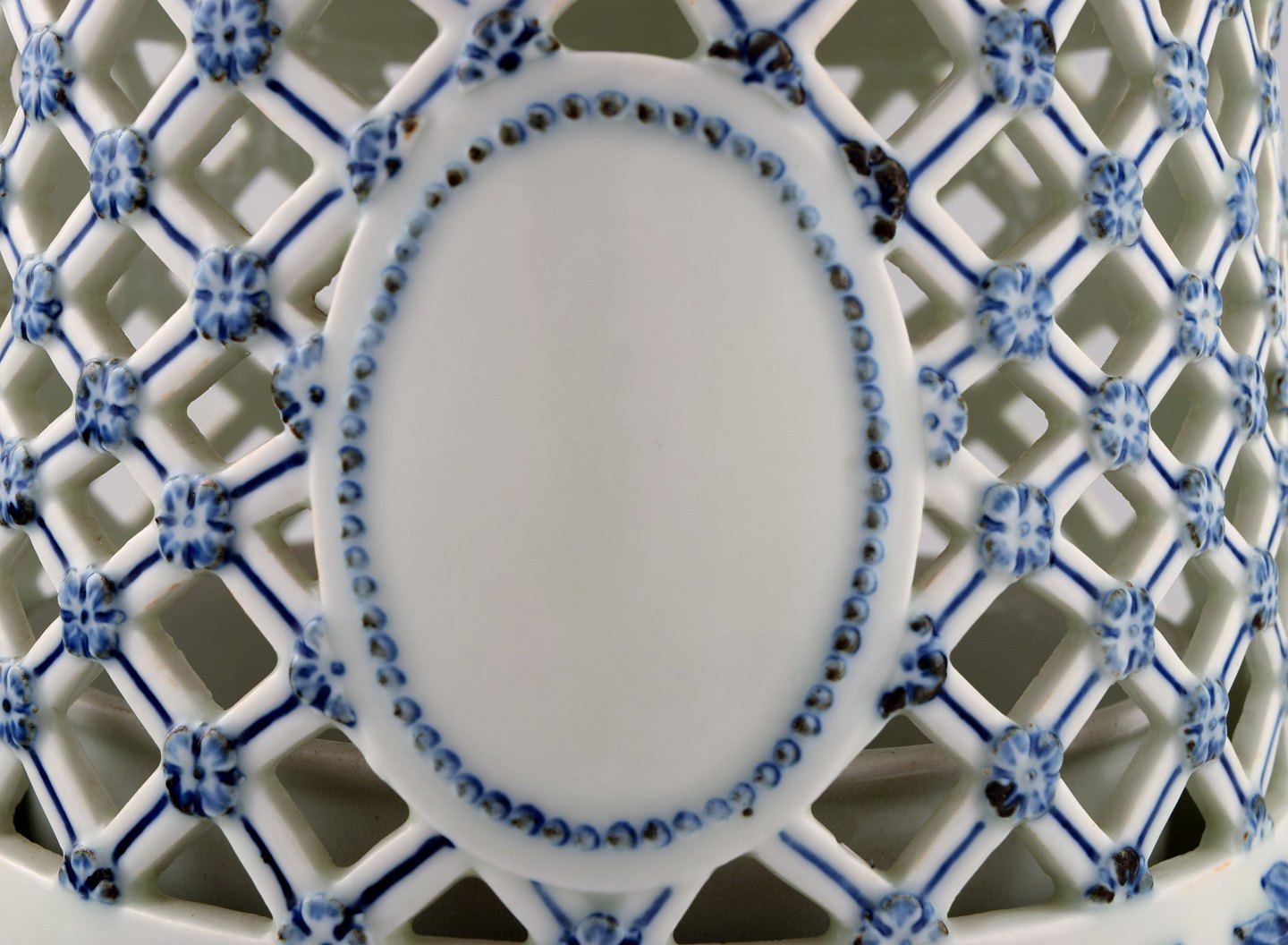 Antik Royal Copenhagen isklokke på fad af porcelæn, musselmalet, dekoreret i blå underglasur, gennembrudt klokke med stiliseret bladværk.
