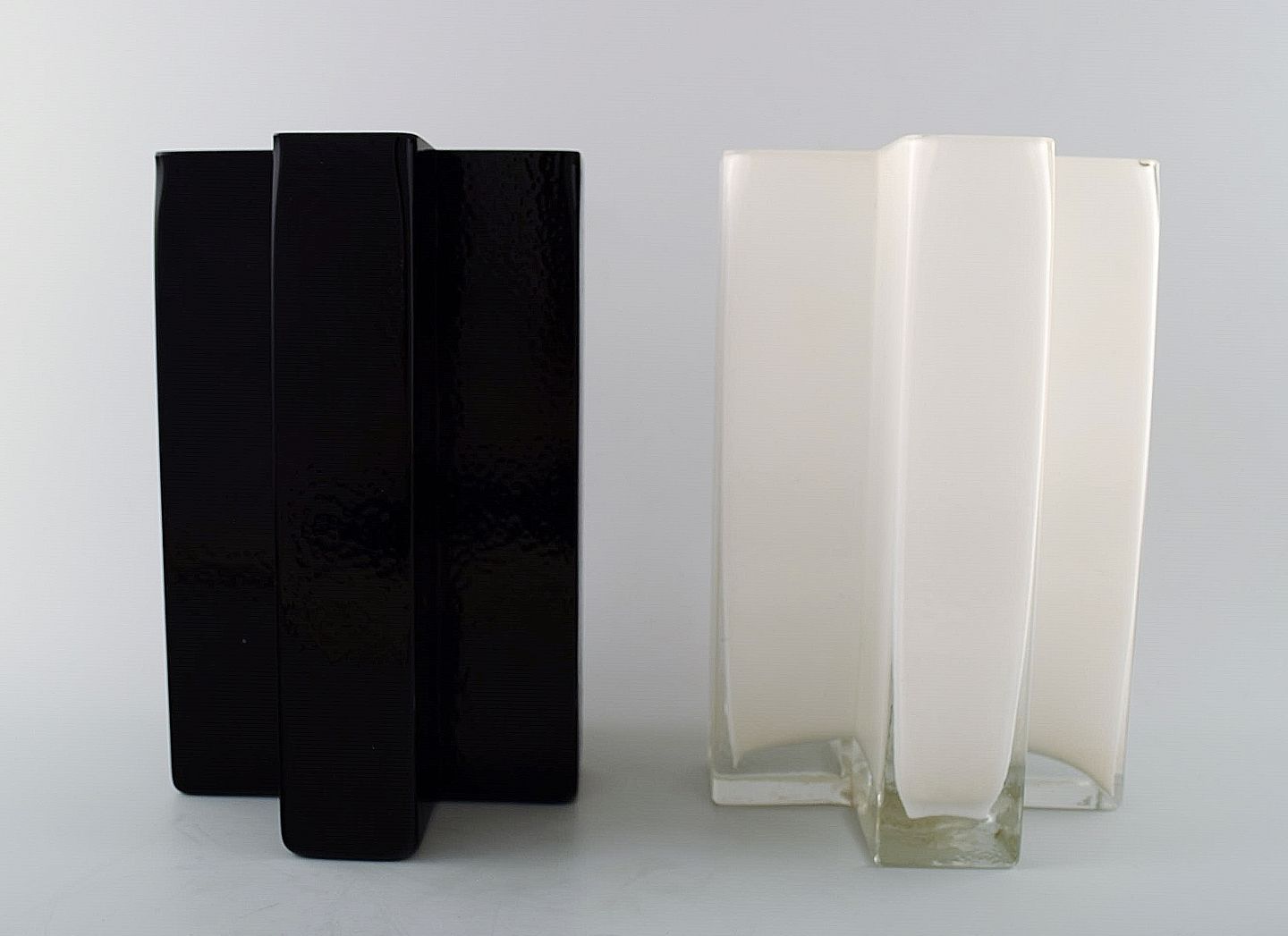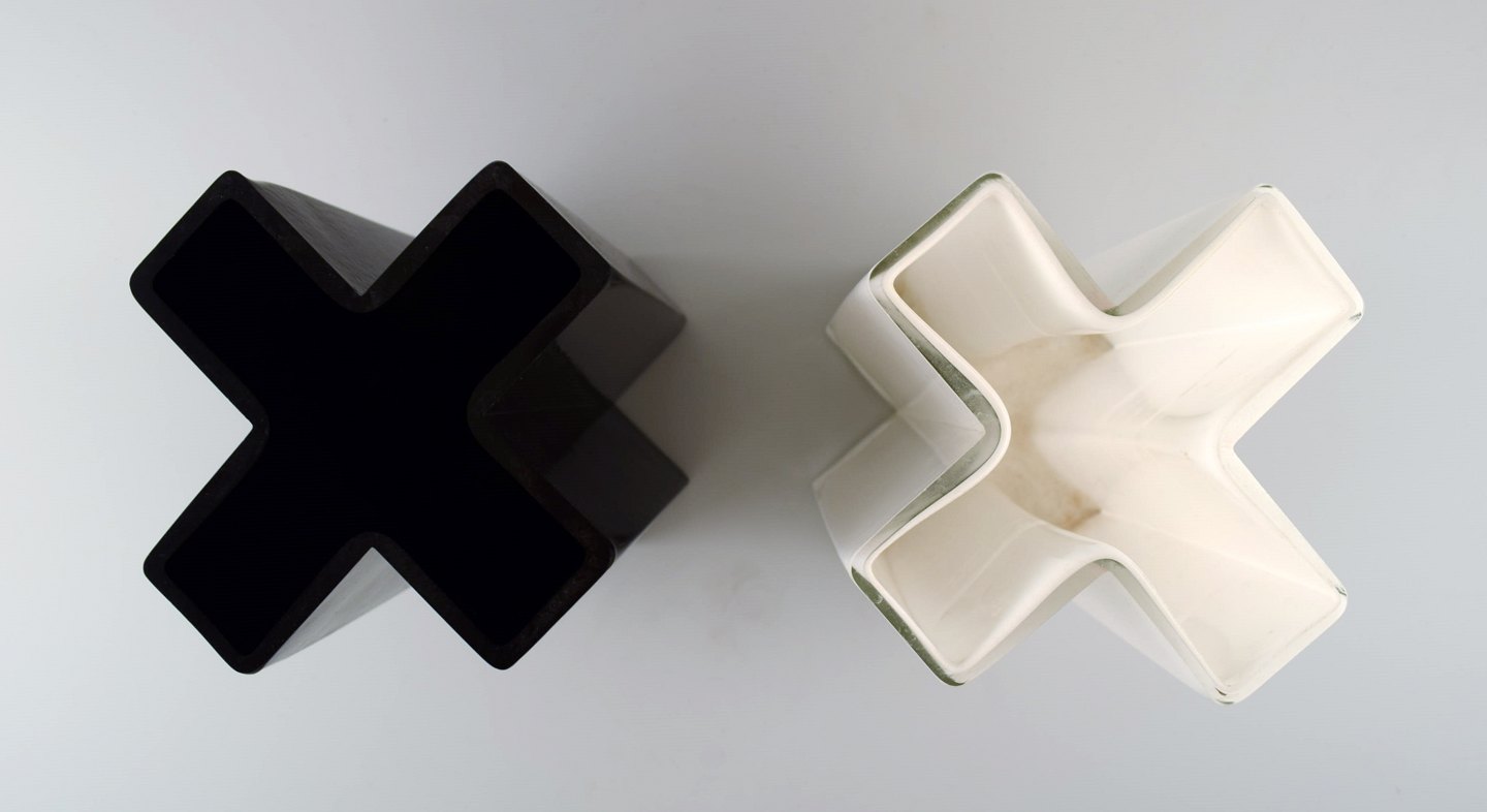 Bodil Kjær. 'Cross' vases of white and black art glass. Produced by Gullaskruf Sweden for Torben Ørskov & Form & Color. 1960s. Measures: 21.5 cm. x 14 cm.