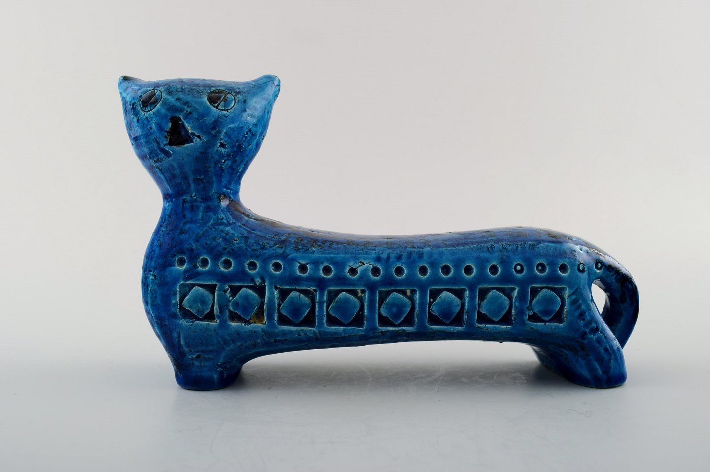 This 1960's Italian cat is one of our absolute favorite pieces designed by Aldo Londi, both for its wonderful lines and beautiful coloring. Featuring the famed Rimini Blu glaze, the pattern is simple, yet particularly bold. Furthermore, this piece showcases Londi's much loved cat design, which has become a classic of Mid Century design. mark (Flavia was Bitossi's original name). Sure to become a highlight in your home, and one of your favorite pieces, this Mid Century Bitossi cat is the perfect addition to any Modern space!