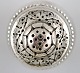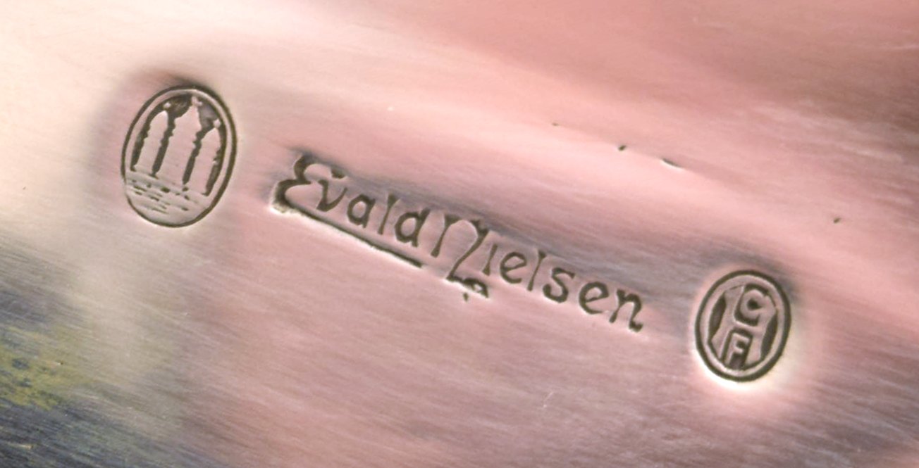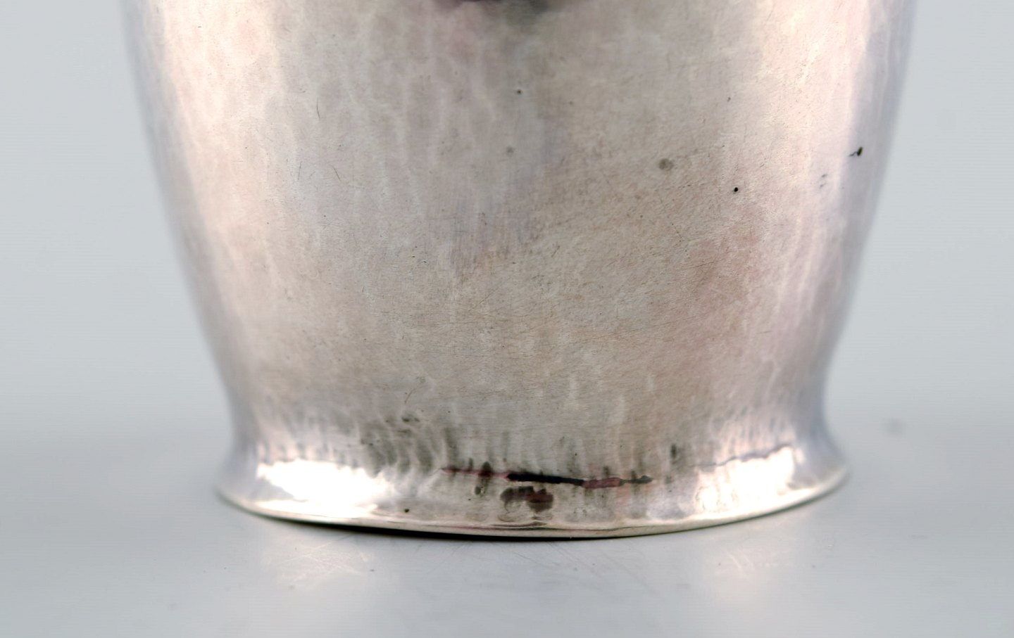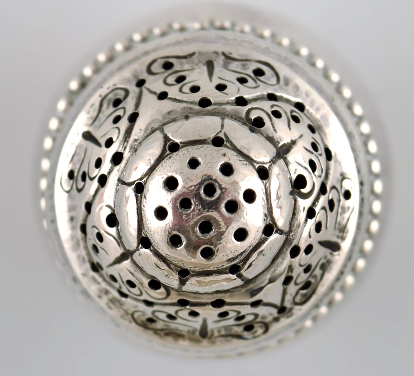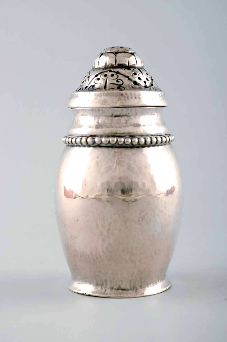 Saltbøsse, udført hos Evald Nielsen af hammerslået sølv med organisk ornamentik. Stemplet. Ca. 1920. Højde : 8,5 cm. I flot stand.