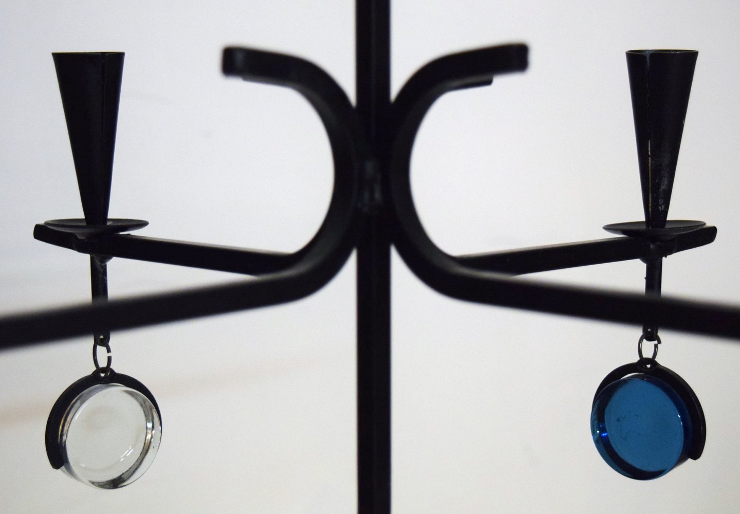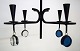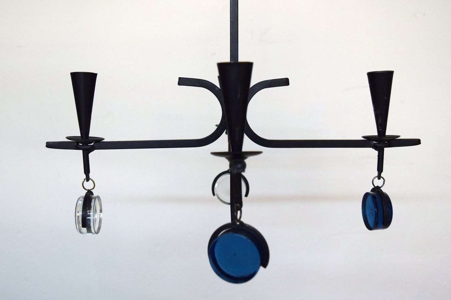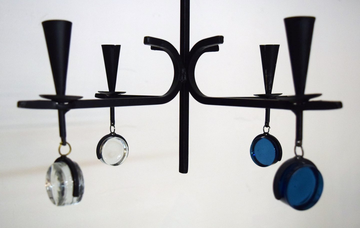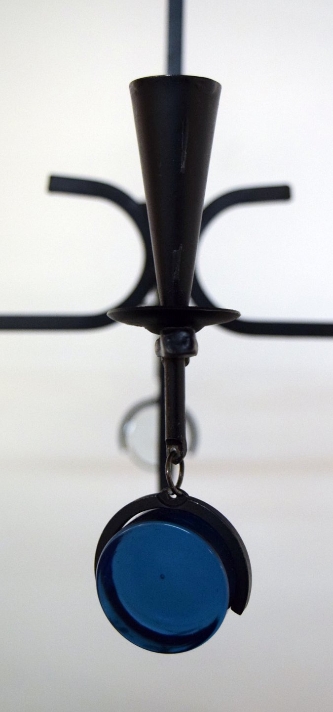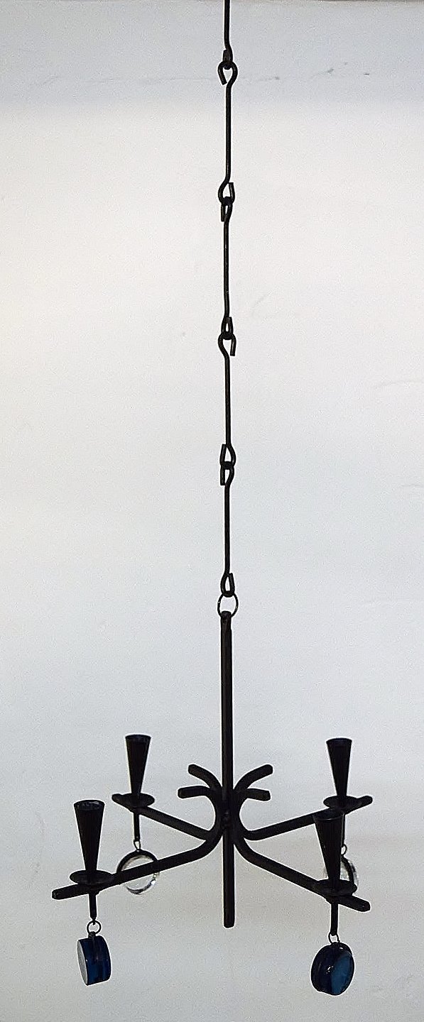 Erik Höglund for Kosta Boda. Sverige 60/70´erne. Firearmet lysekrone af støbejern med løse mundblæste kunstglas. Diameter 37,5 cm. Højde 30 cm. Medfølges af ophæng. I perfekt stand.