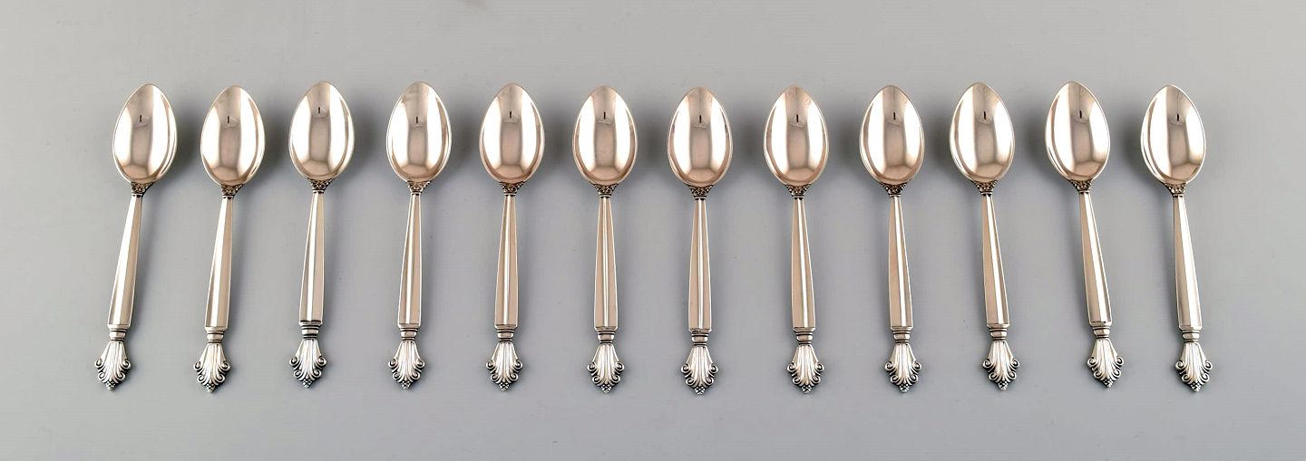 Twelve Georg Jensen Acanthus Sterling silver, tea spoons. Measures 14.5 cm. Marked In very good condition.