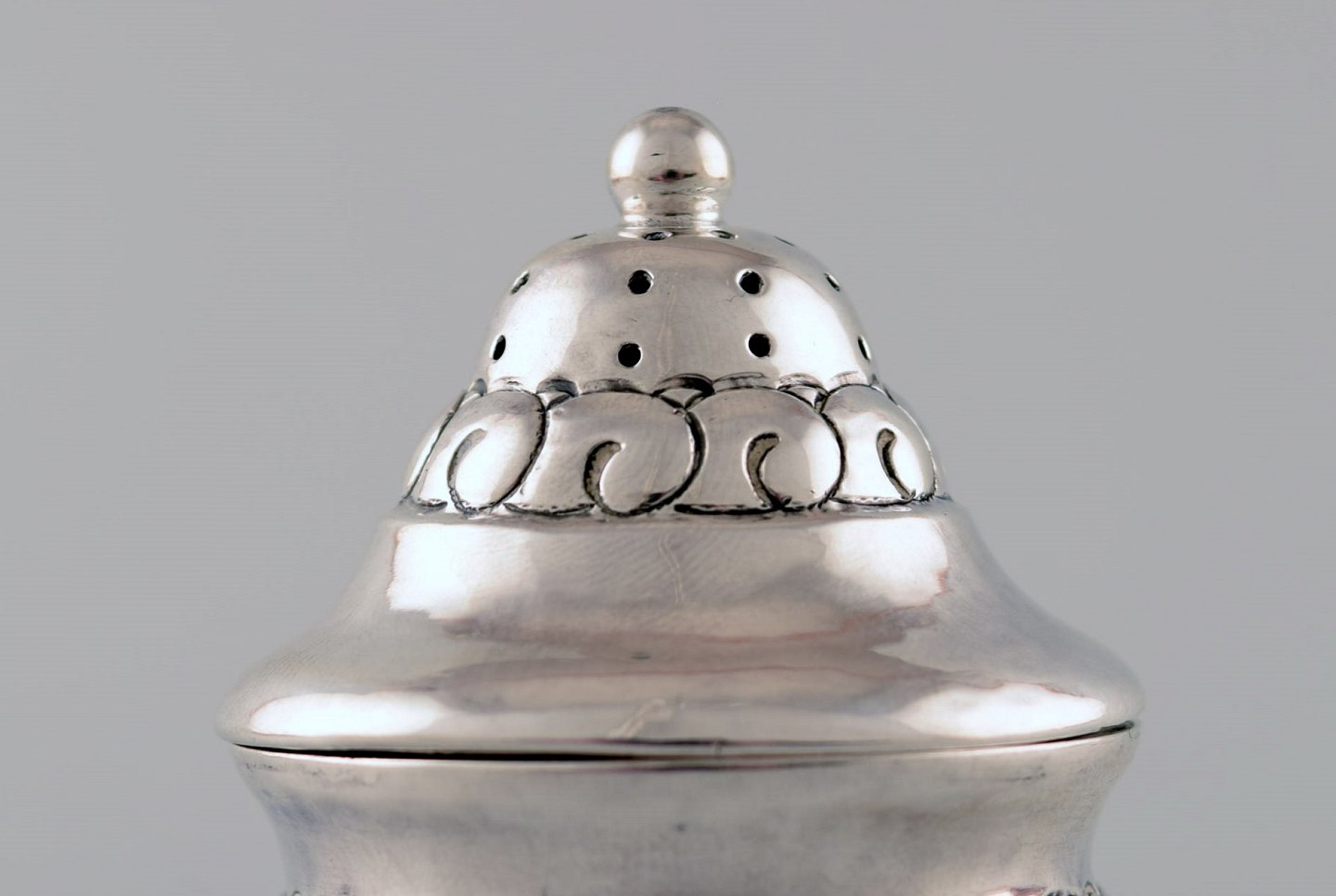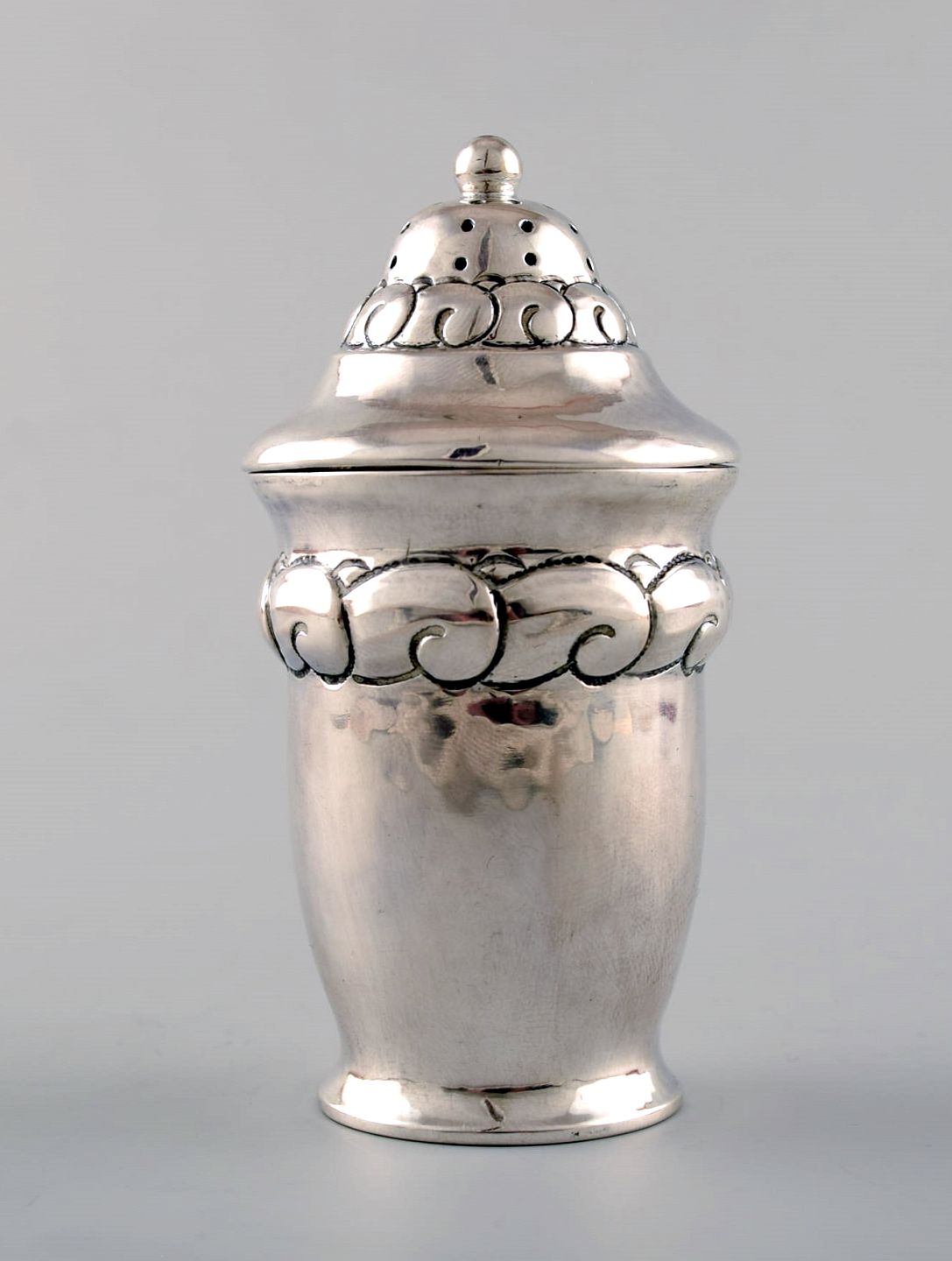 Saltbøsse, Heimbürger, dansk skønvirke i sølv med ornamentik. Stemplet. 1917. CHF. Christian. Fr. Heise. Højde : 8,5 cm. I flot stand.