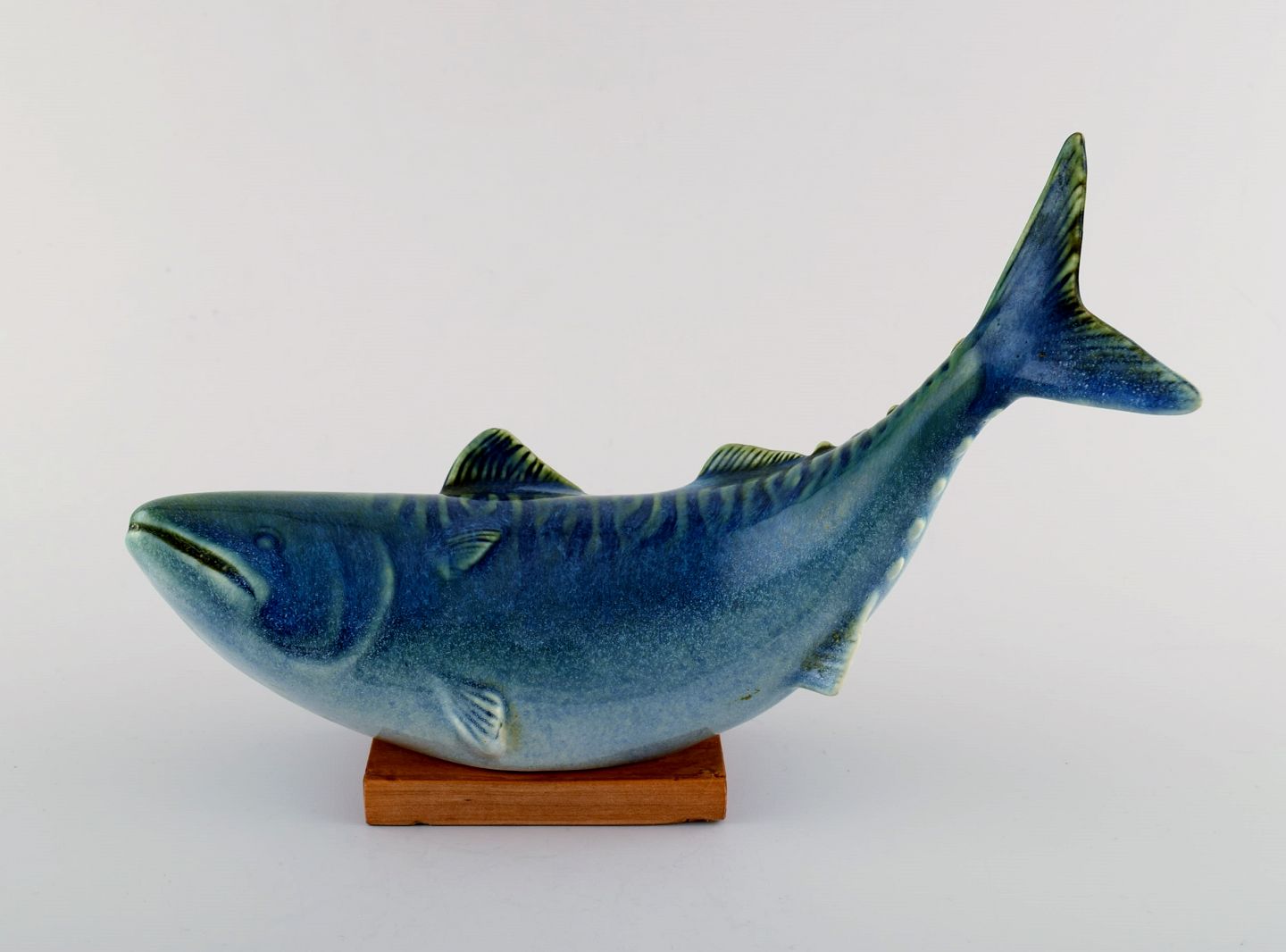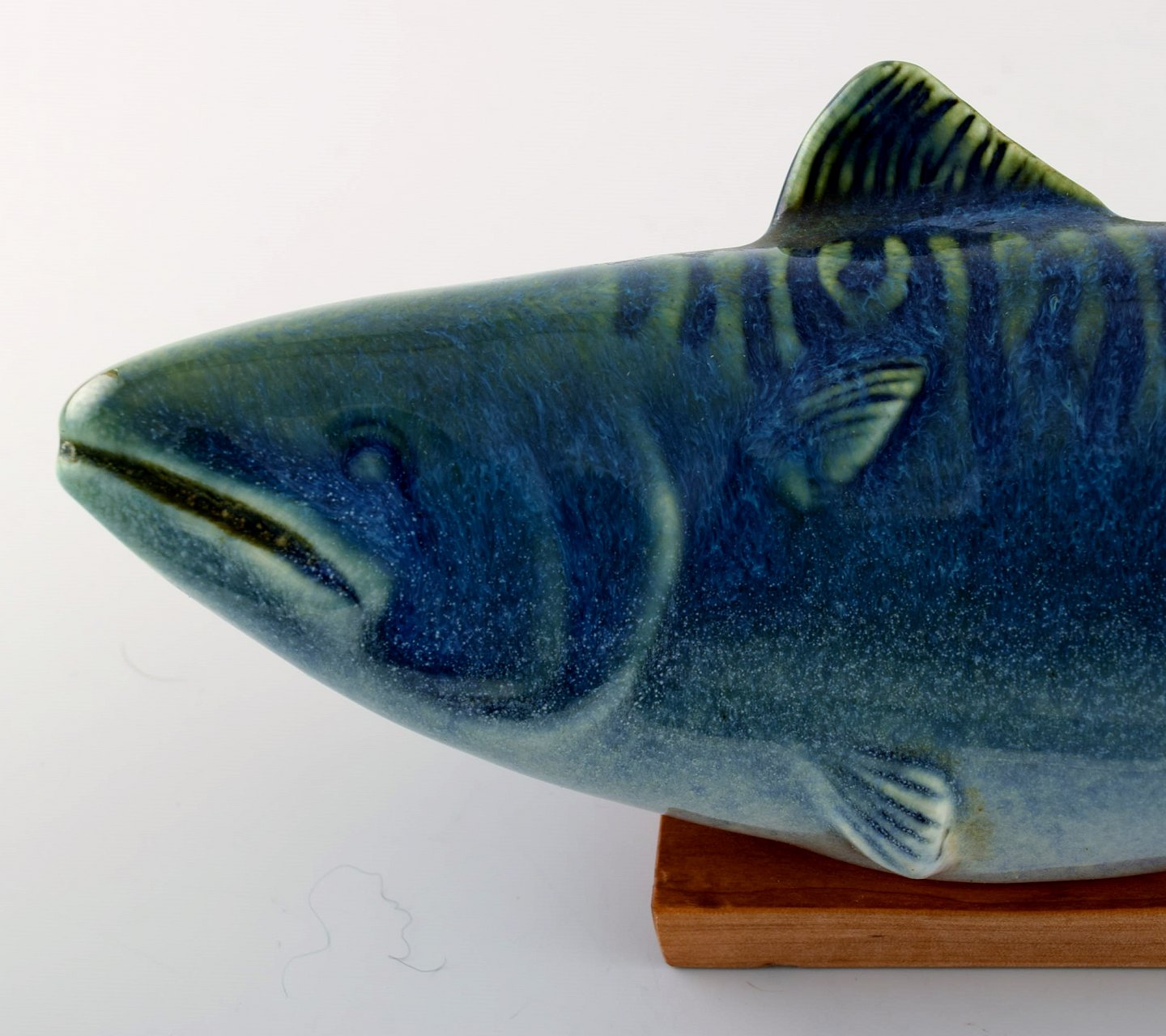 Unique Sven Wejsfelt "stim 8" fish on wooden plinth. stoneware. Beautiful glaze. Signed. In perfect condition. Measures 26 x 11 cm.