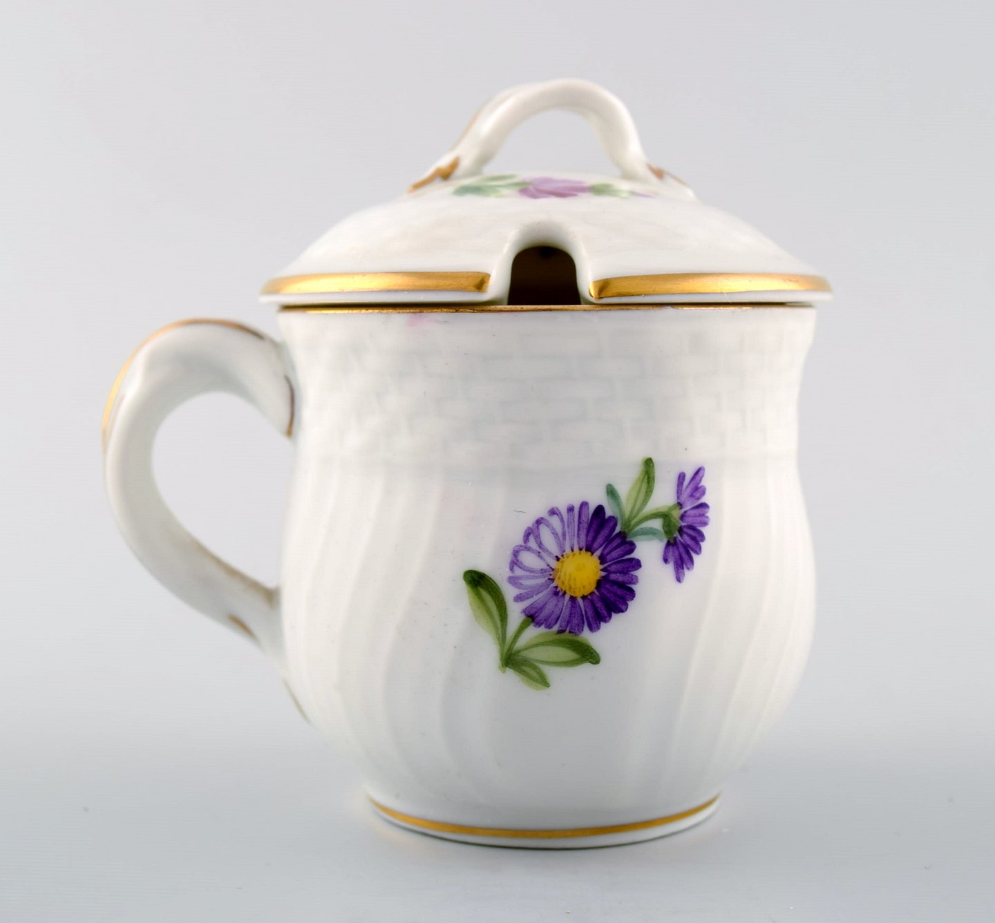 Royal Copenhagen Let Saksisk Blomst, sennepskrukke med låg. Dekorationsnummer 493/1594. 1. sortering. Måler 8,5 cm. x 6,5 cm. u/hank. Perfekt stand.