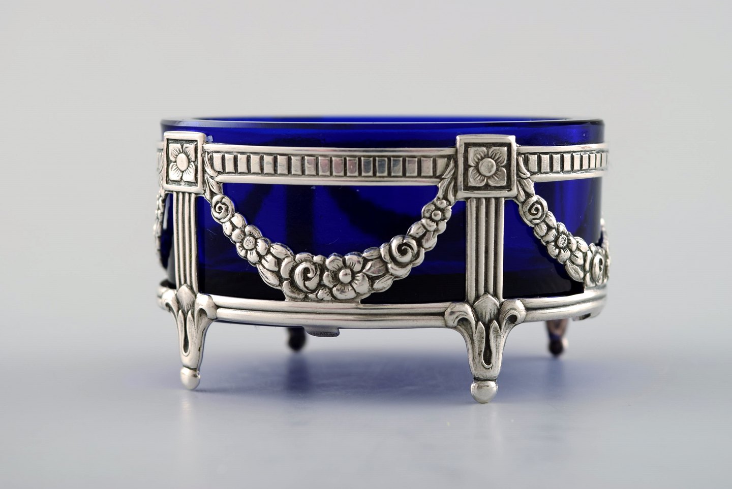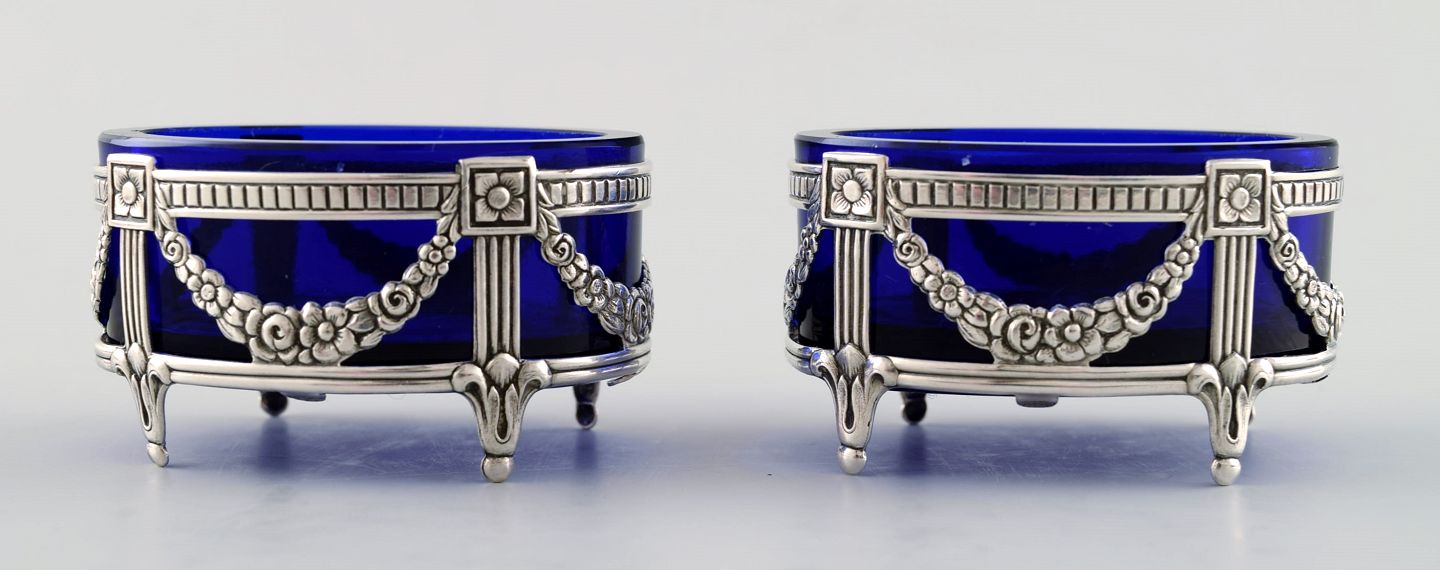 A pair of English salt vessels with glass inserts in English silver. Stamped. Ca. 1900. Measures: 5.5 cm. x 3 cm. In very good condition.