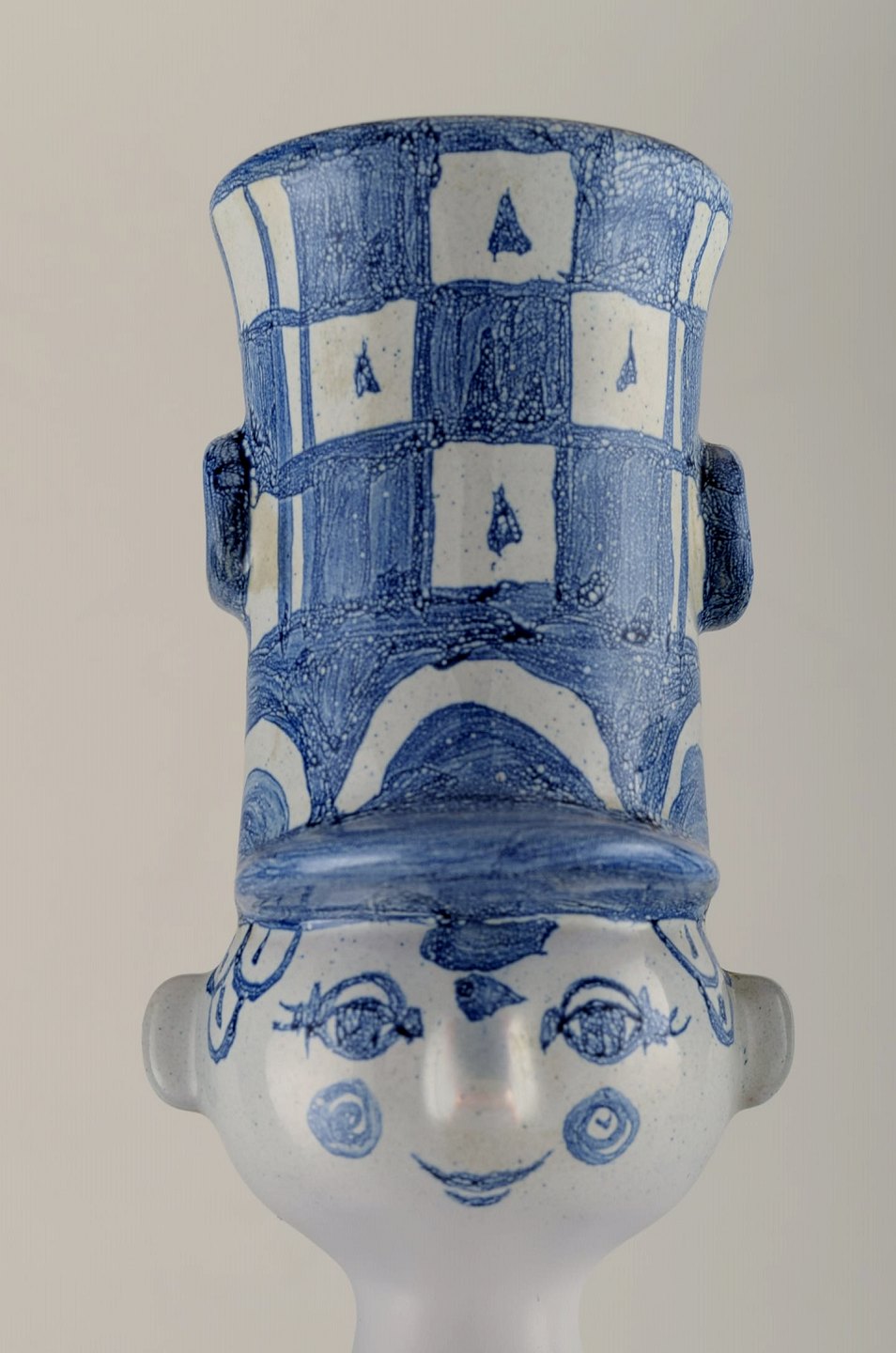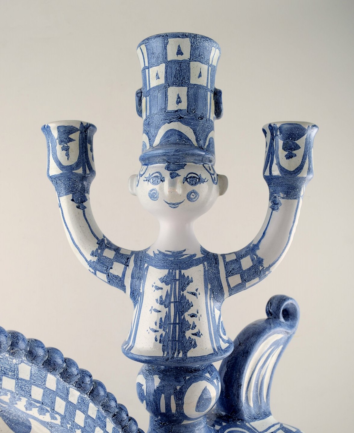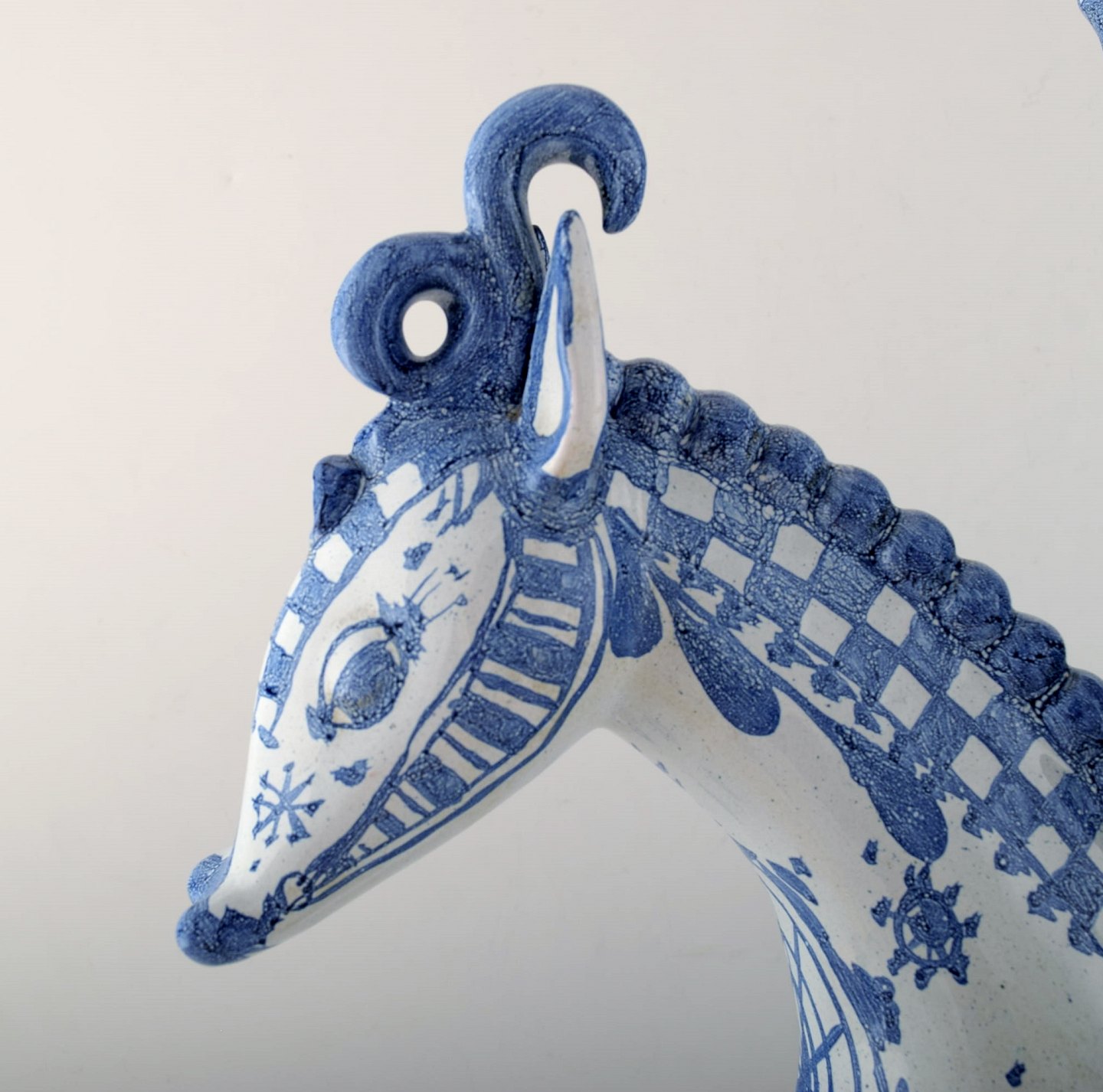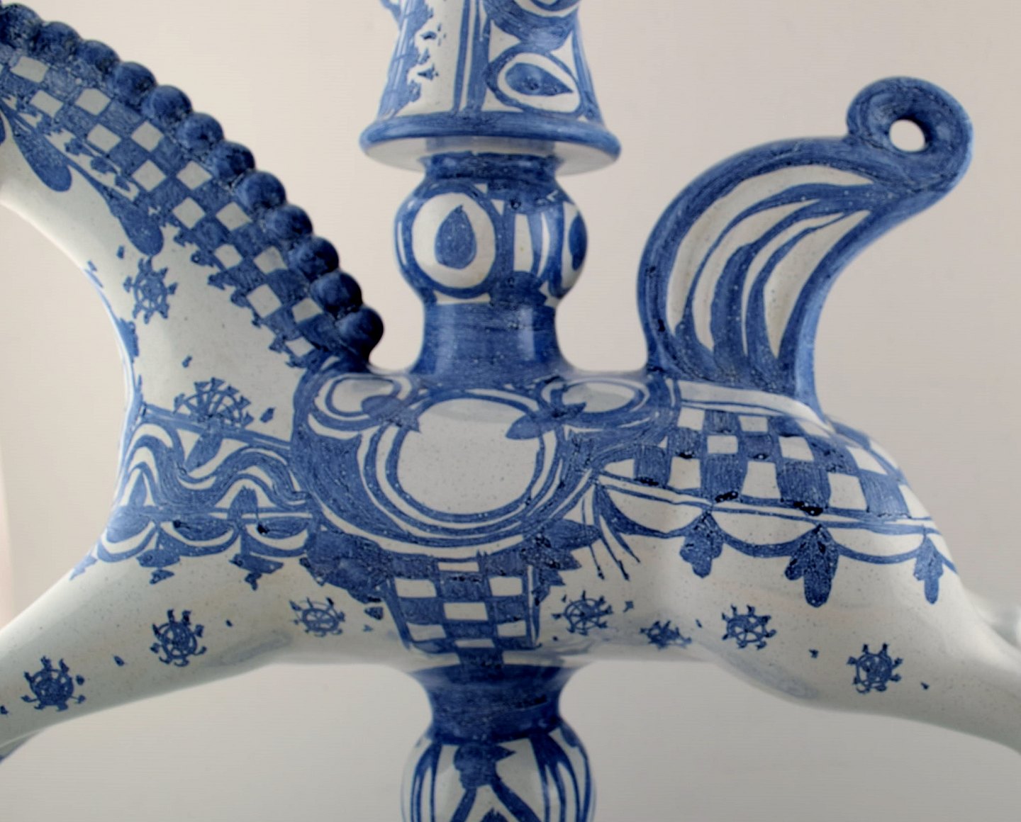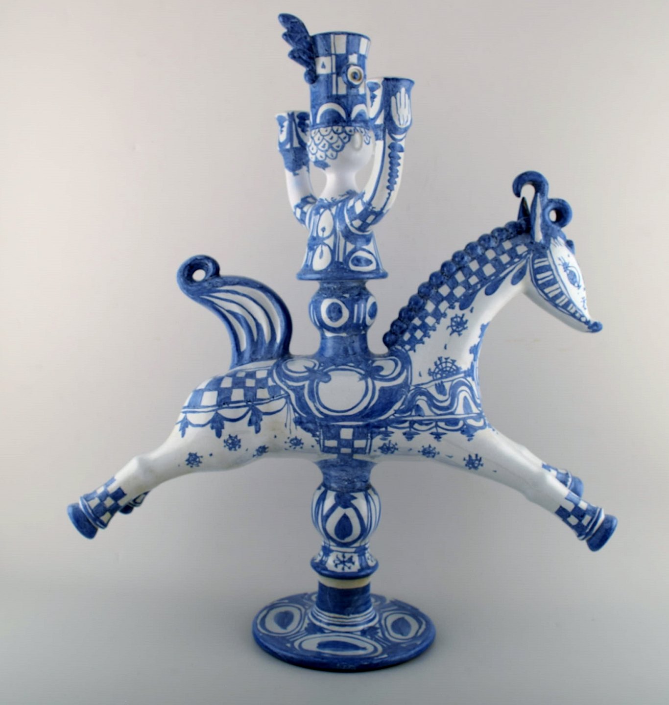 Kæmpestor Bjørn Wiinblad keramikfigur fra det blå hus. Figur / lysestage rytter til hest med plads til tre lys. Dekorationsnummer L22. Denne er fra 1975. Højde 62 cm., længde 50 cm. Perfekt stand.