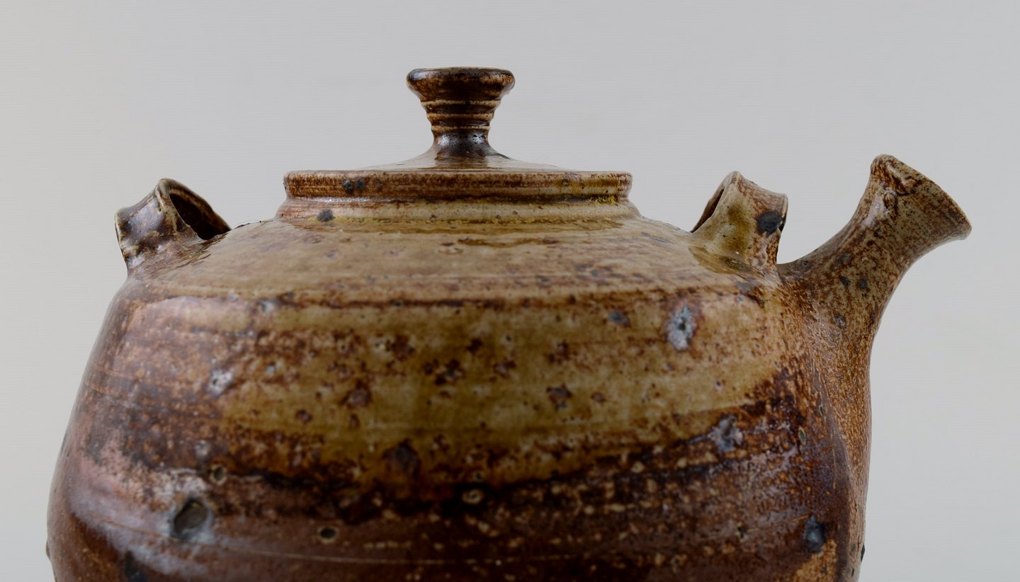 Jean Linard: b. Le Marche 1931, d. Bourges 2010. Stoneware teapot decorated with dark brown and olive green glaze. Signed Linard 64. Unique. Measures : 16 cm. x 15 cm. incl. the handle. In perfect condition.