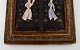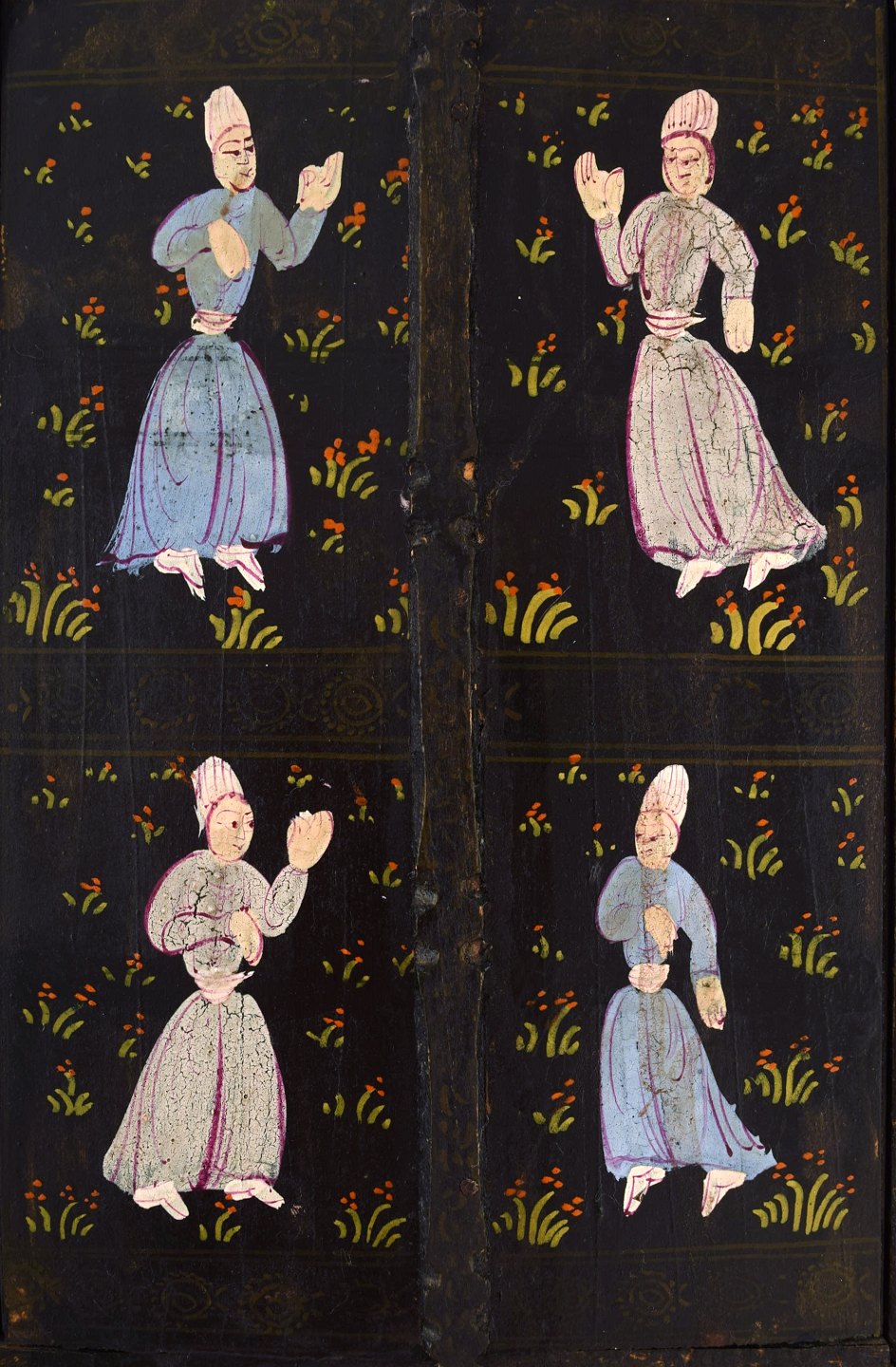 Antique Persian travel mirror, intarsia work, dancing people, 19th century.