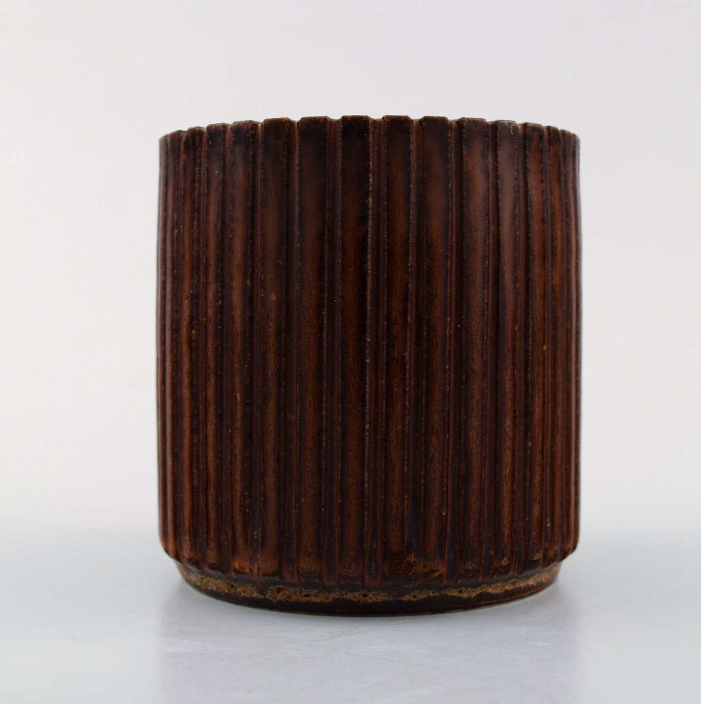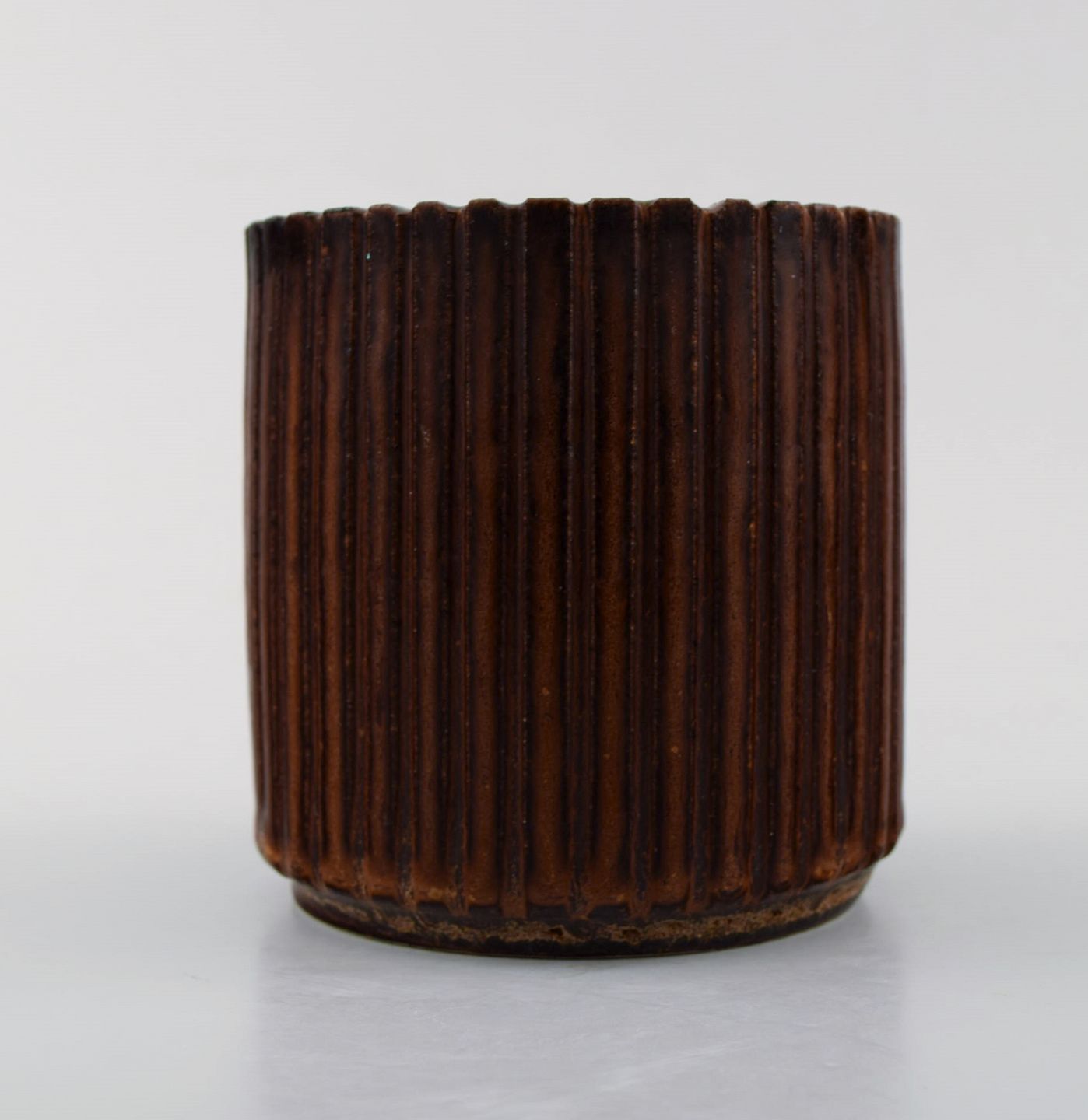 Arne Bang. Keramik vase. Mærket AB. Smuk glasur i brune nuancer. I perfekt stand. Måler 8,5 cm. x 8 cm.