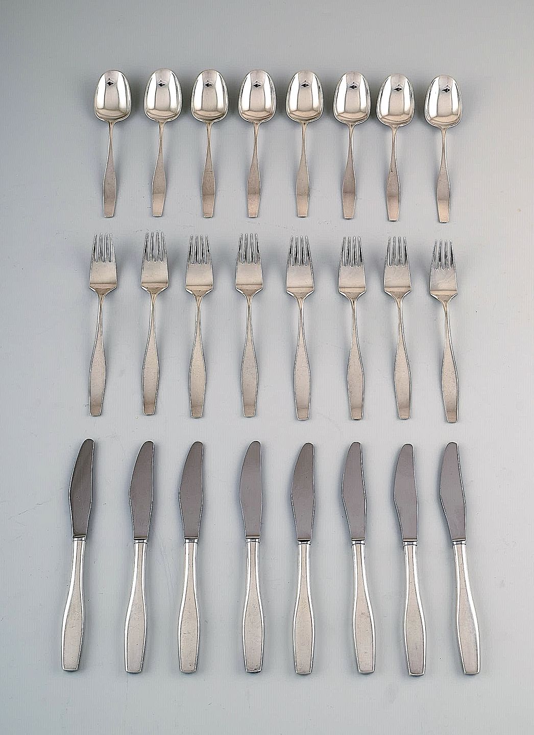 Hans Hansen "Charlotte" sølvbestik i sterlingsølv. Komplet service til otte personer. I alt 24 dele. Kniv måler : 19 cm. Perfekt stand. Stemplet.