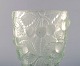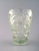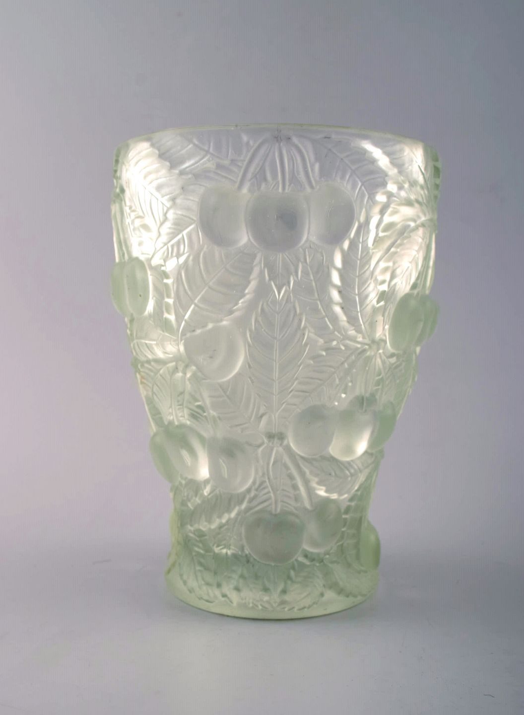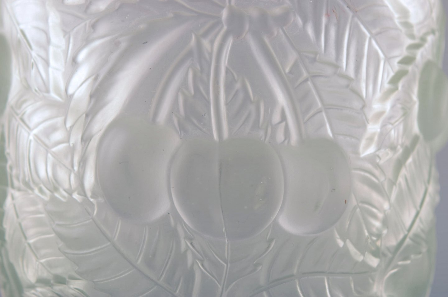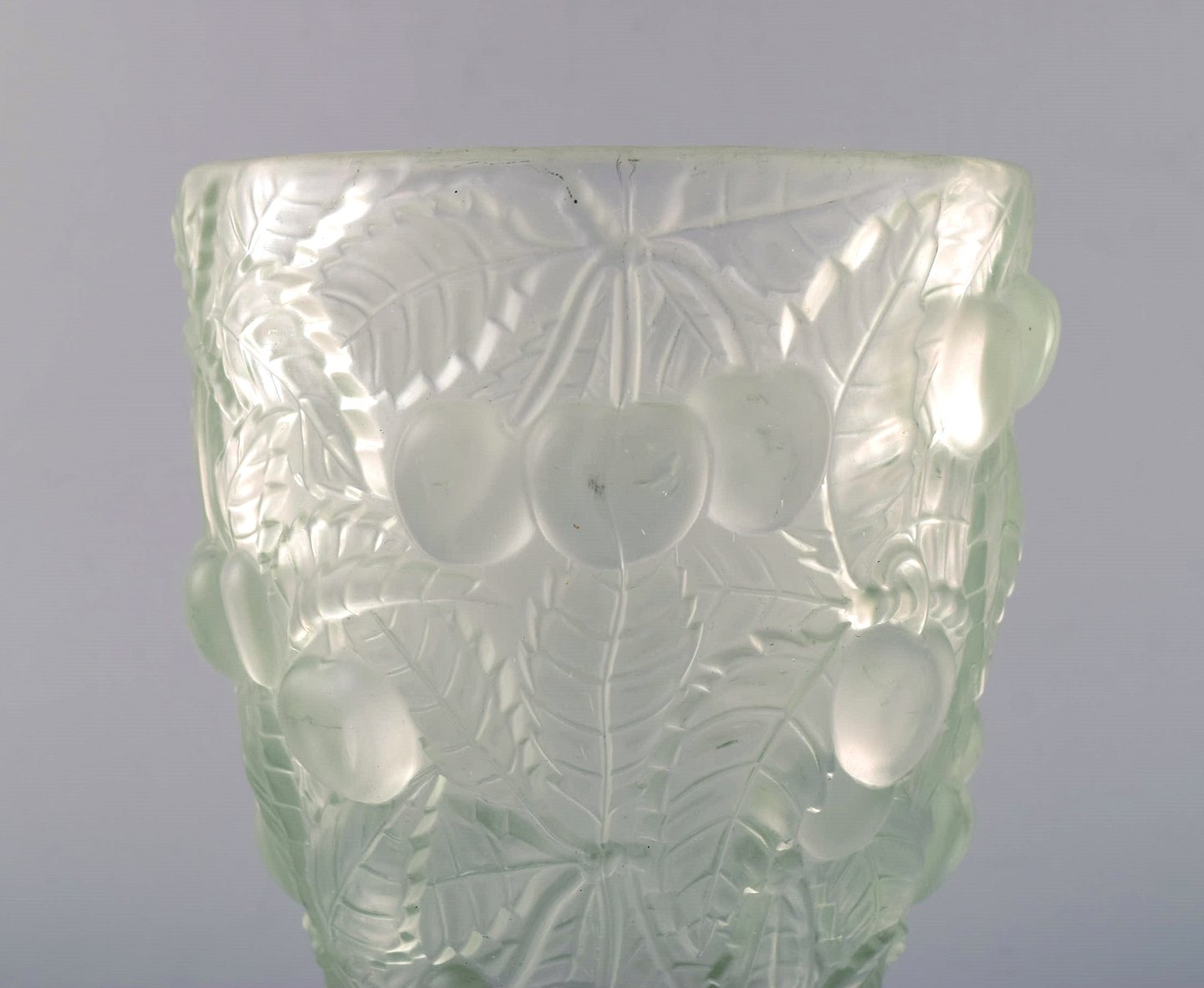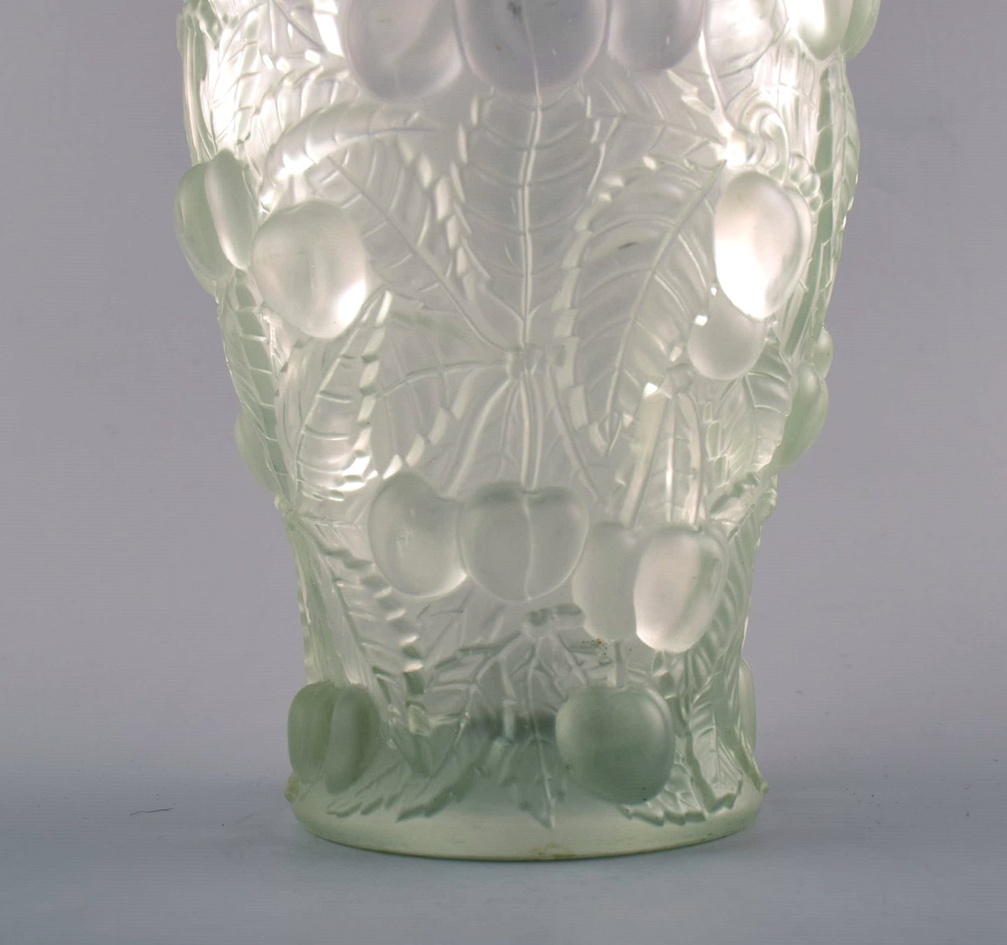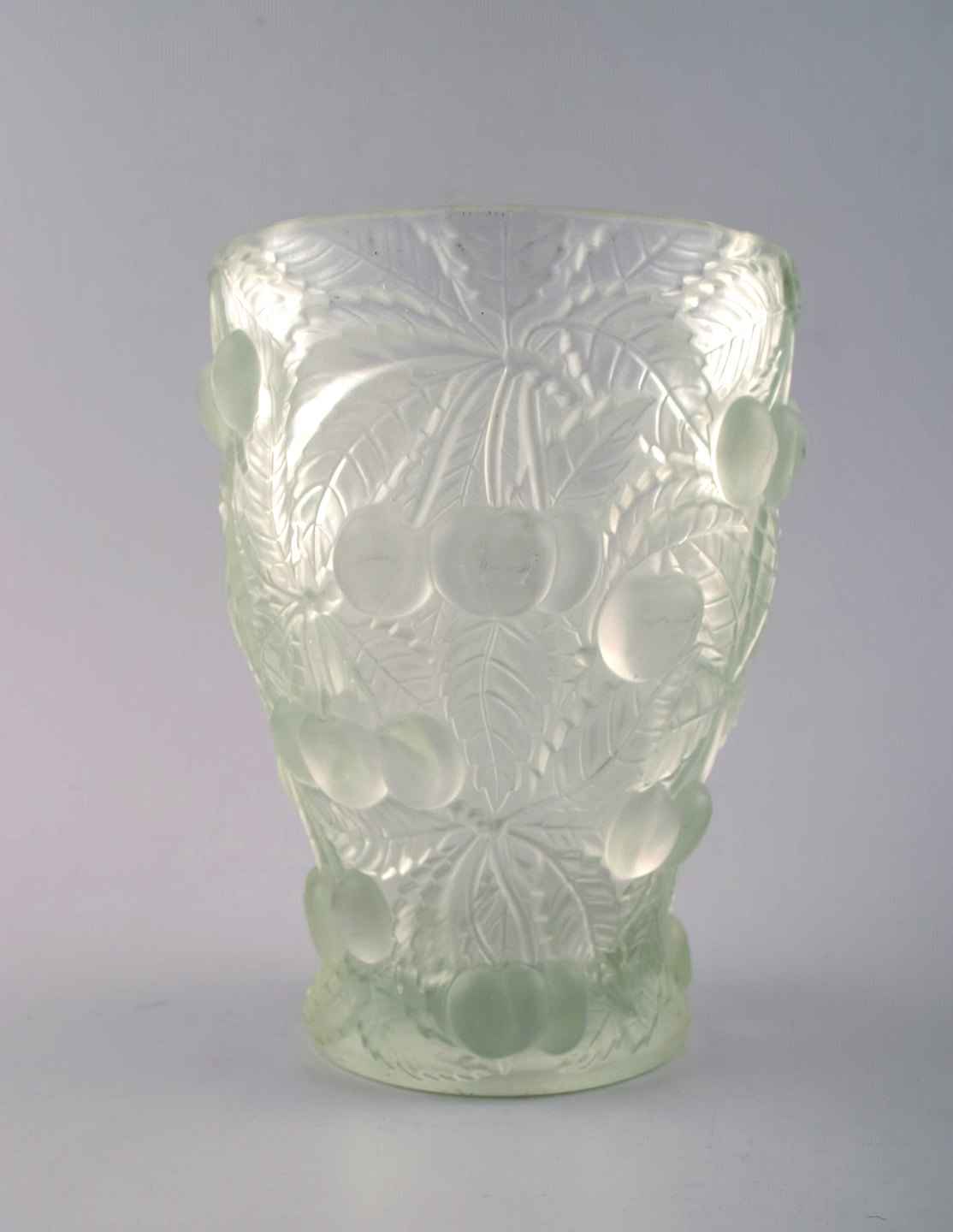 Lalique style art glass vase in clear glass with cherries in relief. 1950 s. Size: 18 cm. high. 13 cm. in diameter. In perfect condition.