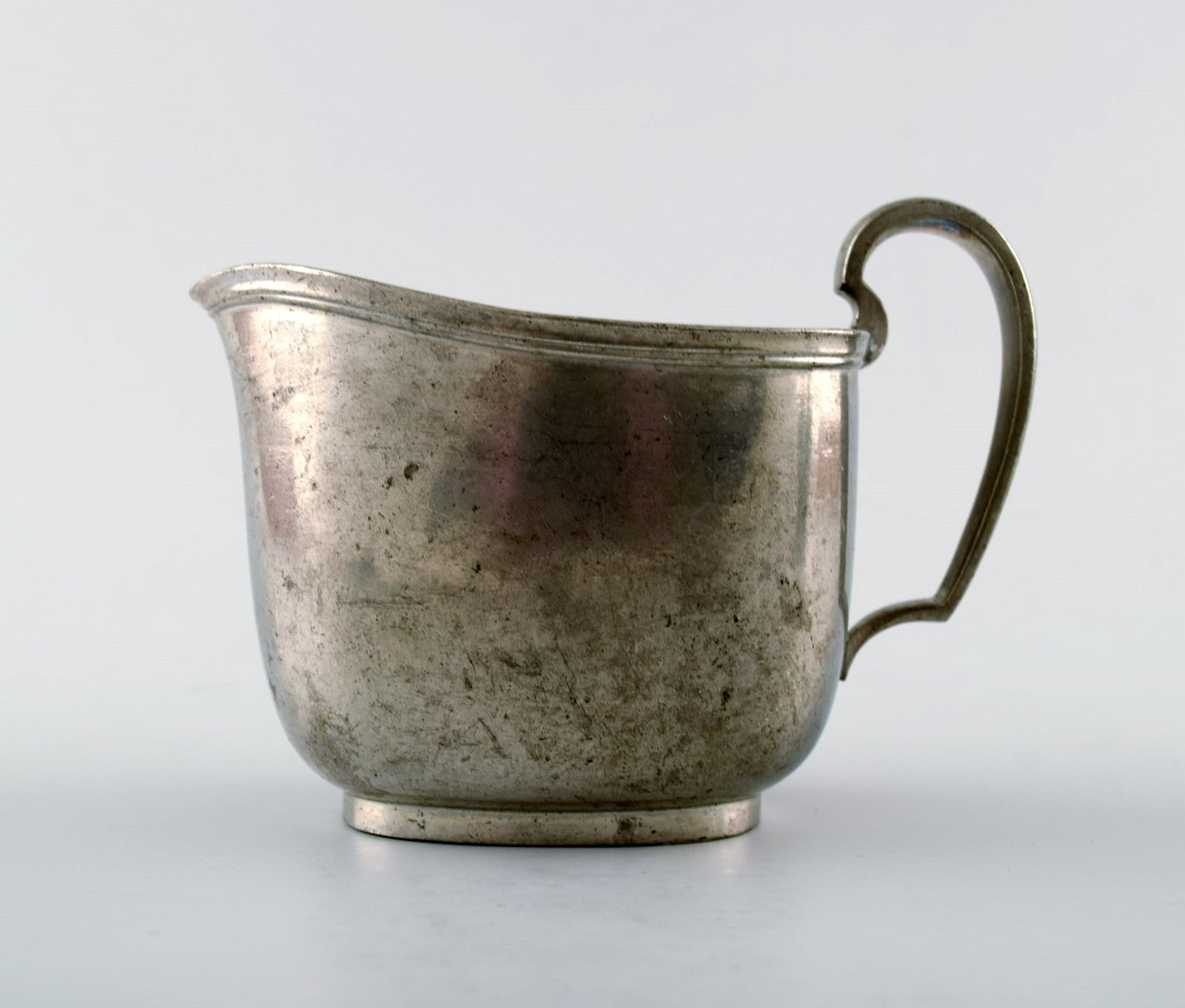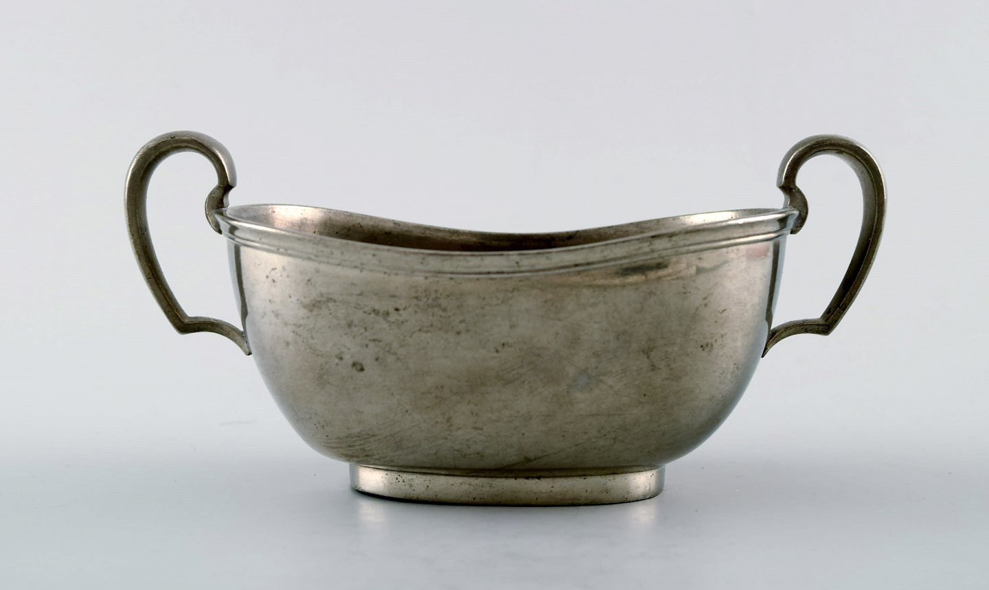 Just Andersen art deco, creamer/sugar set and bowl with hank in pewter. Marked. In very good condition. The bowl measures 17 cm. x 14 cm. x 9 cm. incl. handle.
