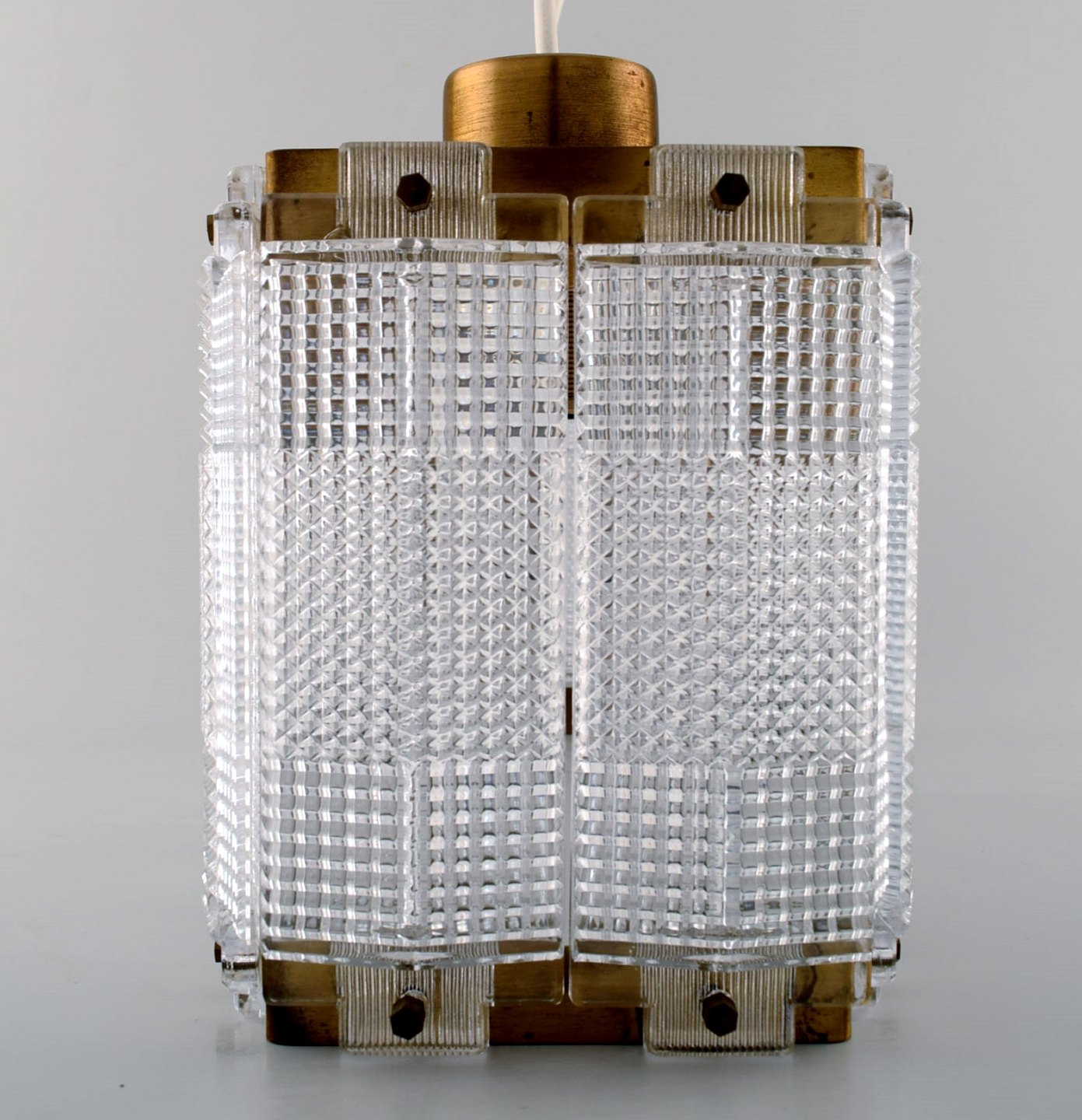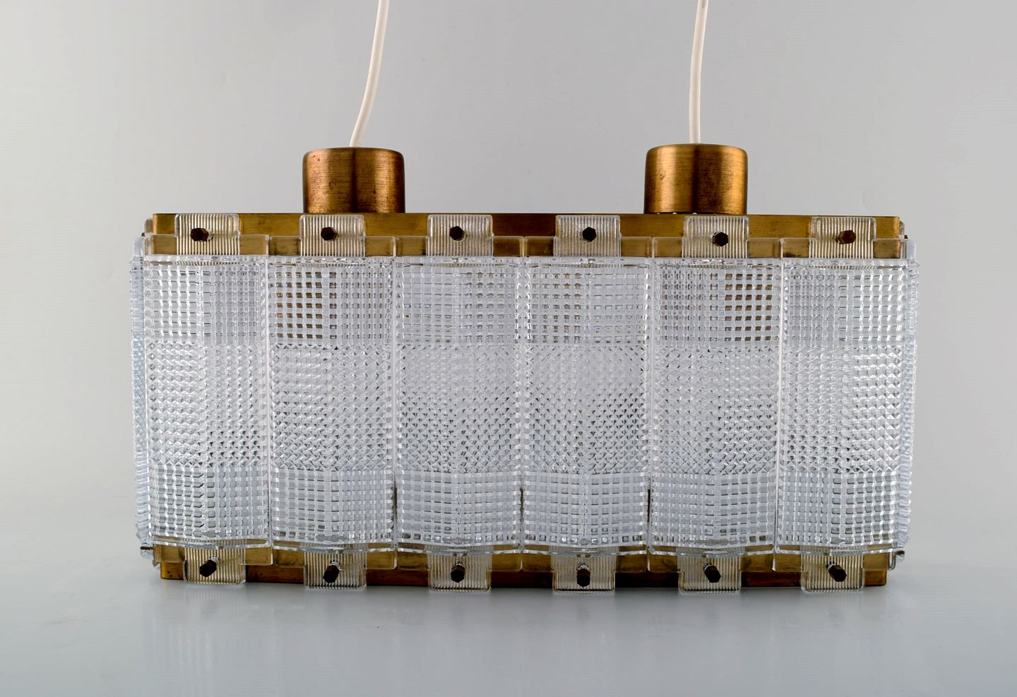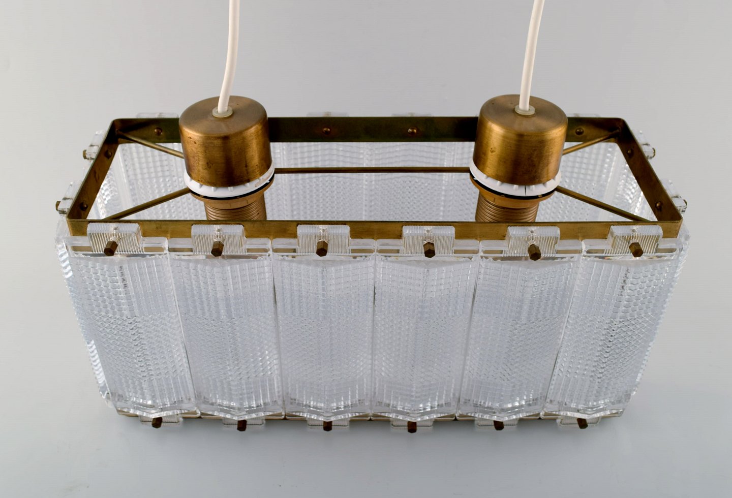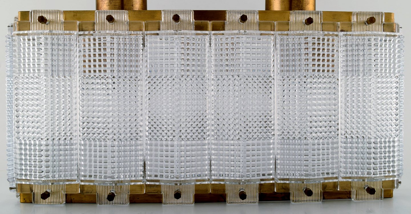 Carl Fagerlund for Orrefors ceiling lamp in art glass with brass fittings. In perfect condition. Measures: 28 cm. x 18 cm. x 15 cm.