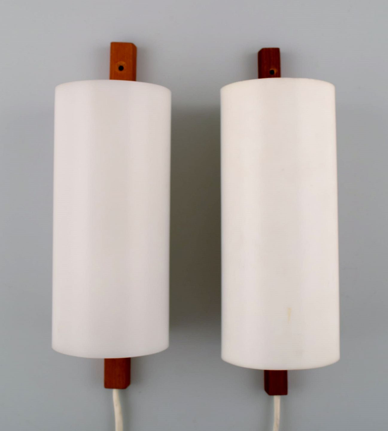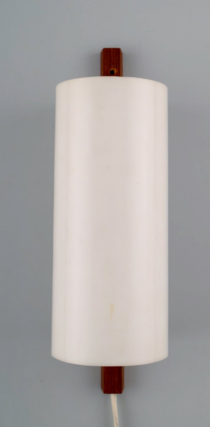 HANS-AGNE JAKOBSSON, et par væglamper, 1960´erne, skærme i hvidt akrylplast. Måler : 28,5 cm. x 8,5 cm. I perfekt stand. Mærkat.