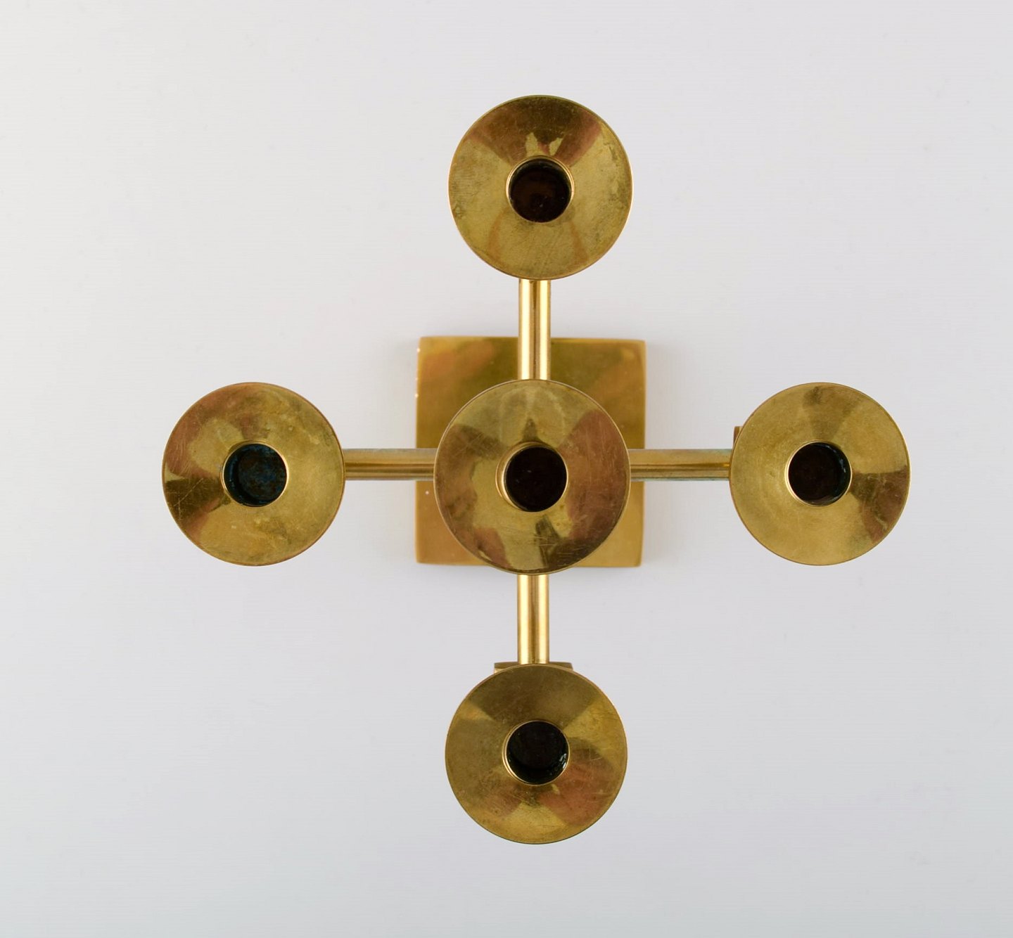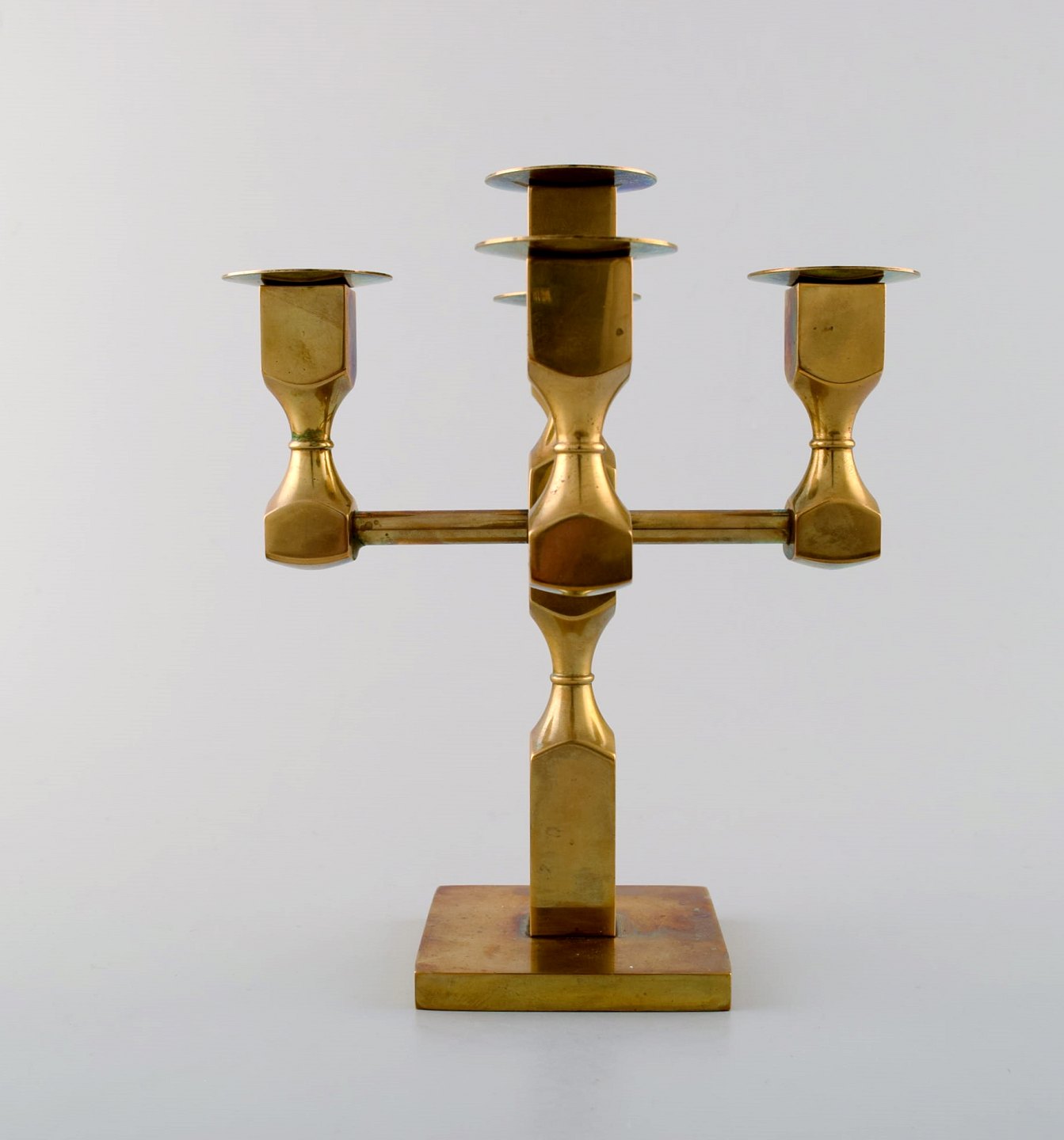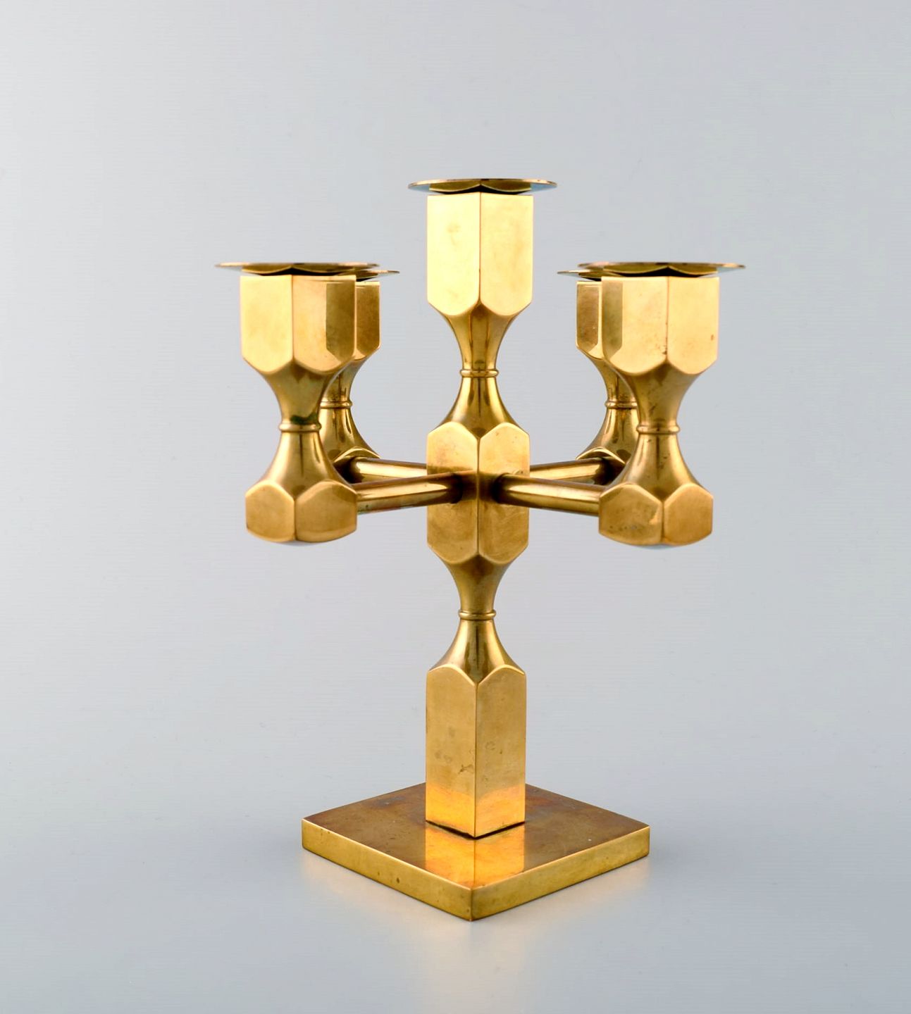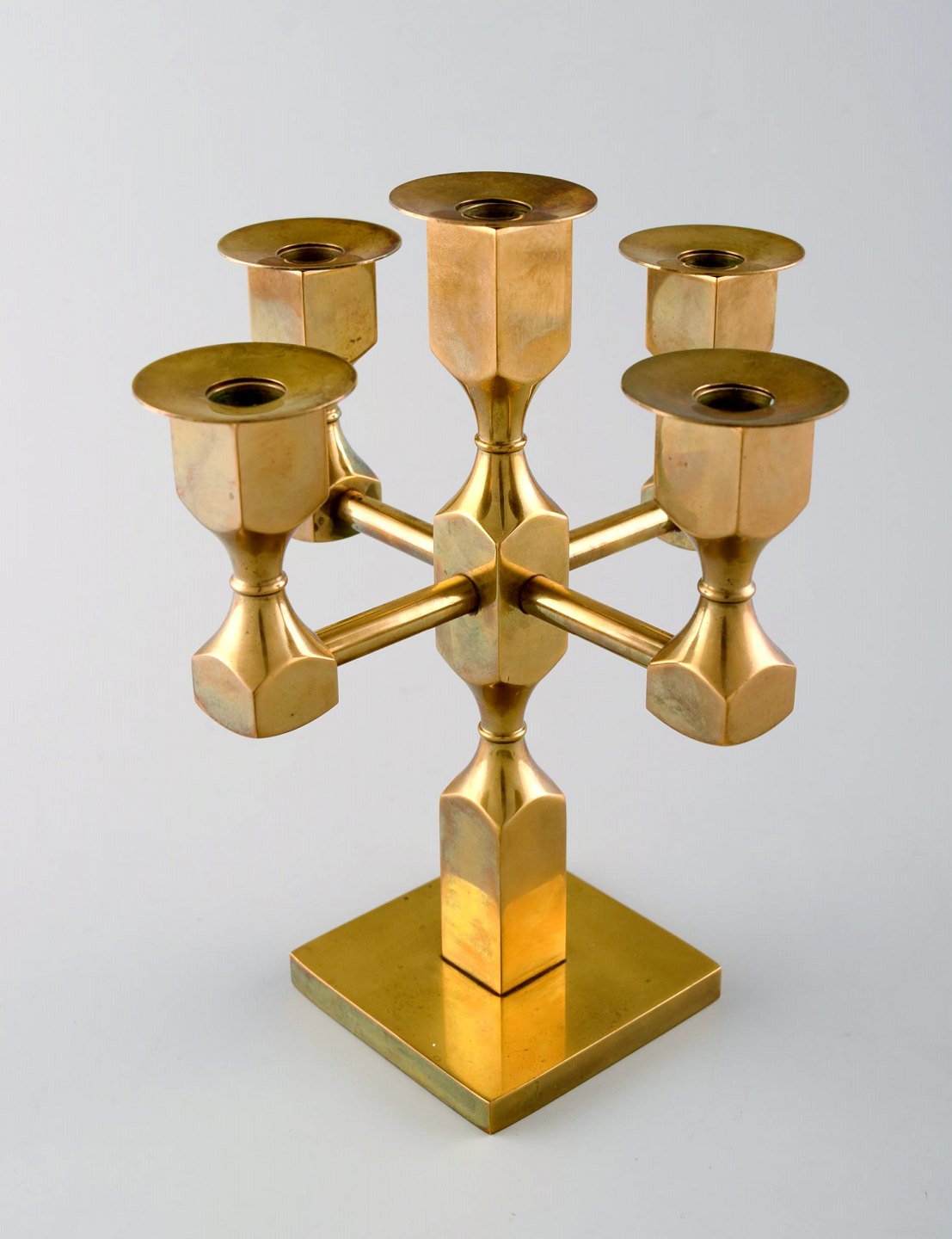 Gusum metal, lysestage i messing til fem lys med løse lysmanchetter. Svensk design. Måler : 18 cm. x 14 cm. I perfekt stand.
