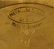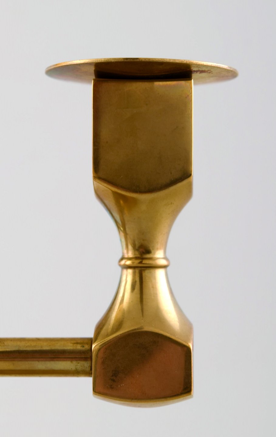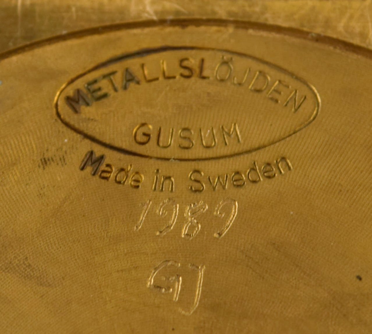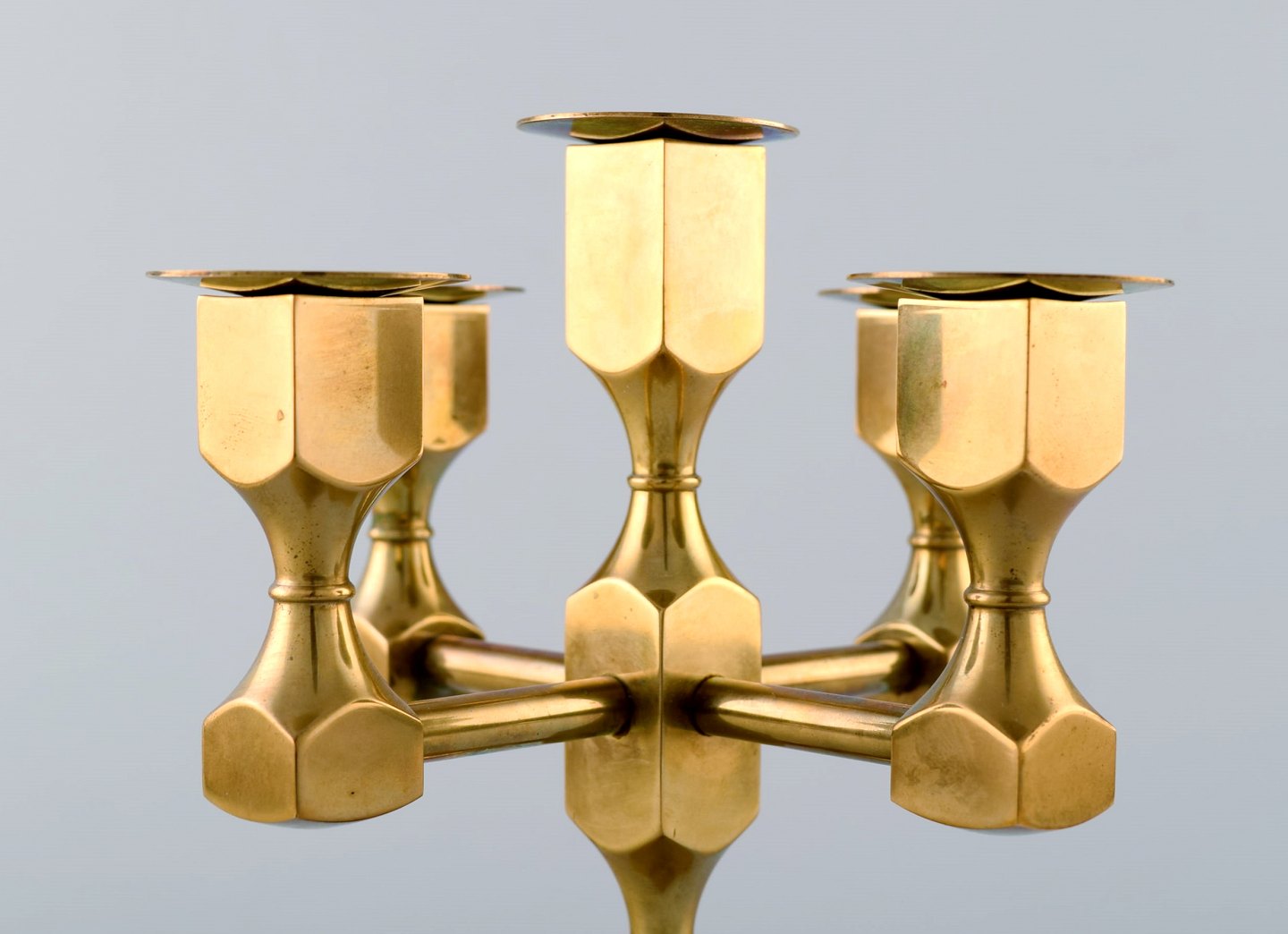 Gusum metal, lysestage i messing til fem lys med løse lysmanchetter. Svensk design. Måler : 18 cm. x 14 cm. I perfekt stand.