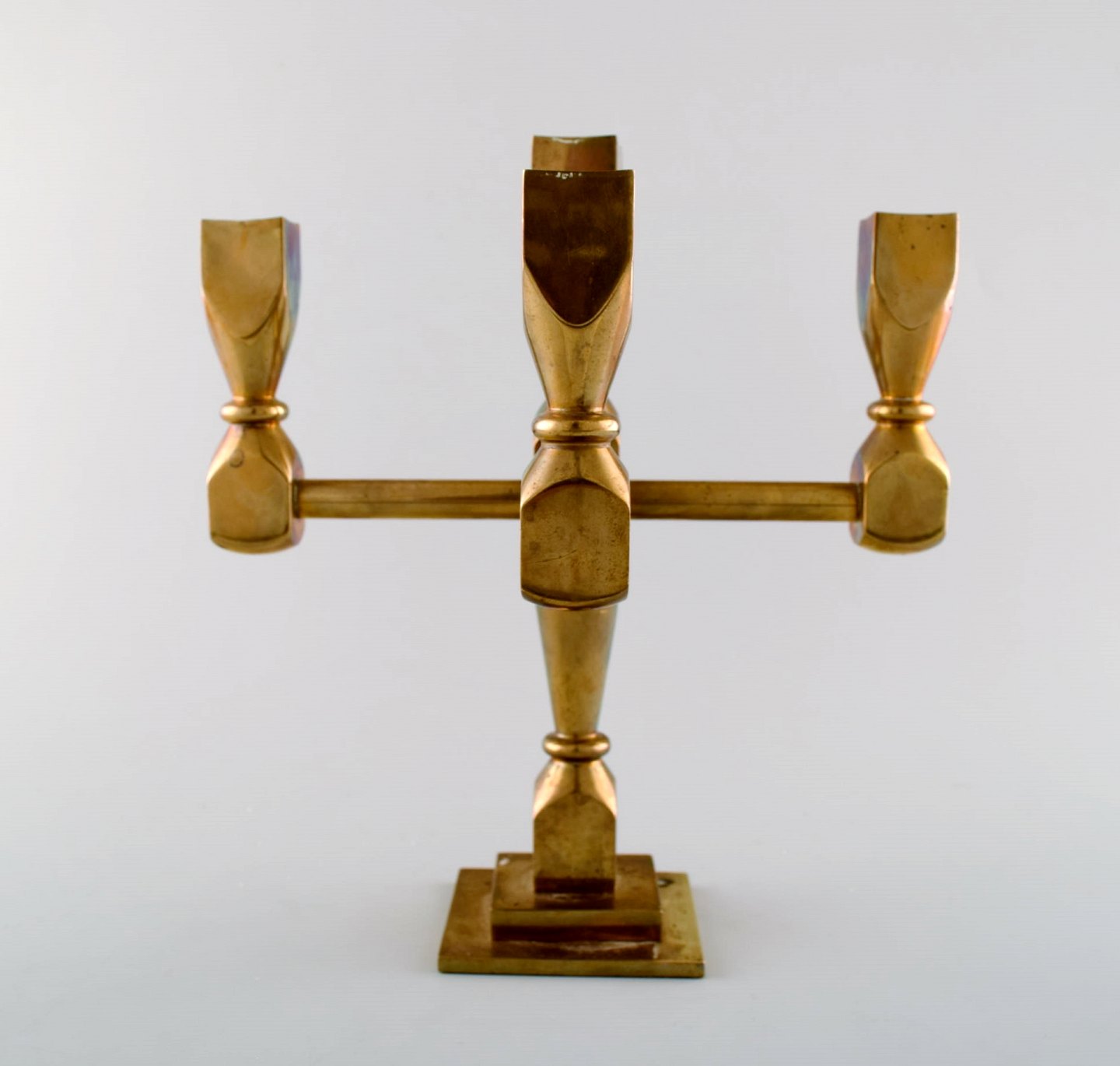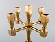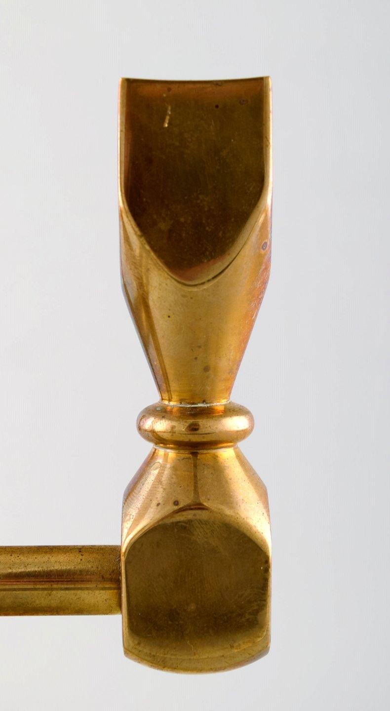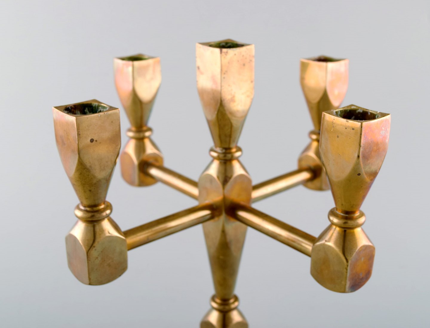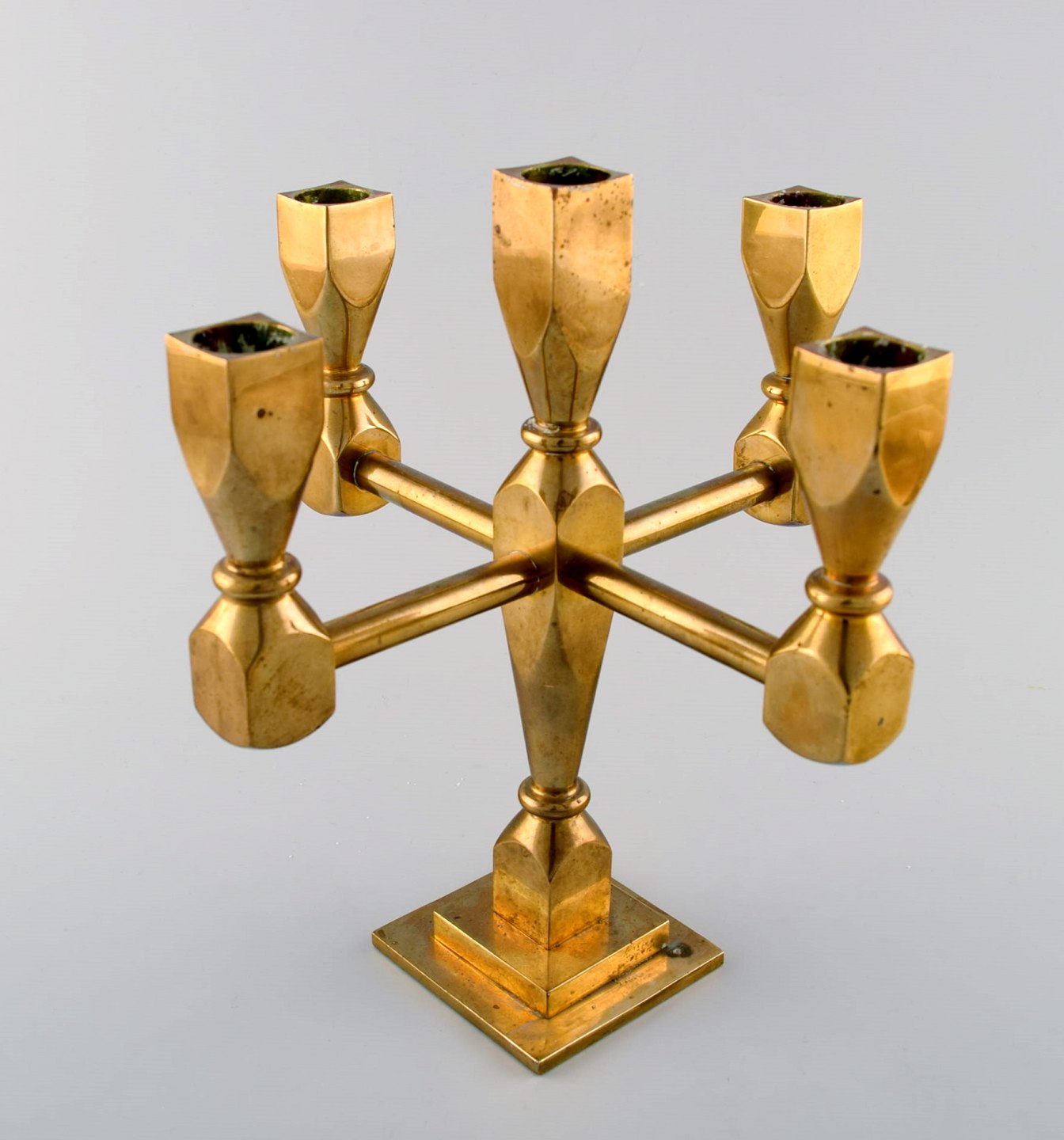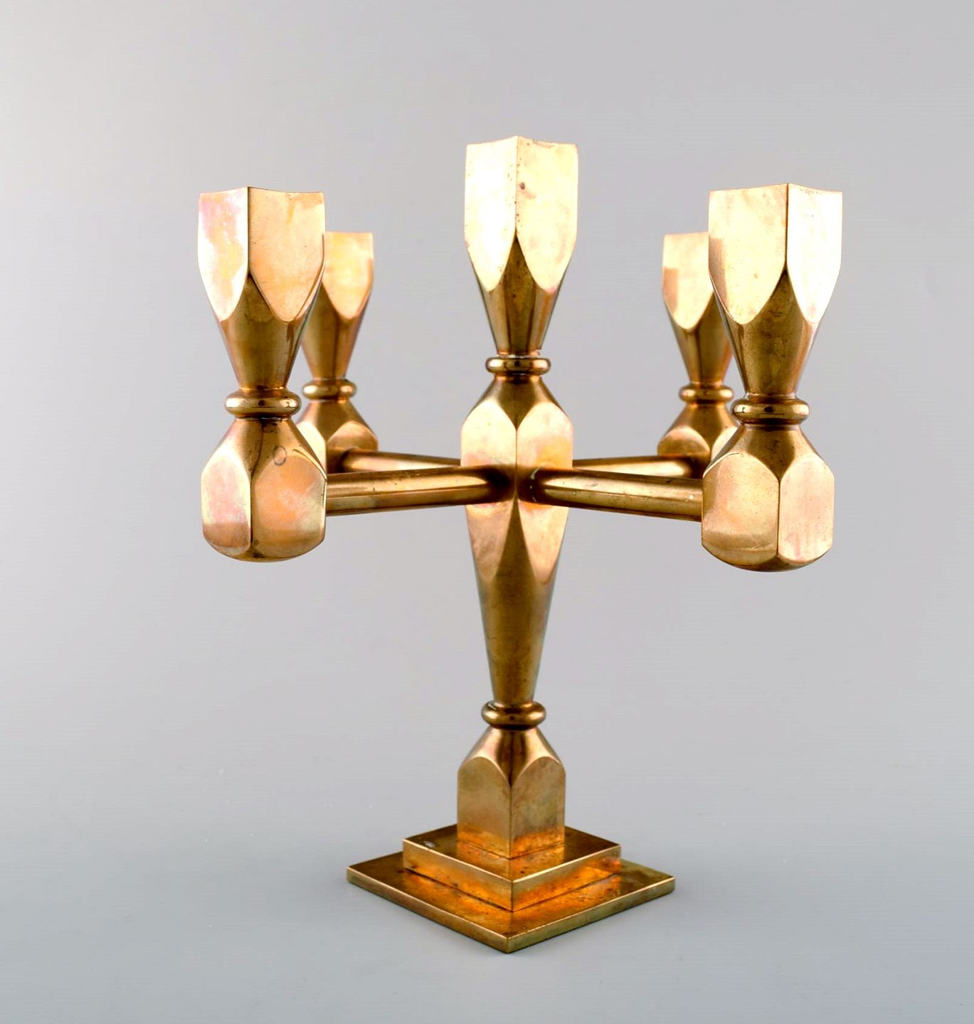 Gusum metal, stage i messing til fem lys. Svensk design. Måler : 23,5 cm. x 22 cm. I perfekt stand.