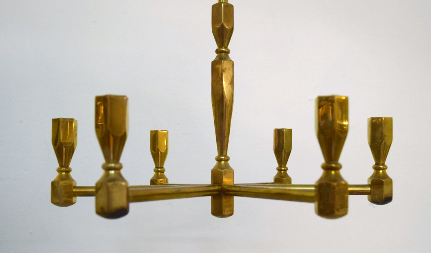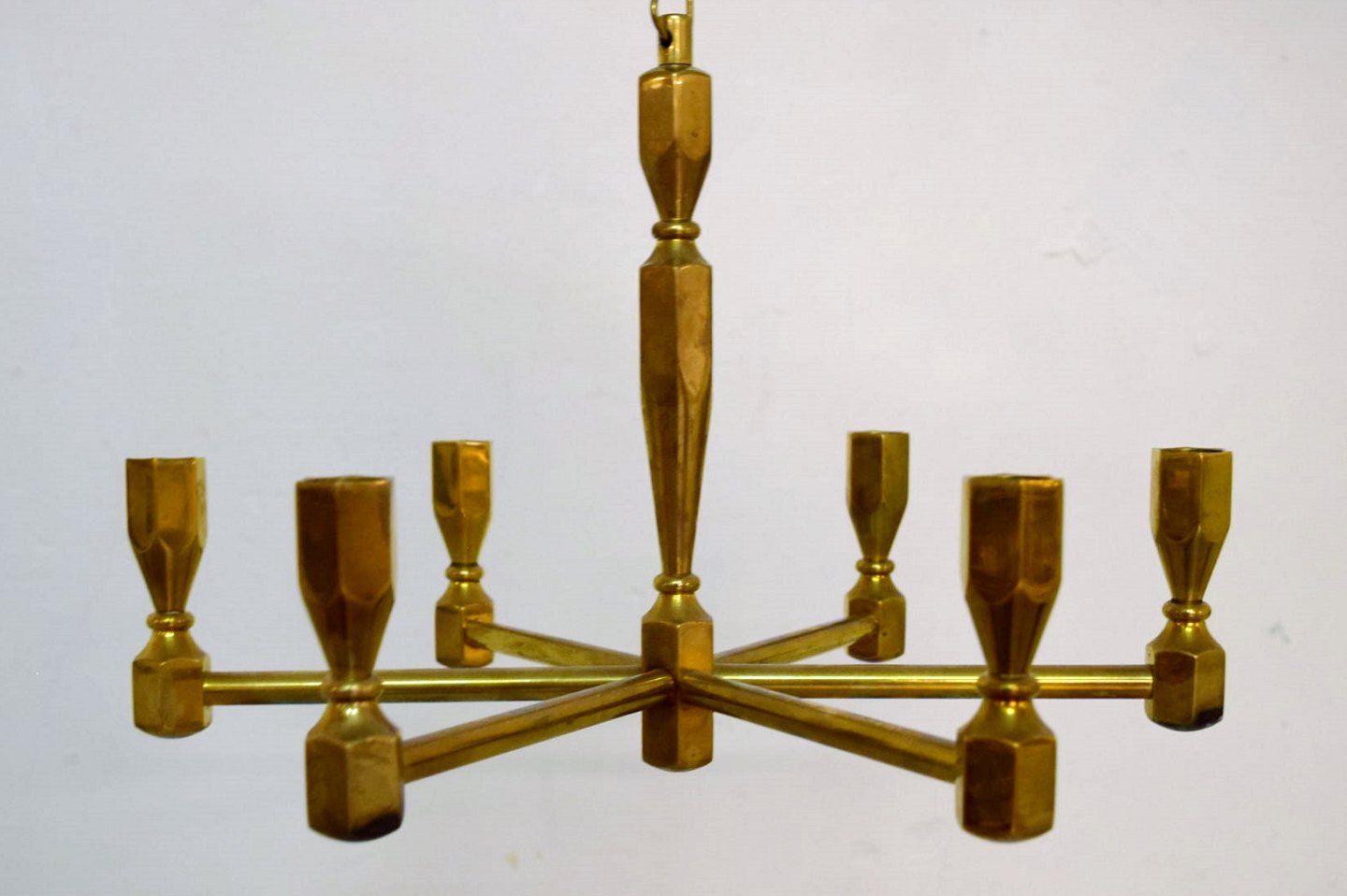 Gusum metal, lysekrone i messing til seks lys. Svensk design. Måler : 37,5 cm. x 24 cm. Højde i alt 116 cm. I perfekt stand.