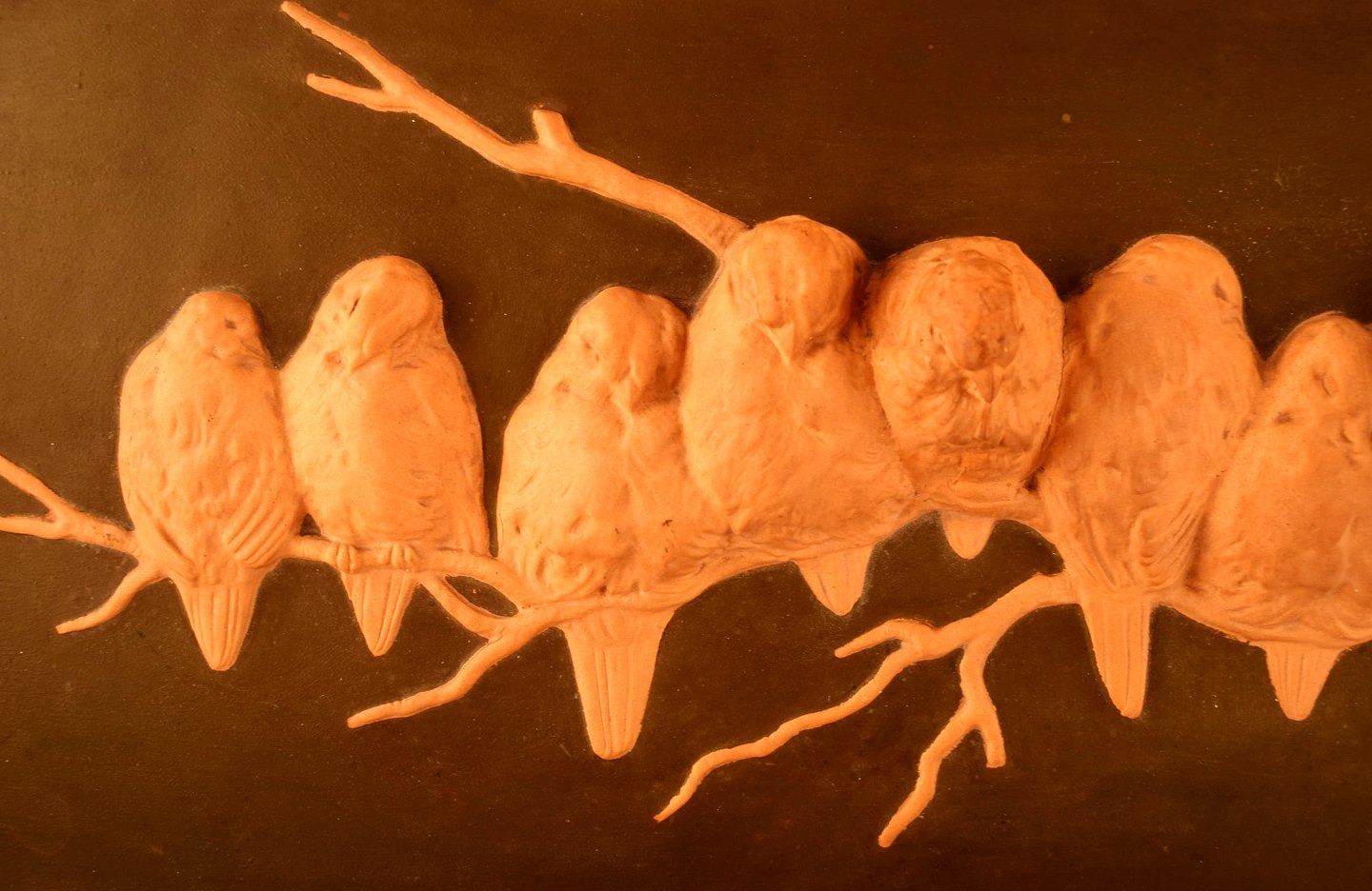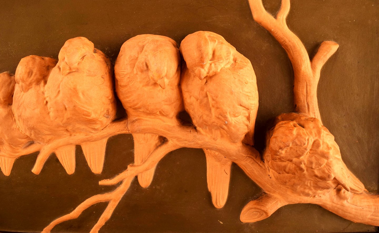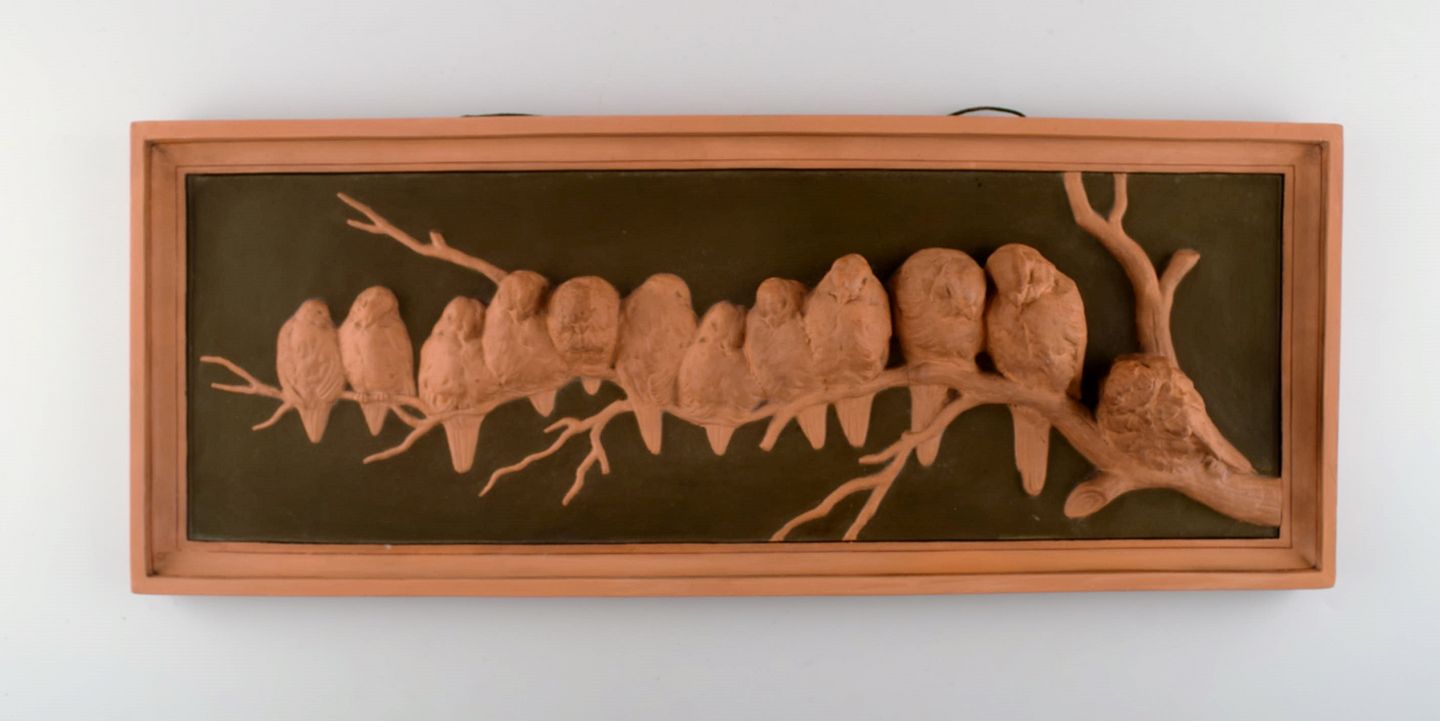 Ipsens, Denmark, large wall plaque with 12 birds on branch in relief, terracotta. Rare wall plaque, 1890 s. Measures 54 cm. x 21 cm. x 2 cm. deep. In perfect condition. Stamped. Model Number 439.