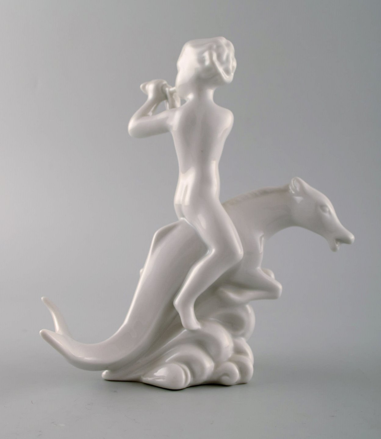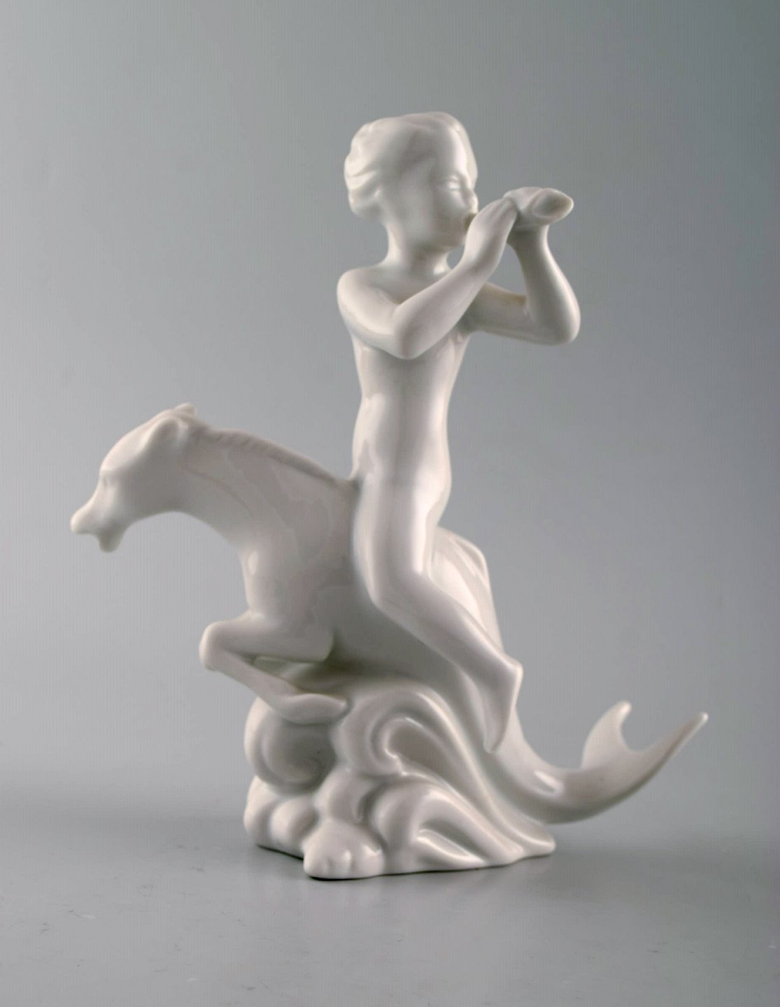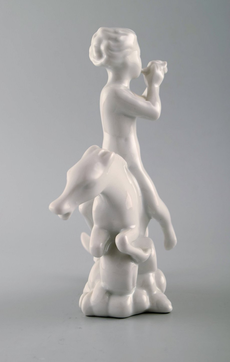 Harald Salomon for Rörstrand, blanc de chine/hvidglaseret figur forestillende faun/panfigur ridende på fabeldyr. Stemplet. I perfekt stand. 1. sortering. Måler : 16 x 17 cm.